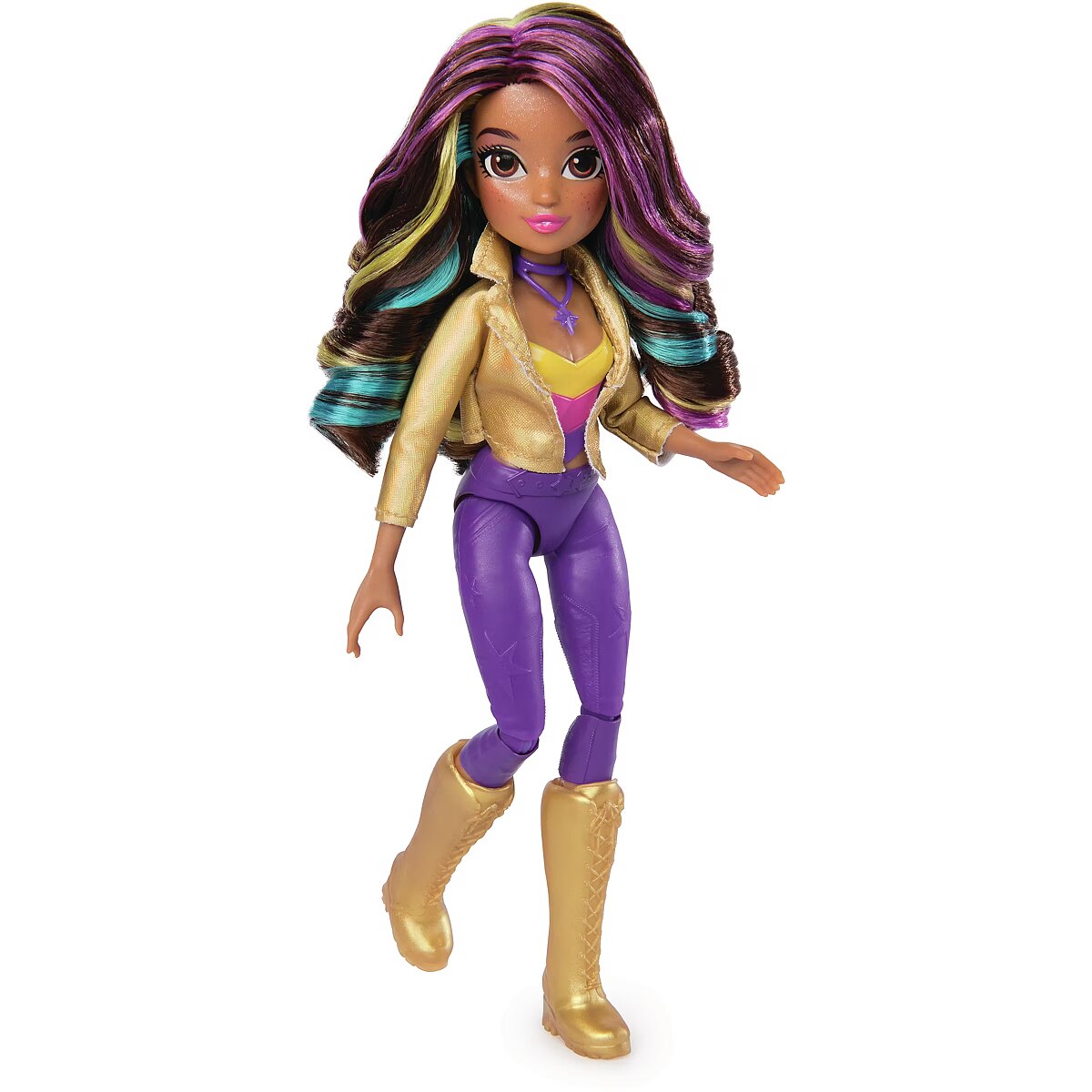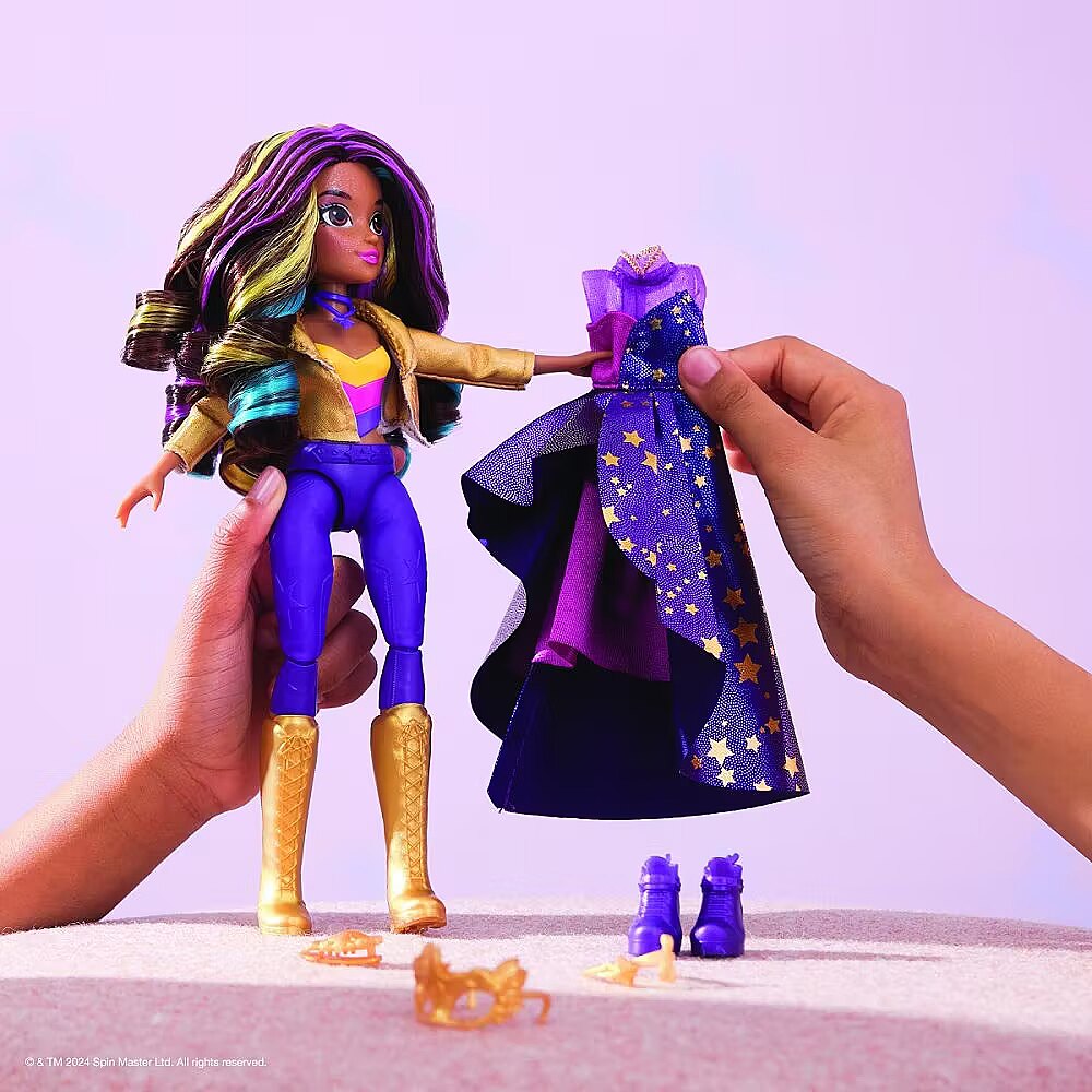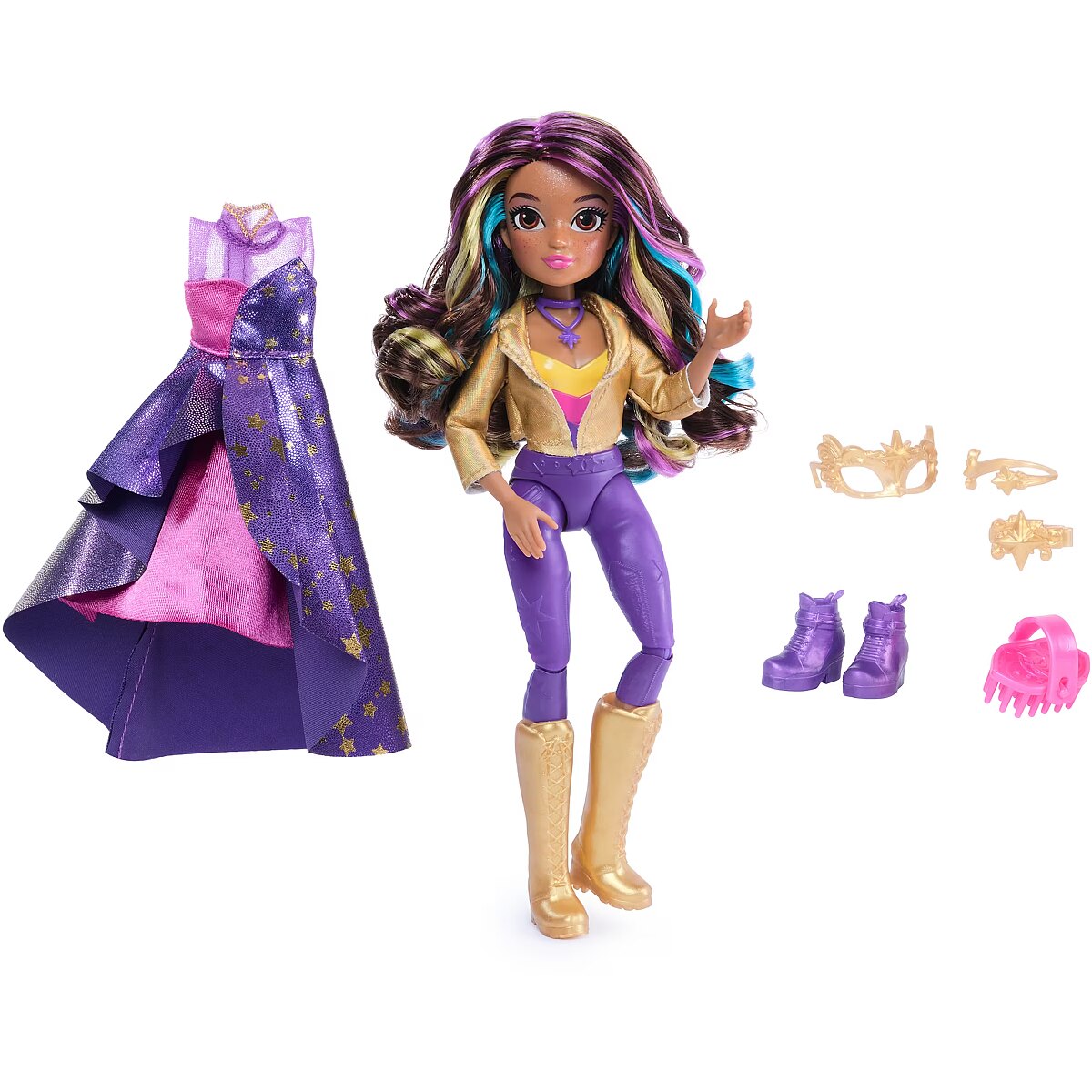 LongDesc - Celebrate the magic of the Fate Faeries at the Unicorn Academy masquerade ball with the Sophia Masquerade doll. Inspired by the NETFLIX animated show and kids books books, this 9.5-inch fashion doll brings Sophia to life. Featuring authentic details and 9 doll accessories, Sophia comes in her riding gear, ready to ride into adventure with her unicorn, Rainbow Light-up Wildstar (sold separately). When it’s time for the ball, switch Sophia from her removable jacket, necklace and boots into her star-print asymmetrical dress, belt, mask, and purple booties. Style her highlighted hair into an updo with the hair tool and hair clip. With 9 points of articulation, pose Sophia as you recreate scenes from the show. For more ways to experience Unicorn Academy with your favorite characters, expand your world with Ava and Isabel dolls and their unicorns, Leaf and River (each sold separately). The magical bonds between Unicorn Academy students and their unicorns will spark endless imaginative storytelling. For kids who enjoy unicorns and horse toys, dolls & accessories, doll house play, collectibles, plush toys and more, Unicorn Academy toys are fun birthday gifts for girls or gifts for any occasion. Bring home the Unicorn Academy deluxe Sophia Masquerade doll.Includes: 1 Doll, 8 Fashion Accessories, 1 Hair Styling Tool