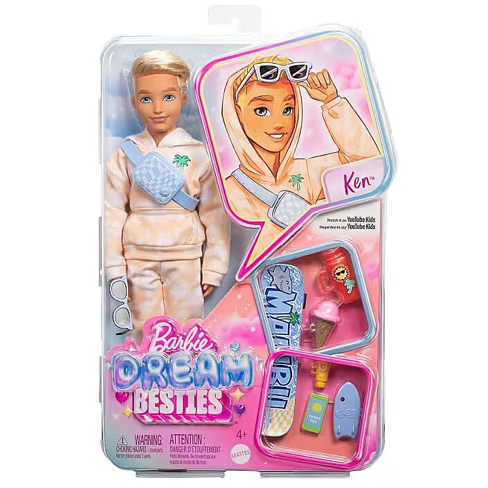 LongDesc - The Barbie Dream Besties dolls encourage kids to share their unique talents with the world, just like Ken! Ken dreams of creating viral videos about the environment and protecting animals help him chase his dreams with 9 different accessories, including his skateboard, sunscreen, water bottle, and phone! The fashion doll also has rooted blonde hair for styling fun. The Barbie Dream Besties dolls inspire kids ages 4 years old and up to live out their dreams. Doll cannot stand alone. Colours and decorations may vary.