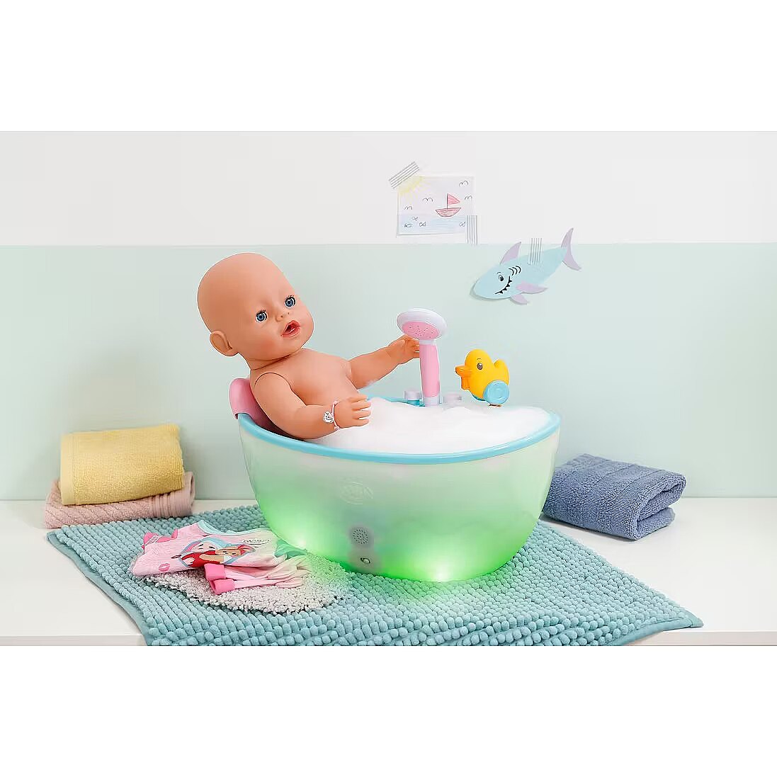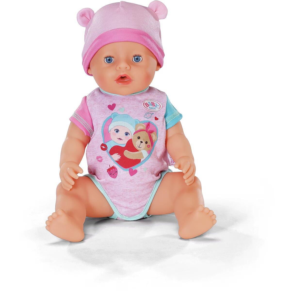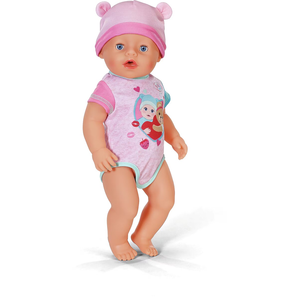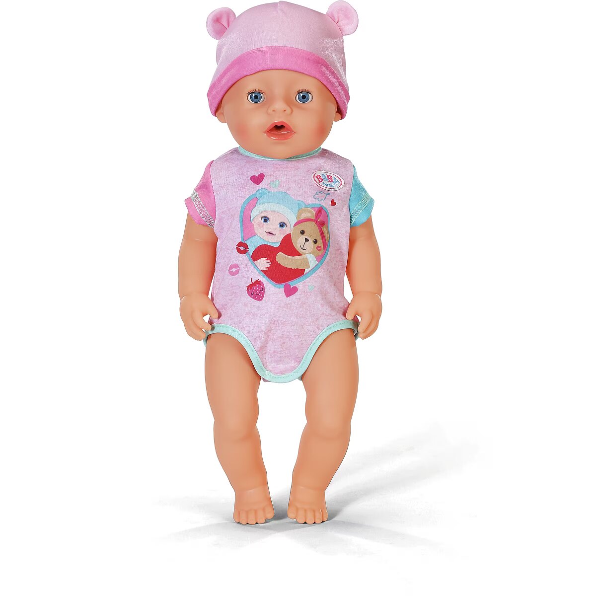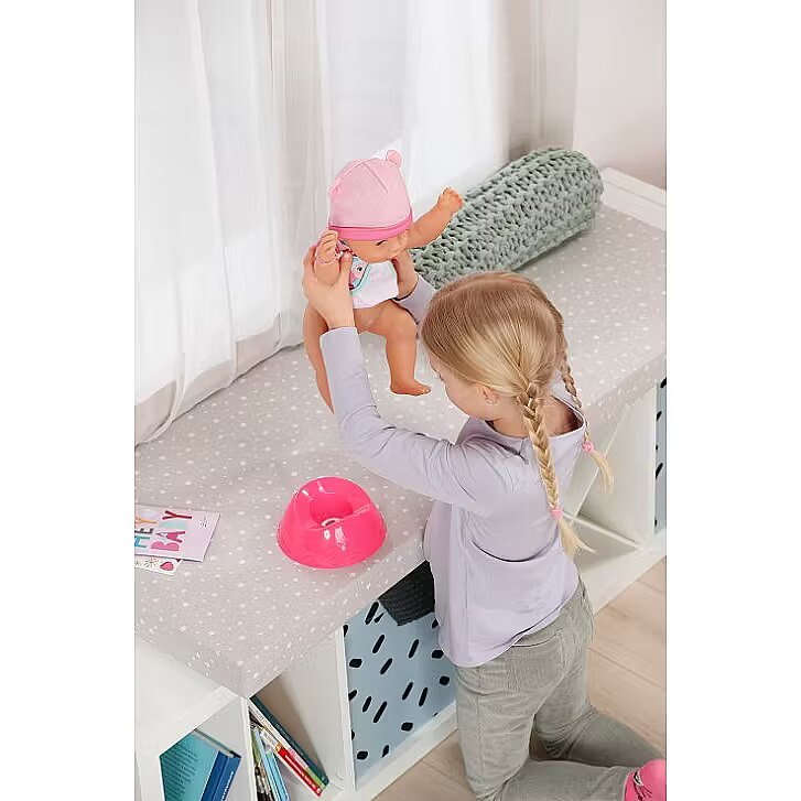LongDesc - Here comes Emma! Already known from the BABY born animation series, which can be seen on YouTube and Toggo, Emma is now also available in her new outfit and with 10 accessories for you at home. She also has her magic plate with her: if you put water on the insert in the plate, the water magic makes delicious dishes appear, making the feeding game even more exciting. If you place her on her potty after playing with food (with water) or drink and press on her tummy, her small and large dishes will also appear there. If Emma drinks water from her bottle, she can even cry and needs to be gently comforted. The magic dummy helps here: if you turn it 180 degrees, her eyes close or open. Turn it again and the opposite happens. If you put her to sleep in her cot, she closes her eyes even without a dummy. But Emma can do even more: she is super manoeuvrable and can even be taken into the bath because she now dries even faster: to clean the doll properly after playtime, the leg can be removed to create a larger opening for cleaning. This makes it much easier for water to drain away. For even more creative play, in addition to her bottle, dummy, plate, spoon, meals and potty, Emma also comes with a nappy, her birth passport and two friendship bracelets - for a long and loving friendship between child and doll.In the usual BABY born quality that has been delighting generations of children since 1991.