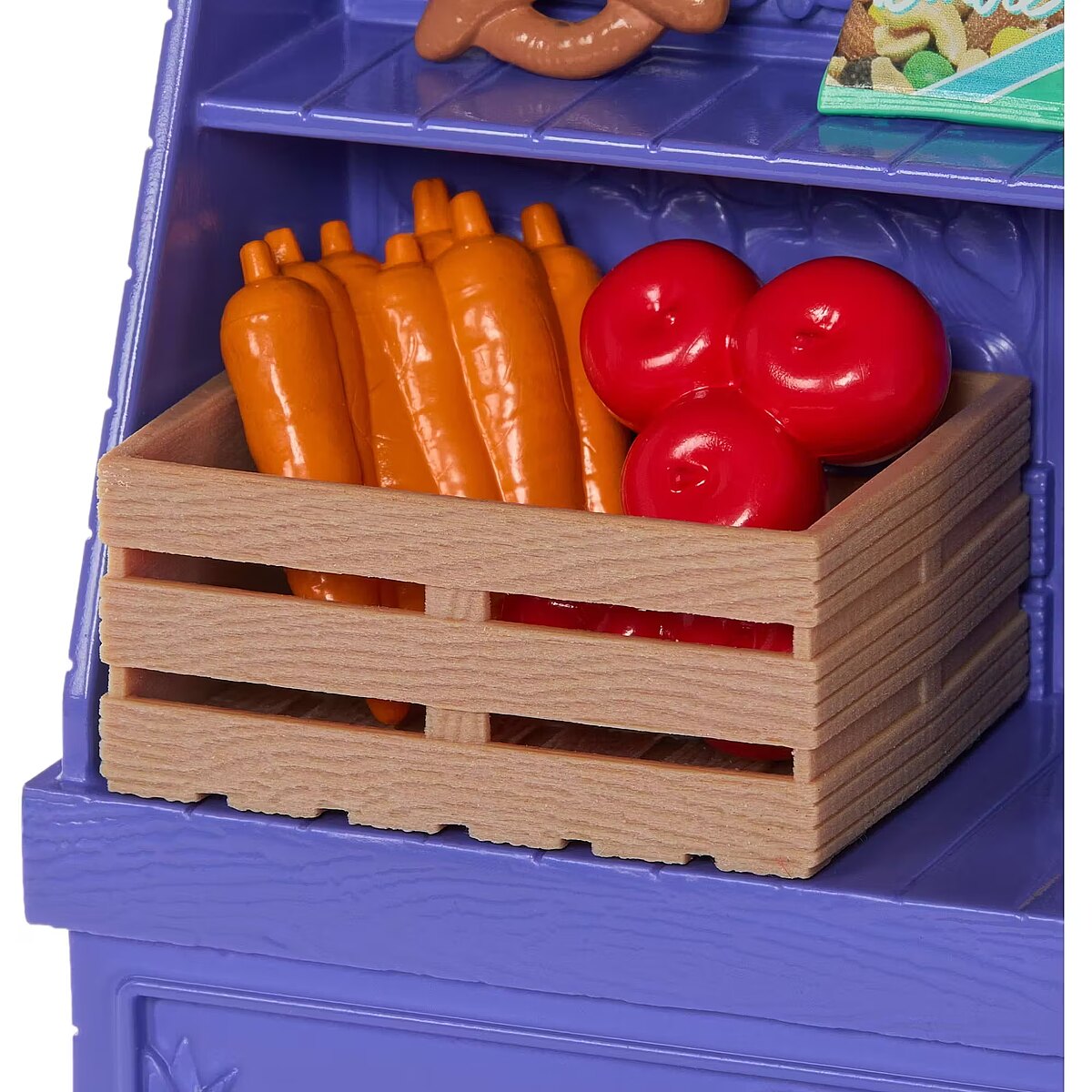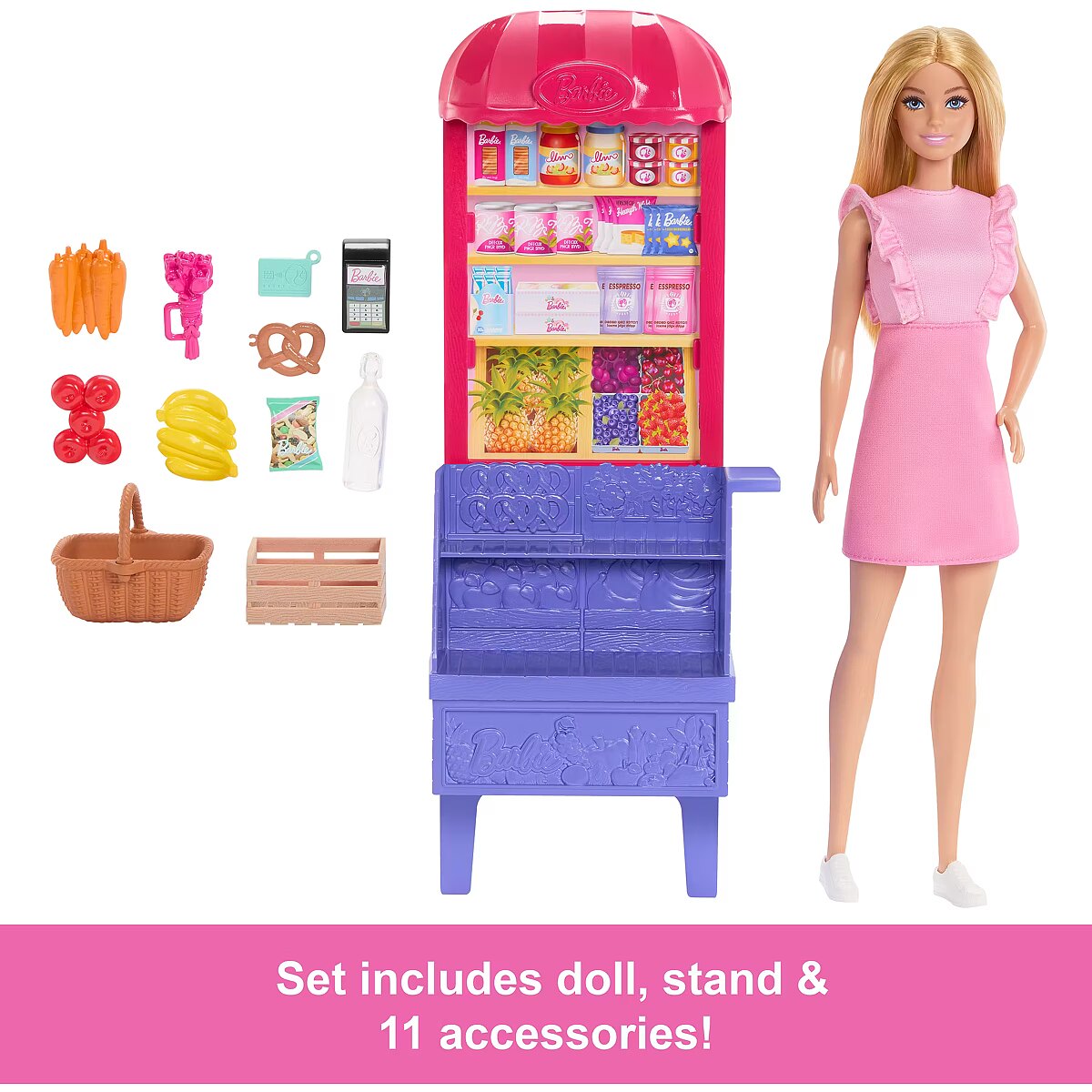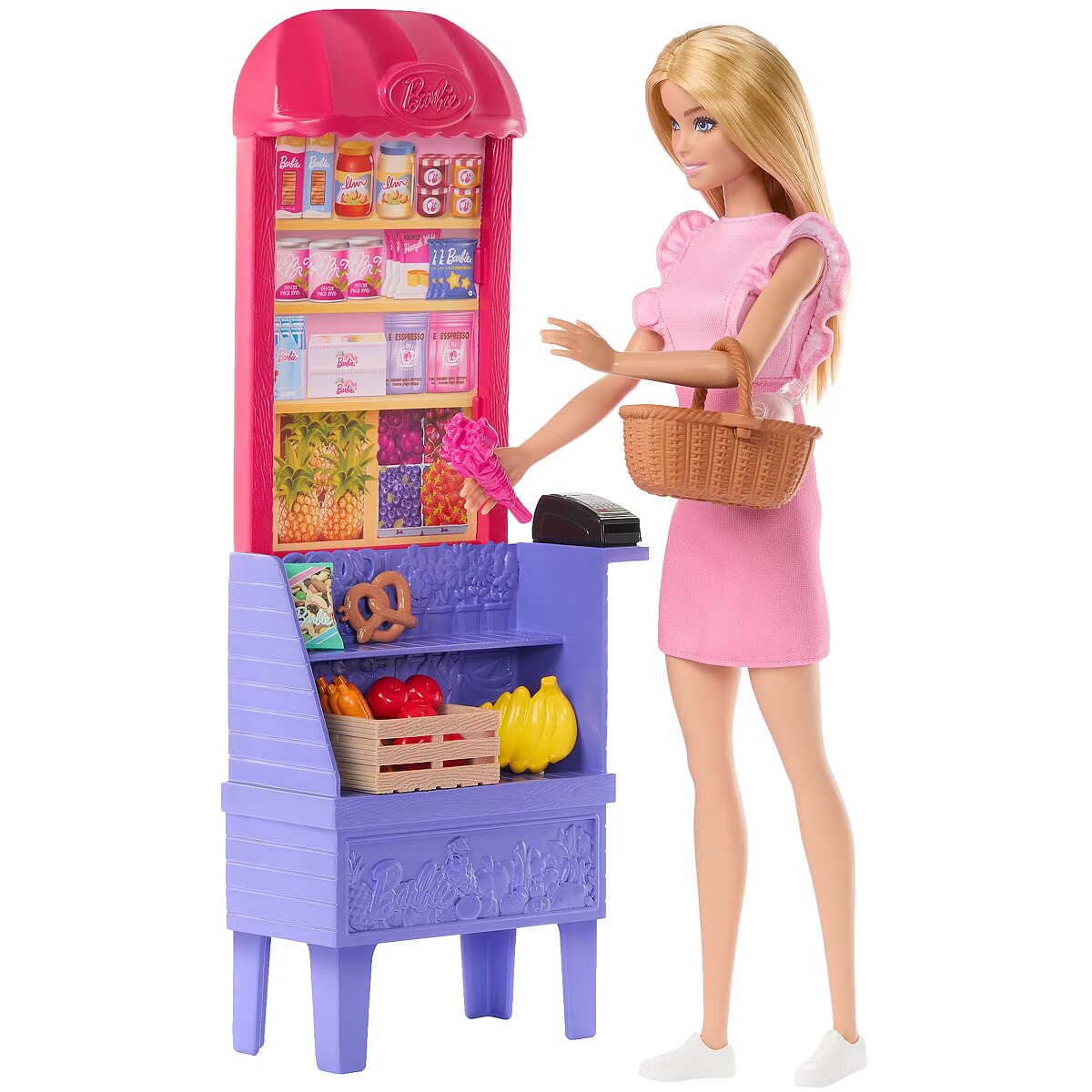 Packaging content - Packaging content - Includes Barbie 'Malibu' fashion doll wearing dress and shoes, market stand, basket, crate, flower bouquet, water bottle, card scanner, card and 5 food pieces. Doll cannot stand alone. Colours and decorations may vary.