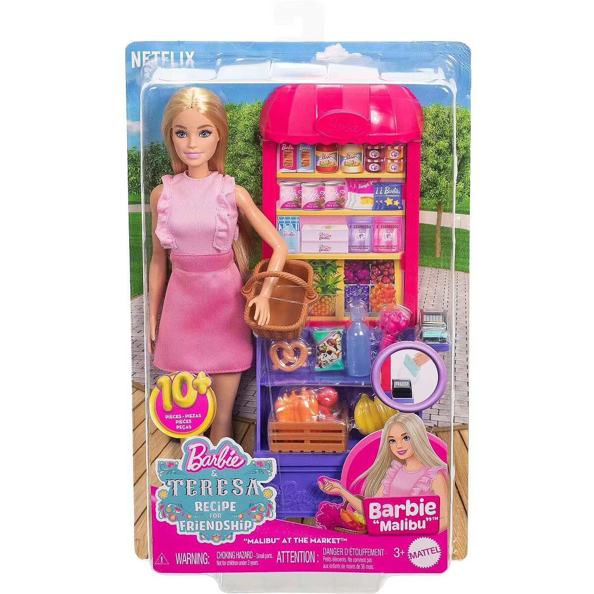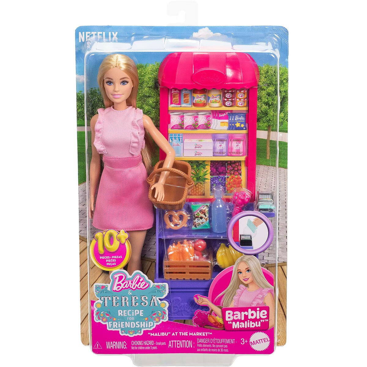 LongDesc - Imaginations can cook up all kinds of stories with the Malibu at the Market doll and playset. Inspired by the movie Barbie and Teresa Recipe for Friendship, the food-themed set lets kids decide what's on the menu. The market stand has a colourful design and shelves to display food and drink. Eleven themed accessories include a shopping basket, produce crate and card scanner for realistic play. Barbie 'Malibu' doll wears a cute pink outfit and sneakers for her trip to the store. Kids and fans ages 3 years and older will love recreating scenes from the movie and making up new recipes for adventure! Doll cannot stand alone. Colours and decorations may vary.