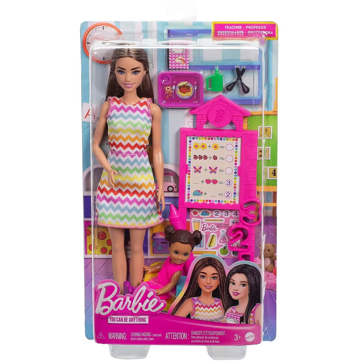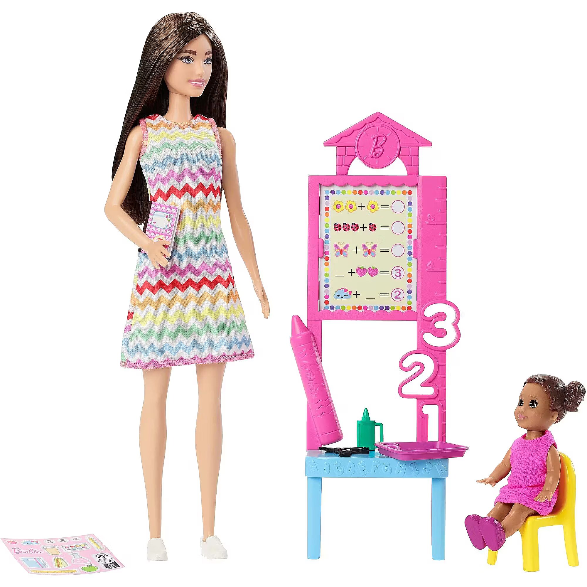 LongDesc - Get ready to learn with the Barbie Teacher fashion doll! Barbie teaches her toddler student in her removable printed dress and shoes. The set includes stickers that you can place on the board to bring the teaching storytelling to life! With other classroom accessories like safety scissors, backpack, and a chair for the toddler student, imaginations can play out a world full of storytelling possibilities and career opportunities with this powerful doll, ready to inspire kids to be anything! Doll cannot stand alone. Colours and decorations may vary.
