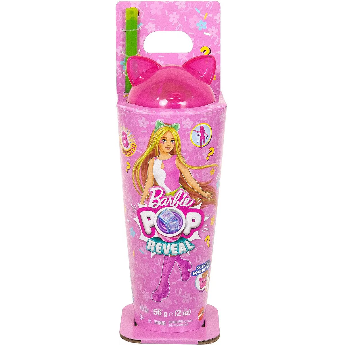 LongDesc - Barbie Pop Reveal Shakes Series dolls offer a sensory opening experience with eight surprises inside a shake-inspired cup! Unscrew the animal ear lid with the shimmery Slime and poke through the film with the straw for squishy fun. Peel the film on the cup to reveal a shake-scented Barbie doll and seven more surprises! Which doll will you reveal? There's a Sweet Unicorn, Cute Kitten or Bright Bunny. Continue opening to discover two reusable ice cubes that pop open to reveal a skirt or pair of shorts and a pair of shoes or boots. Mystery bags reveal a squishy, scented matching pet, a pet bed and an animal ear headband! Discover more wow with a colour-change transformation on Barbie doll's face. Kids will want to collect them all! Each doll sold separately, subject to availability. Dolls cannot stand alone. Colours and decorations may vary.
