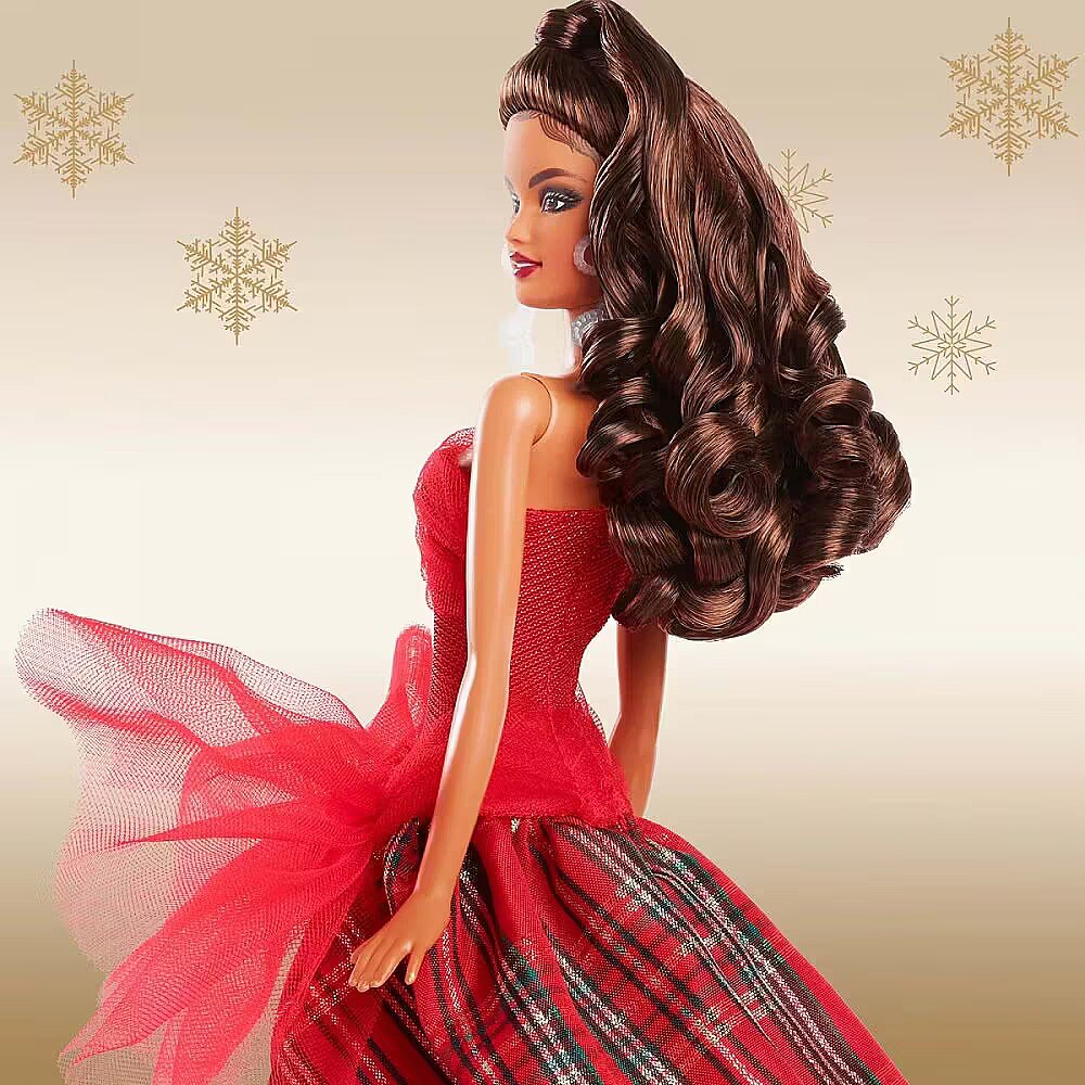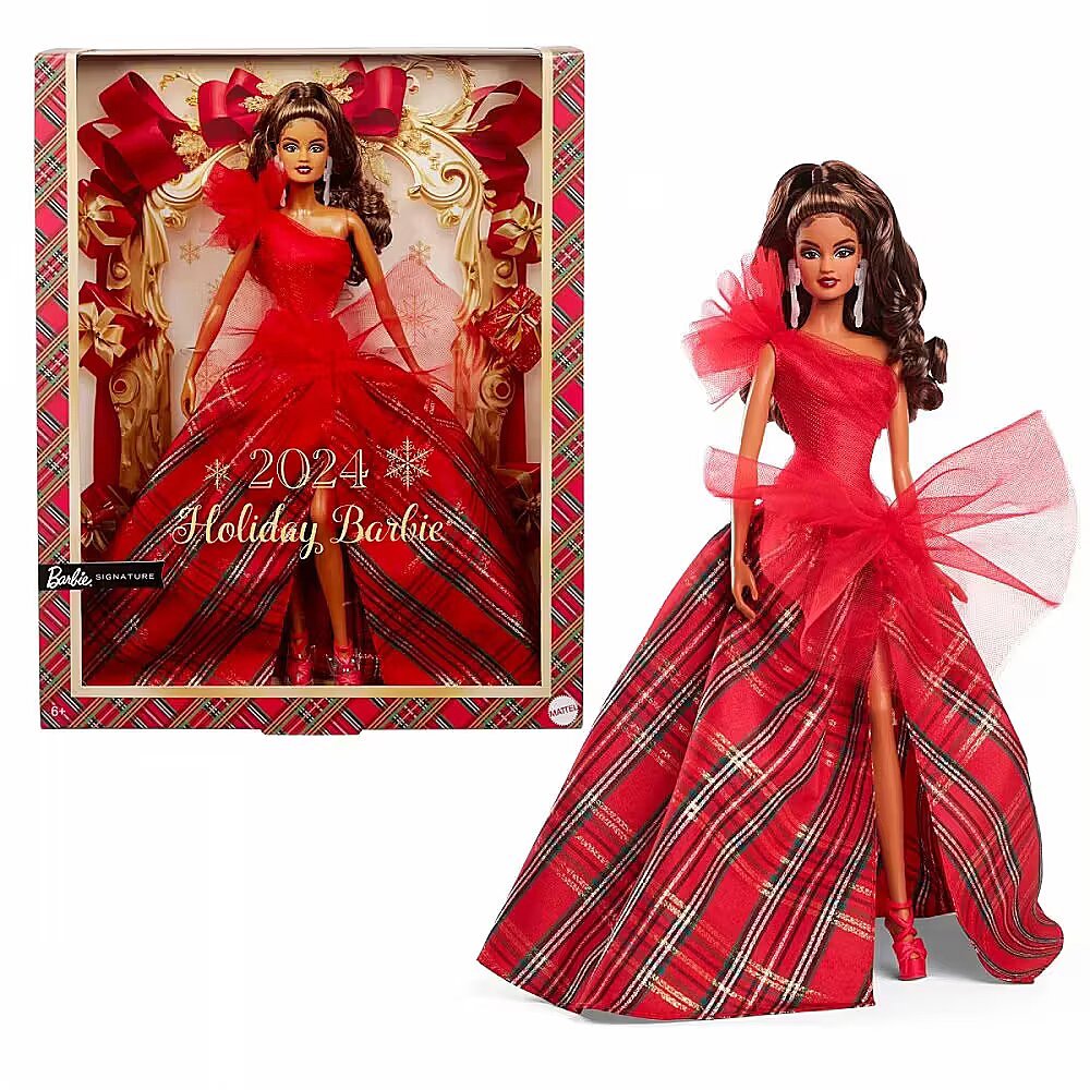 Description - Barbie Signature 2024 Barbie Holiday Doll The 2024 Barbie Holiday Doll embodies the warmth and love of the season with a festive gown for a glamorous celebration. Showcasing gorgeous drama, the dress pairs a draping, one-shoulder, sparkling red bodice with a full, plaid ballgown-style skirt. Big tulle accents offer a modern take on a classic look, while statement earrings add to the elegance. In packaging that's ideal for display, this collectible doll makes a great gift for anyone looking to build a collection or brighten up their seasonal decorations.