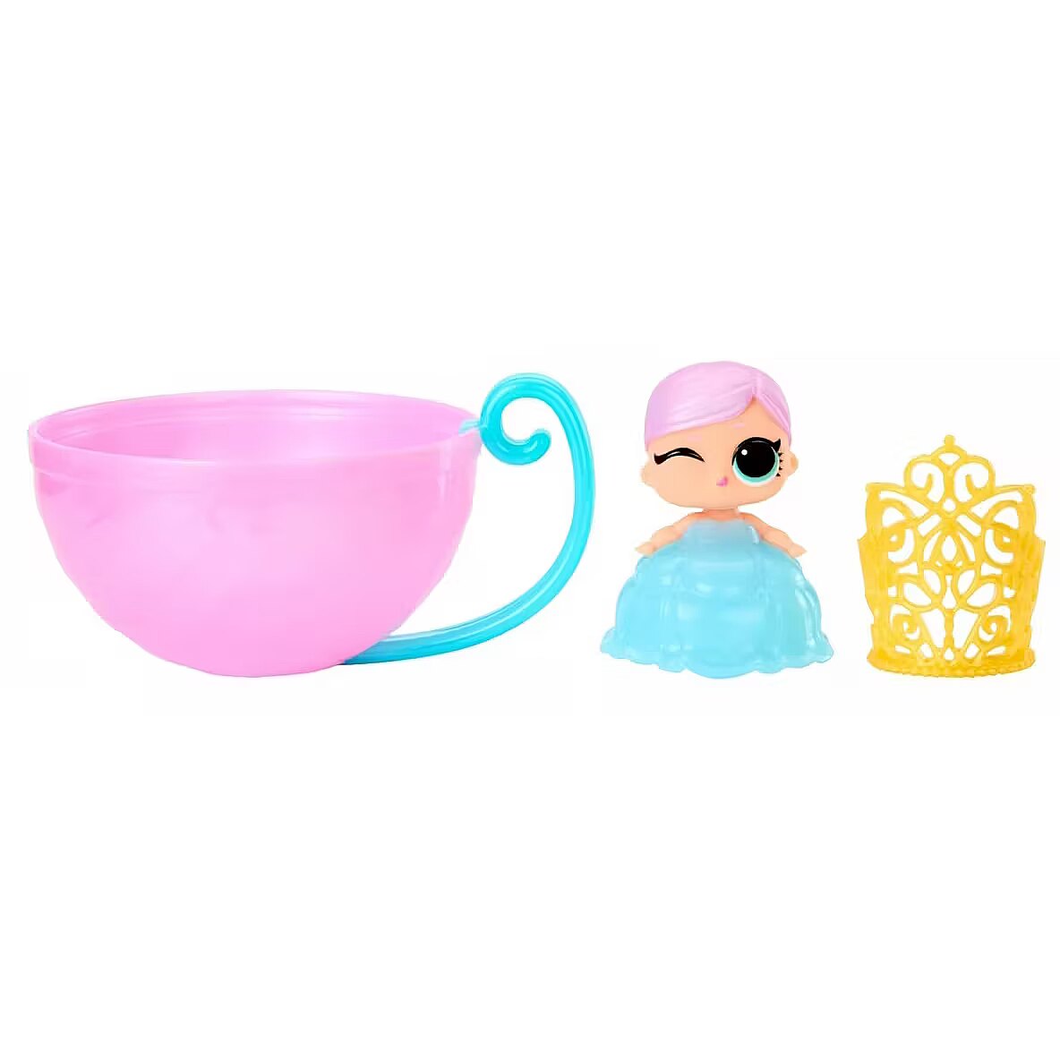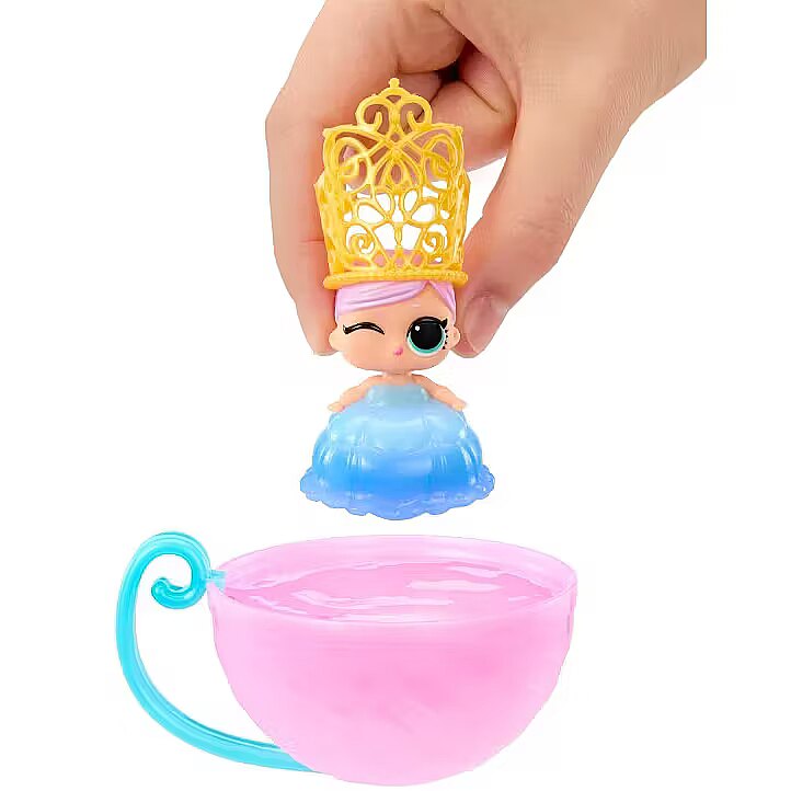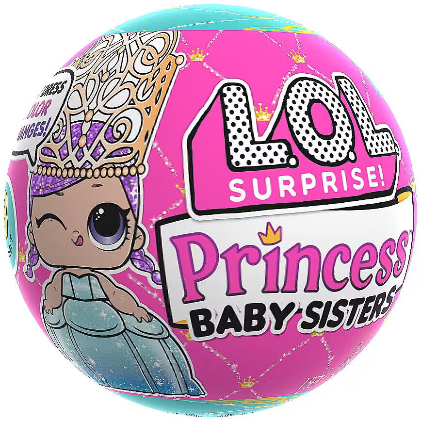 LongDesc - Prepare for an enchanting color change surprise with the L.O.L. Surprise Princess Baby Sisters dolls! Baby Sisters! Unbox multiple surprises including a bag with your doll hidden inside, accessories, and more! Place the bag into water and watch the magic unfold as the outer wrapping dissolves to reveal your beautiful Baby Sister doll and her adorable, sparkly princess dress! Once your doll is revealed, dip her dress on into cold water and discover a color change surprise! Collect them all!