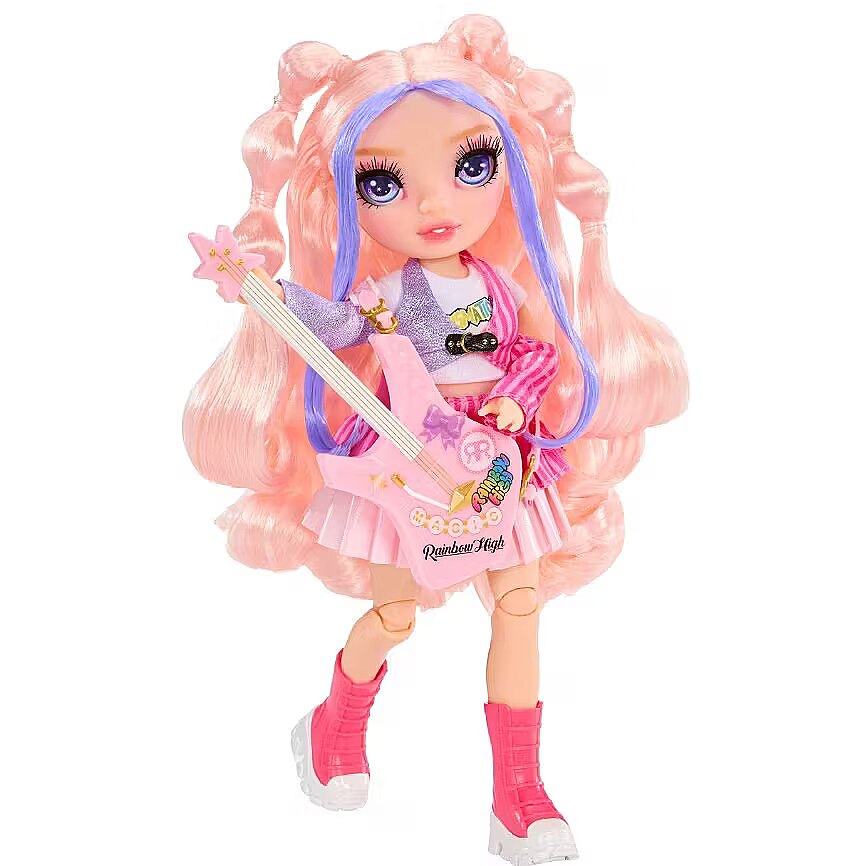 Description - Our best-selling Jr. High dolls are now featured in a NEW, fun, and energetic Rock Band theme. The dolls come with childrens favorite instruments (guitar, microphone, etc.) and inspire many forms of play: singing together, band rehearsals, and creating your own stories. Creative play possibilities are endless with these younger versions of the beloved Rainbow High dolls. 4 new Jr. High fashion dolls in the Rock Band theme Adorable new outfits + play accessories (guitar, microphone with amplifier, and more) Hair styled for combing and play 9-inch dolls with fully articulated joints New, younger-looking faces