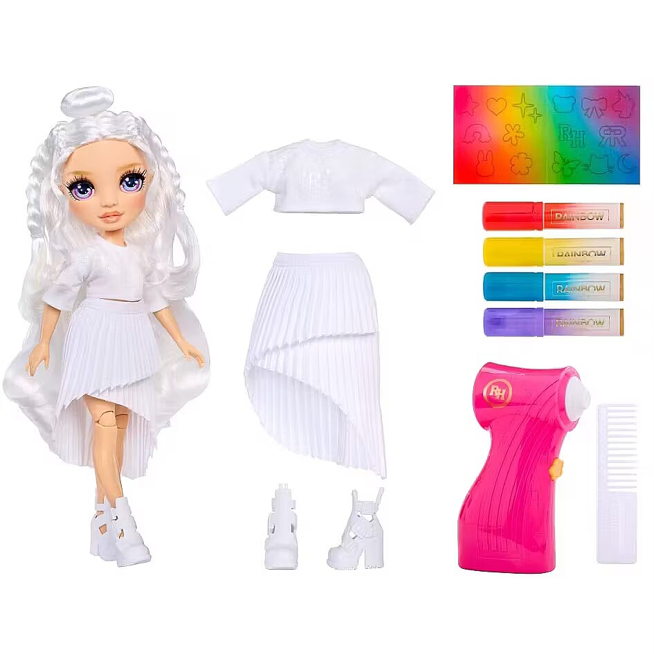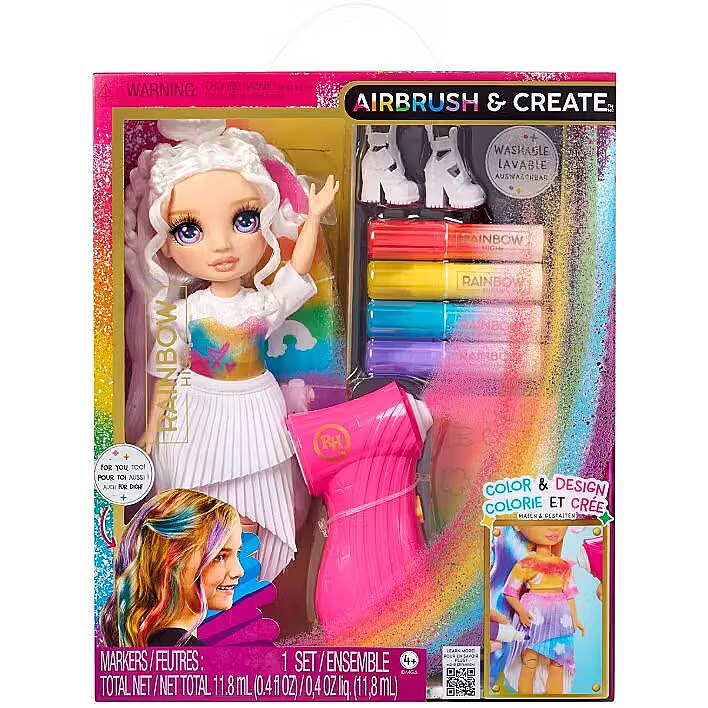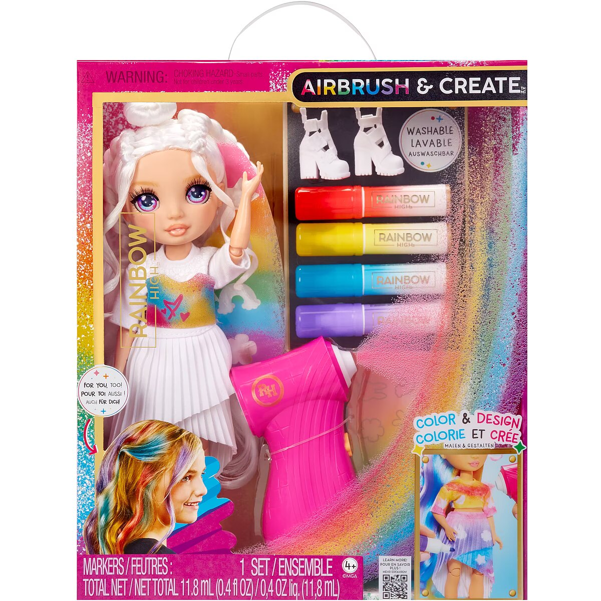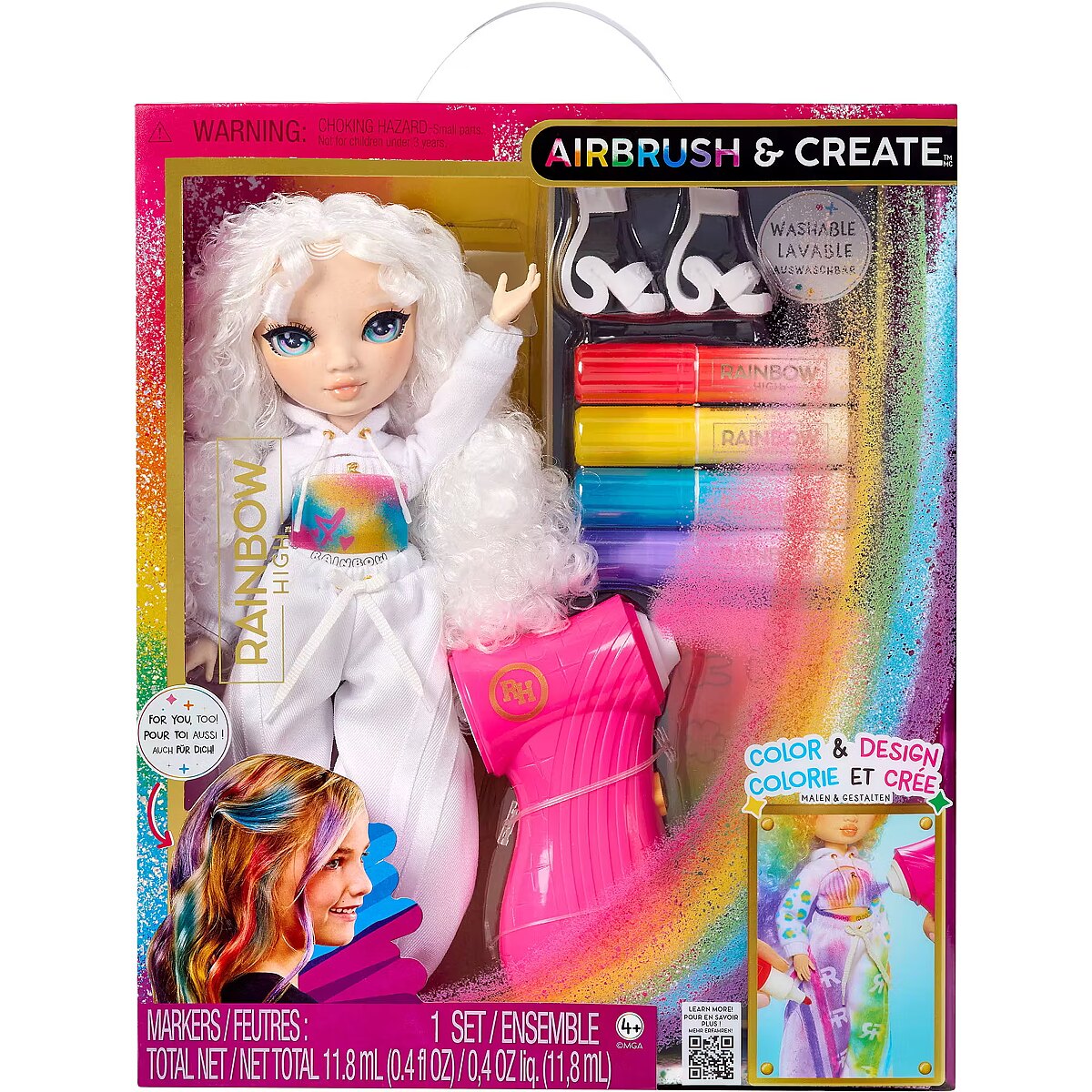 LongDesc - Rainbow High’s mission is to spark colorful creative confidence. ——and now, you can bring your own vision to life with the all-new Airbrush & Create DIY fashion doll! Designing your custom Rainbow High doll has never been easier. It comes with an AIR BRUSH KIT, including Air Brush, washable rainbow markers, fully dressed Fashion Doll dressed in all white with white hair. Simply insert a rainbow washable marker into the airbrush, spray, and watch the magic unfold! Color the hair, outfits, and even the shoes. Want more precision? Use the marker directly on the outfit for detailed designs. Rinse & Repeat. Then design it over and over again. Once you’re finished creating, the doll is ready for endless play.Collect Them All. 3 dolls with distinct fashions, hairstyles and eye color (green, grey and purple). When it comes to creativity, the possibilities are endless.