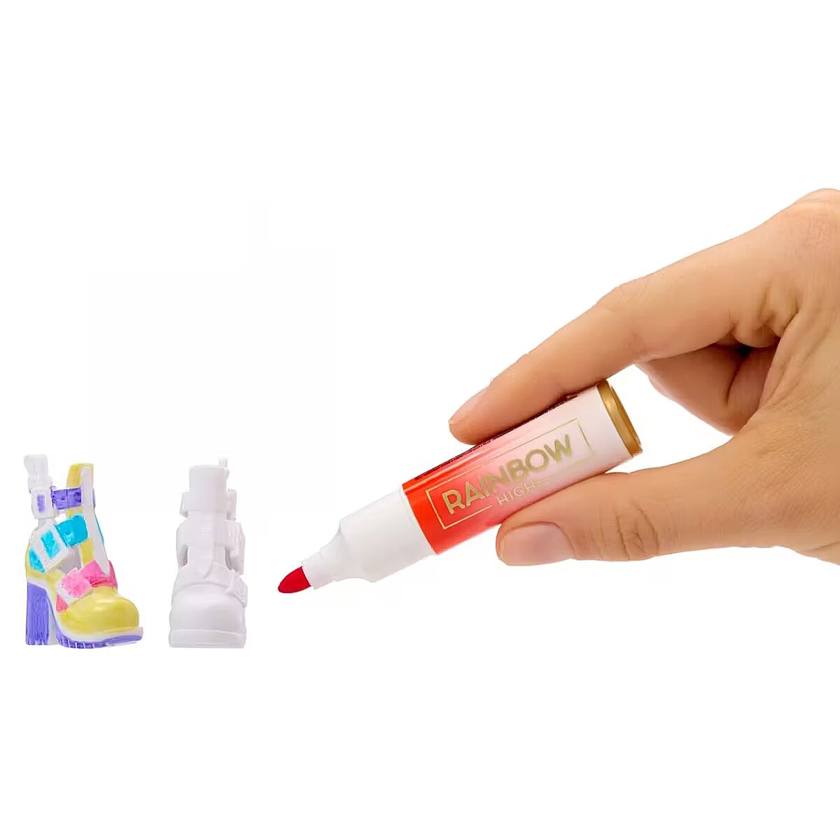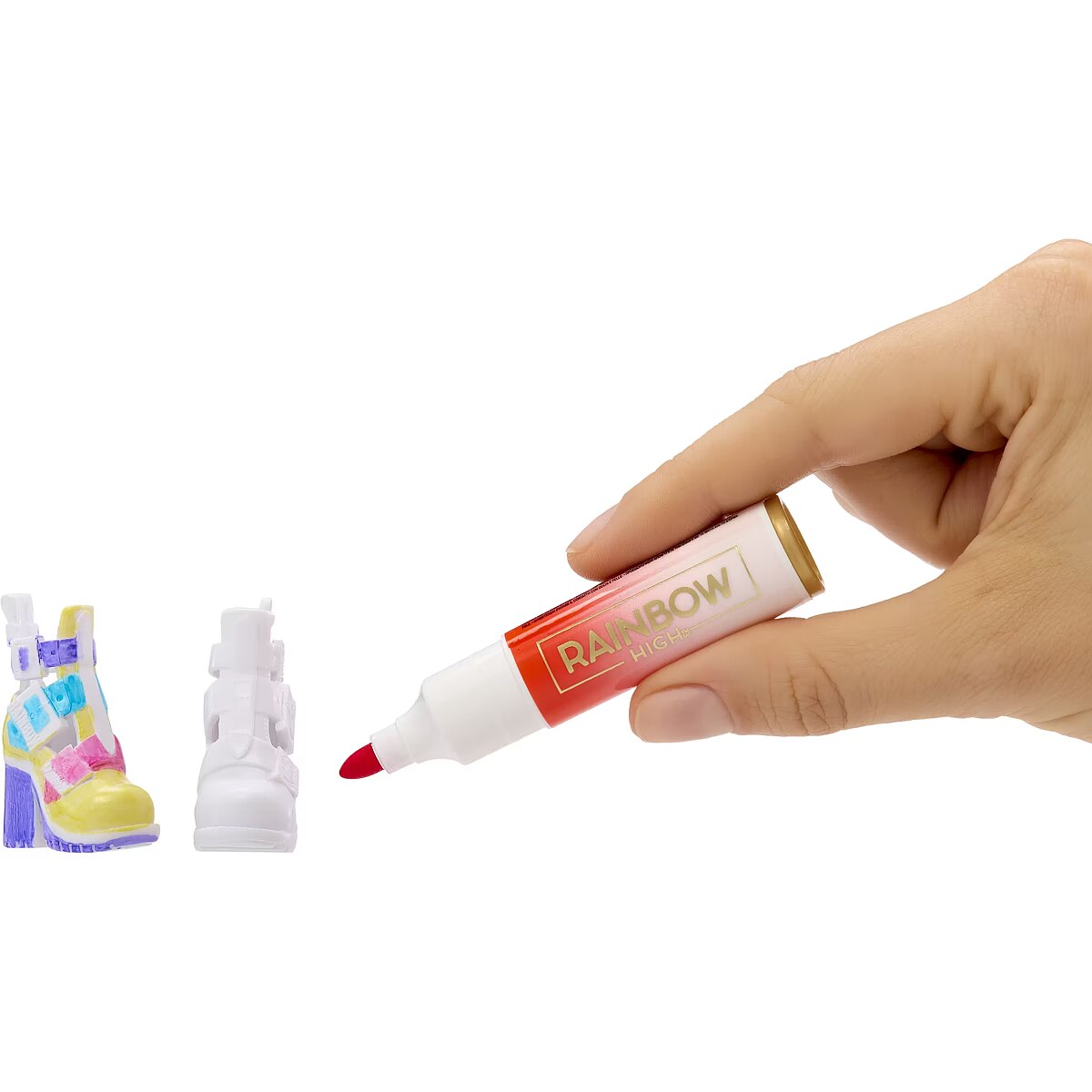Description - W Rainbow High naszą misją jest rozbudzanie kreatywnej pewności siebie. Przedstawiamy nowy sposób kolorowania naszej zmywalnej lalki DIY teraz z techniką AIRBRUSH i markerami, w ramach serii Color & Create Fashion Dolls. Każda lalka jest ubrana całkowicie na biało od stóp do głów dzięki czemu łatwo ją kolorować i przekształcać wielokrotnie! 3 nowe zmywalne lalki modowe Ubrane całkowicie na biało, aby można je było wielokrotnie kolorować i projektować Długie, białe, przystosowane do czesania włosy, które można dowolnie kolorować Możliwość kolorowania NOWYM narzędziem Airbrush Dołączone 4 markery do samodzielnego projektowania Dodatkowa koszulka do wielokrotnego kolorowania 11-calowa lalka z 5 ruchomymi punktami