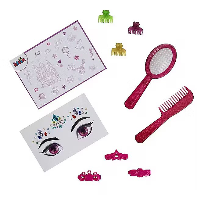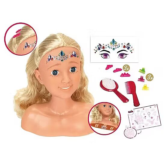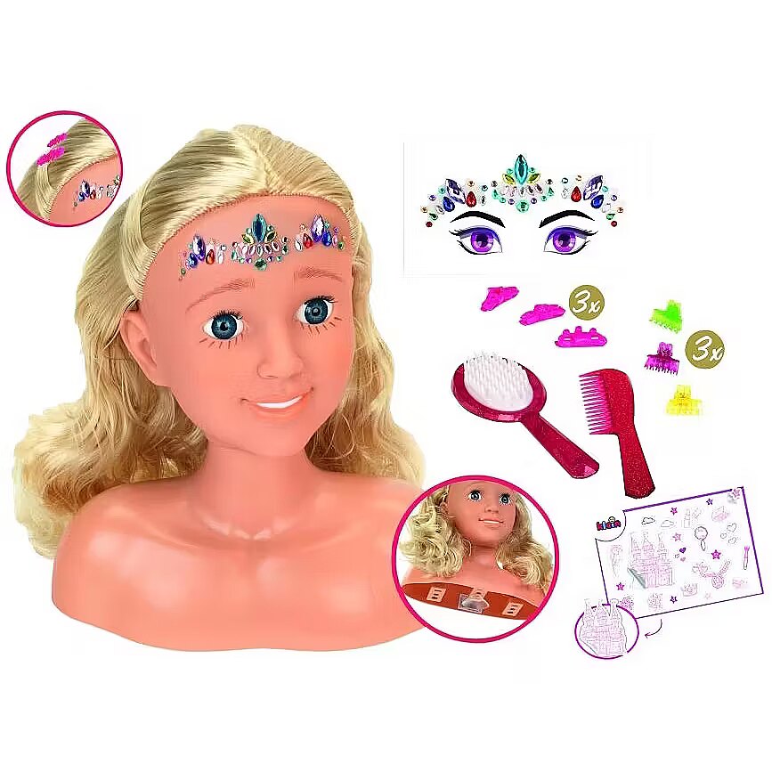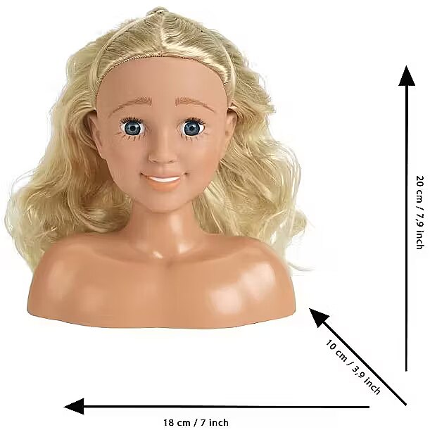 Description - Klein 5205 Głowa do makijażu i fryzjerstwa Nie tylko dla fanek księżniczek! Fanki fryzur i makijażu również pokochają tę śliczną głowę i wszystko, co się z nią wiąże. W końcu nie tylko wszystkie akcesoria wyglądają jak w prawdziwym salonie piękności, ale można je również wykorzystać do stworzenia praktycznie każdego makijażu. Oprócz kreatywności i sprawności motorycznej, ta zabawka ćwiczy również pewność siebie i poczucie własnego stylu.Z miłością zaprojektowane akcesoria obejmują trzy spinki do włosów, grzebień, szczotkę, arkusz naklejek oraz kosmetyczne serce z kosmetykami testowanymi dermatologicznie. Włosy i twarz księżniczki można myć wielokrotnie. To nie tylko świetna zabawa dla dzieci, ale także przyjemność z ciągłego wypróbowywania nowych kreacji i strojów. Wszystko, czego potrzebują początkujące królowe piękności i wizażyści.
