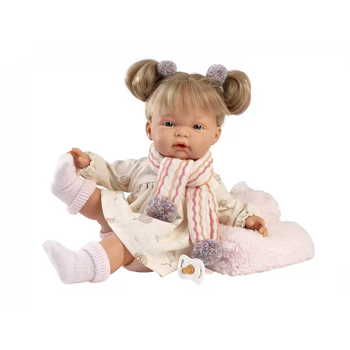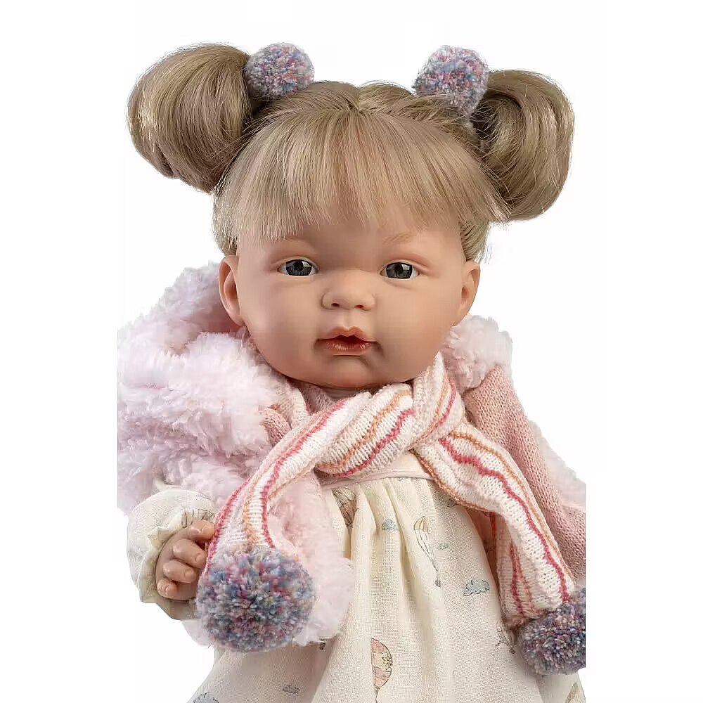 Description - Llorens 38362 Crying Doll 38 cm - Joelle Handmade Llorens dolls are crafted with meticulous attention to detail. Delicately highlighted features, shading, beautiful eyelashes, and expressive eyes. Made from the highest quality materials, each doll comes to life and gains character in the hands of its creator. Their outfits are made from organic cotton, wool, and recycled materials. This makes it the perfect gift for your child, combining both educational and playful value. Handmade in Spain with love. Name: Joelle Height: 38 cm Materials: Cotton body, vinyl arms, legs, and head Includes: Six-piece outfit and pacifier Features: Cries when pacifier is removed Batteries included: LR-44
