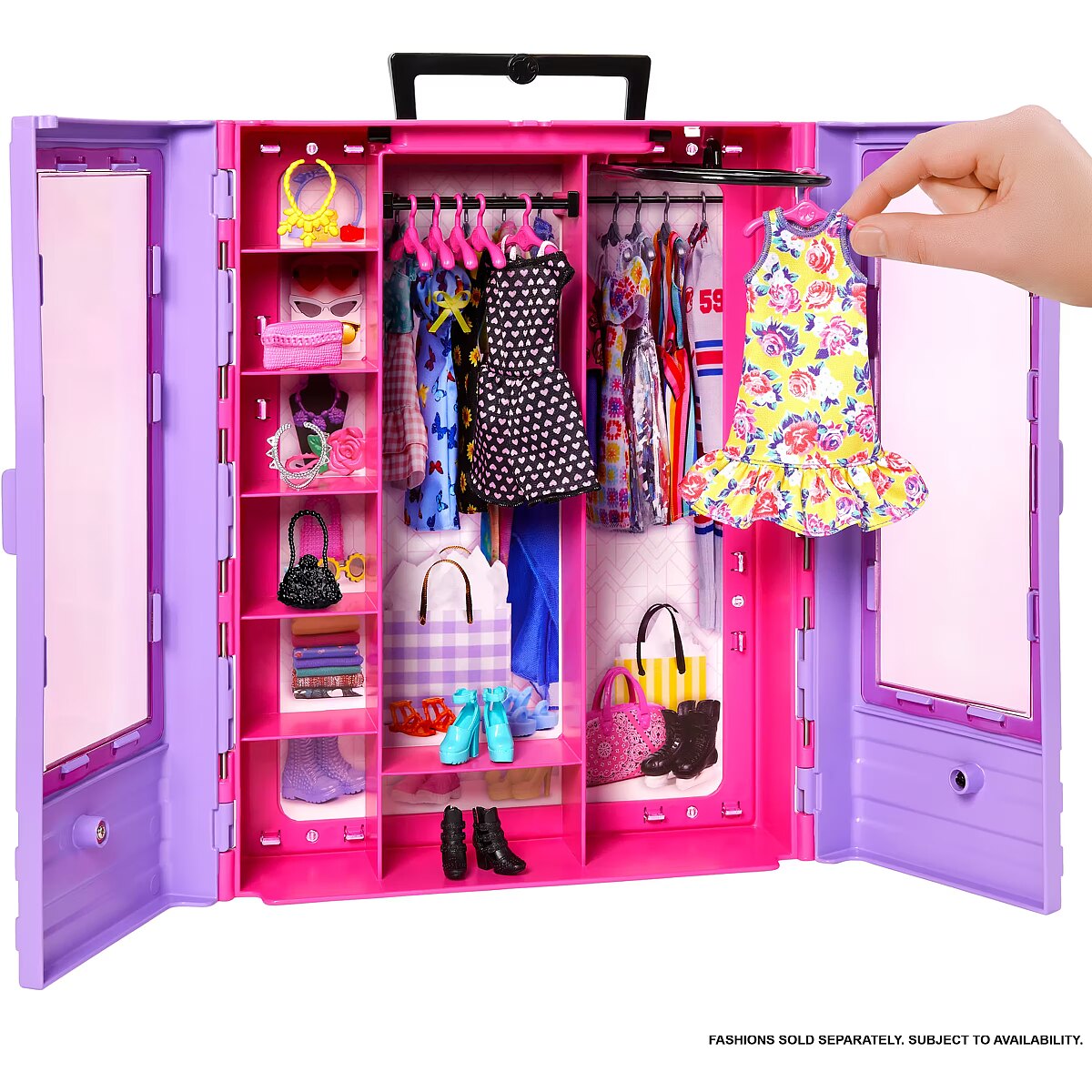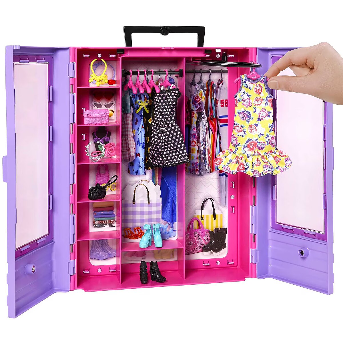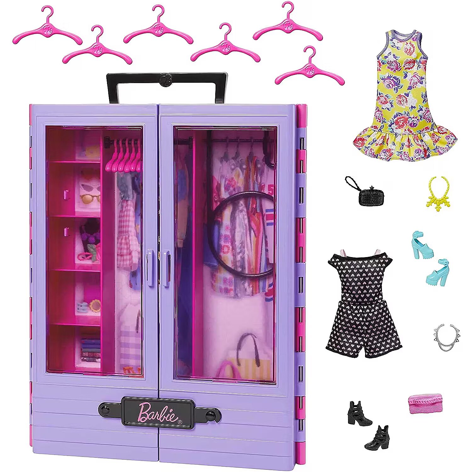 LongDesc - Pack Barbie style and storytelling fun on the go with the Barbie Closet, designed for portability with a carrying handle! The purple closet's translucent doors swing open to reveal a pink interior with racks and storage. Use the fold-out rack to assemble outfits. Six included hangers help keep fashions organized and tidy, and lots of shelf space is perfect for accessories (not included). There's also room for a fashion doll (not included). The easy carrying handle keeps the portable closet ready to travel, anywhere, for any occasion. Suitable for kids 3 years old and up. Colours and decorations may vary.