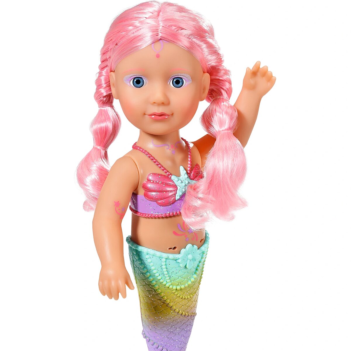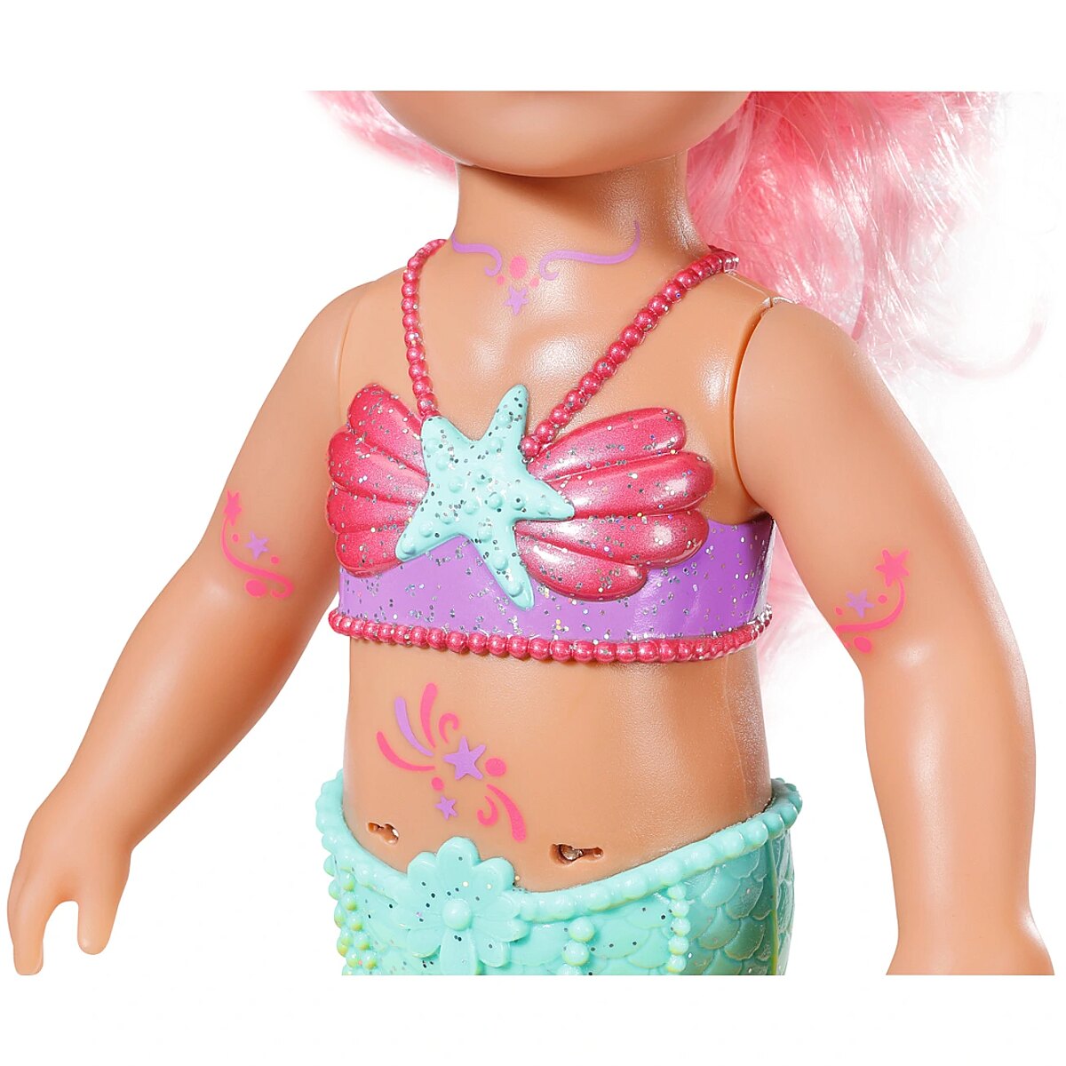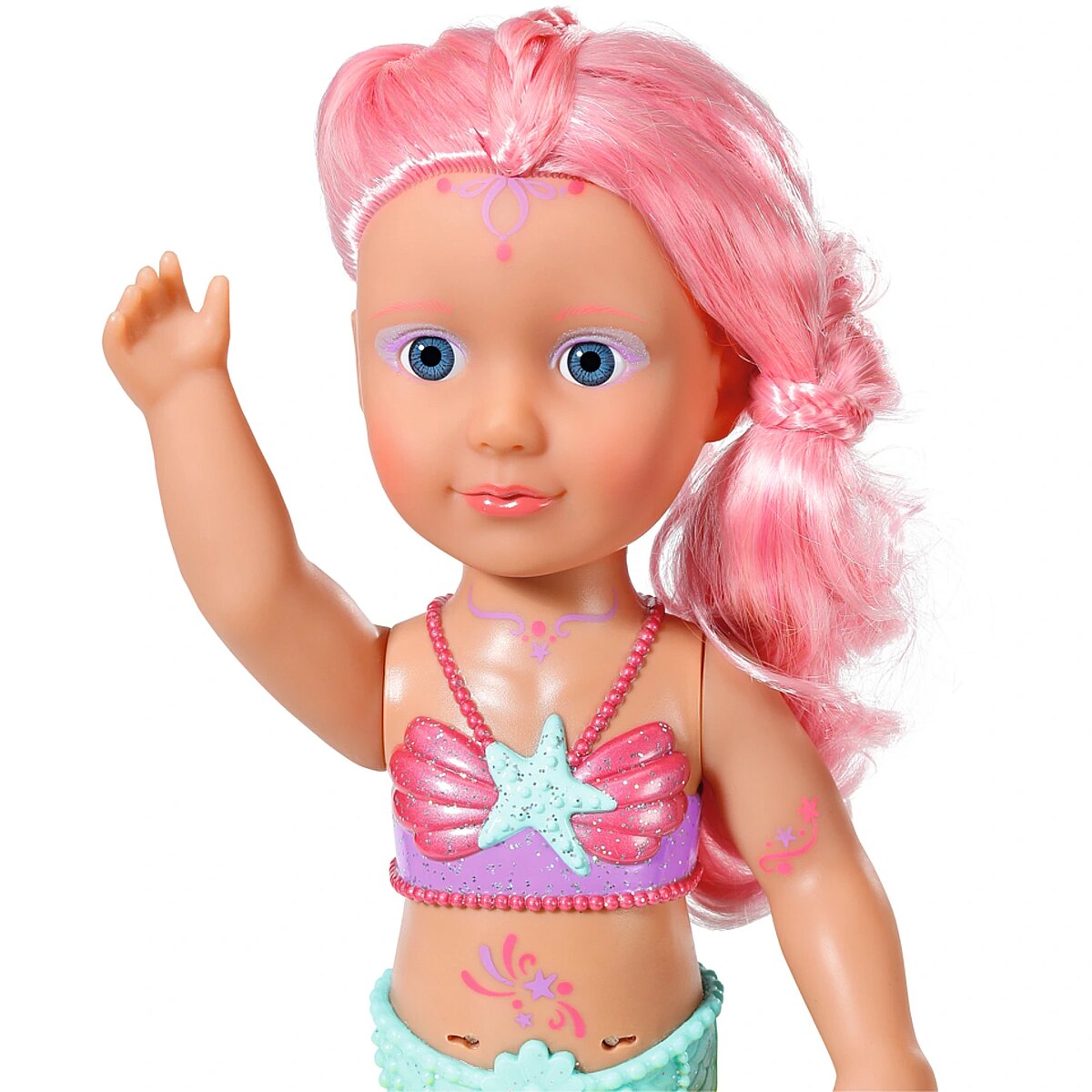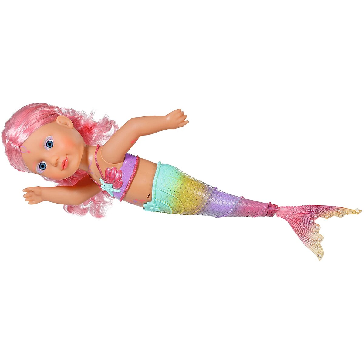Technical_details - BABY born® Little Sister Mermaid 46cm, doll When you think of the sea, you immediately think of the color blue. That's right, the water is blue, but the waves are pretty colourful. The little BABY born mermaid is the best example of the colorful underwater creatures. Her fishtail is very colorful and decorated with glitter elements. It moves when it comes into contact with water. The top in shell design and the colorful body painting goes perfectly with the mermaid tail. The mermaid wears a purple tiara in her long pink hair. The hair can be styled with the comb again and again into new hairstyles. Type: doll EAN: 4001167833681 Manufacturer No.: 833681 Series: BABY born® Age recommendation: from 36 months Target group: kindergarten children Warnings: Caution: Not suitable for children under 36 months! Warnings: Attention: Danger of suffocation due to small parts! Accessories: required | batteries Dimension: Height: 460 mm