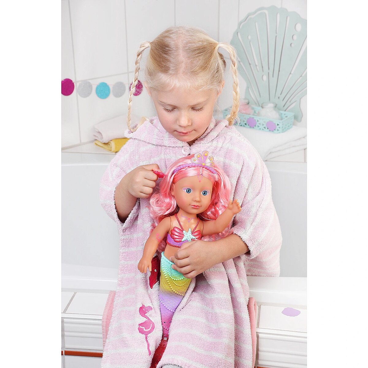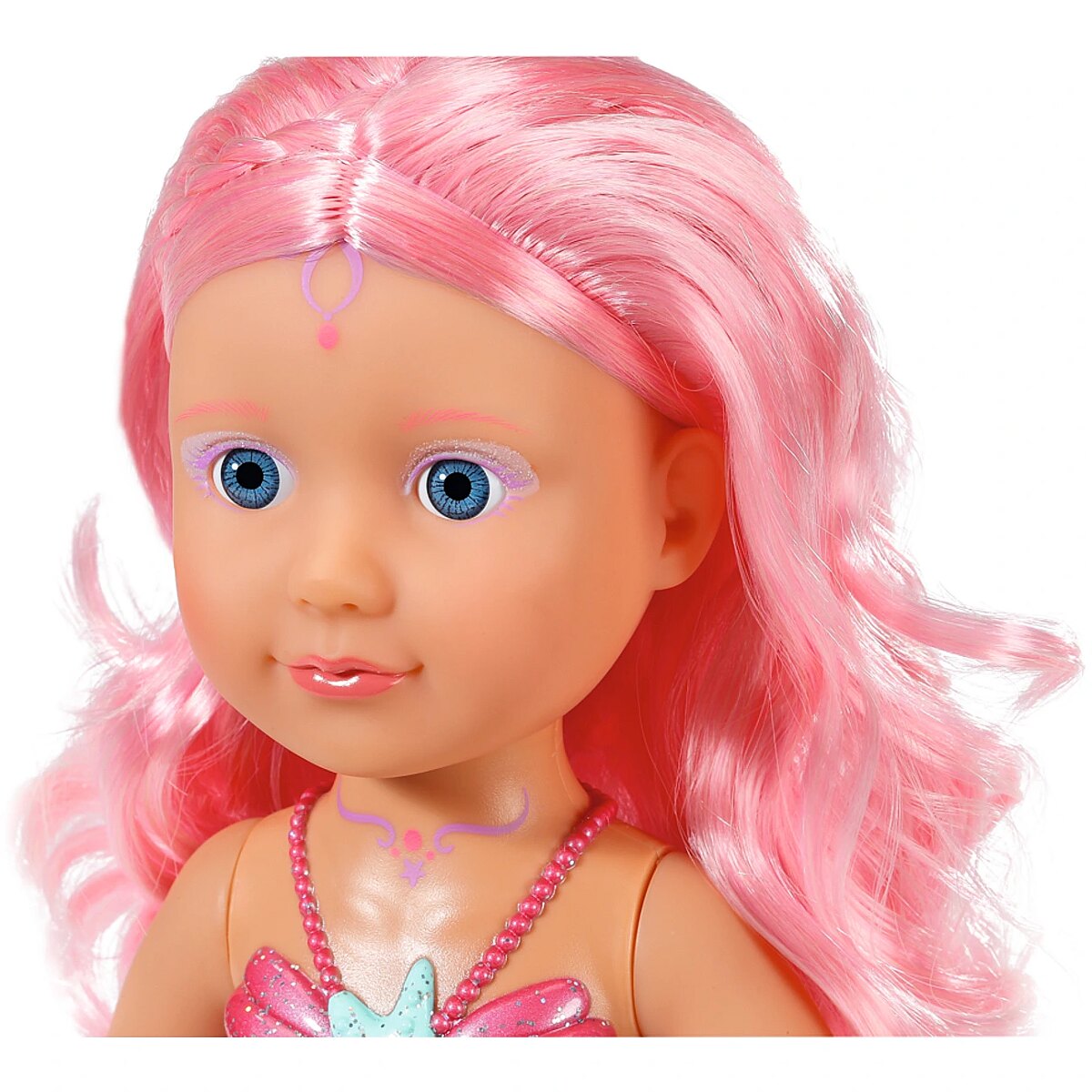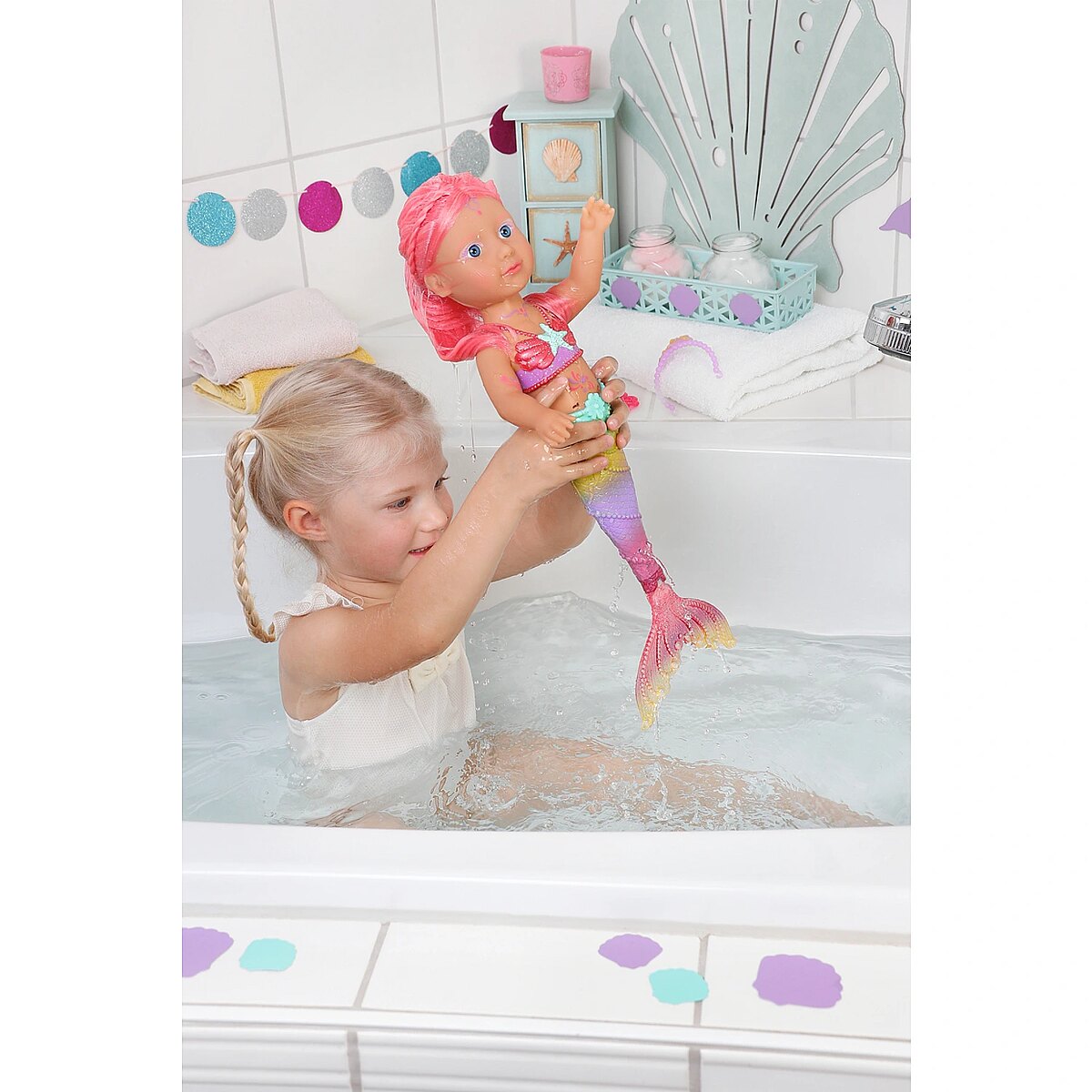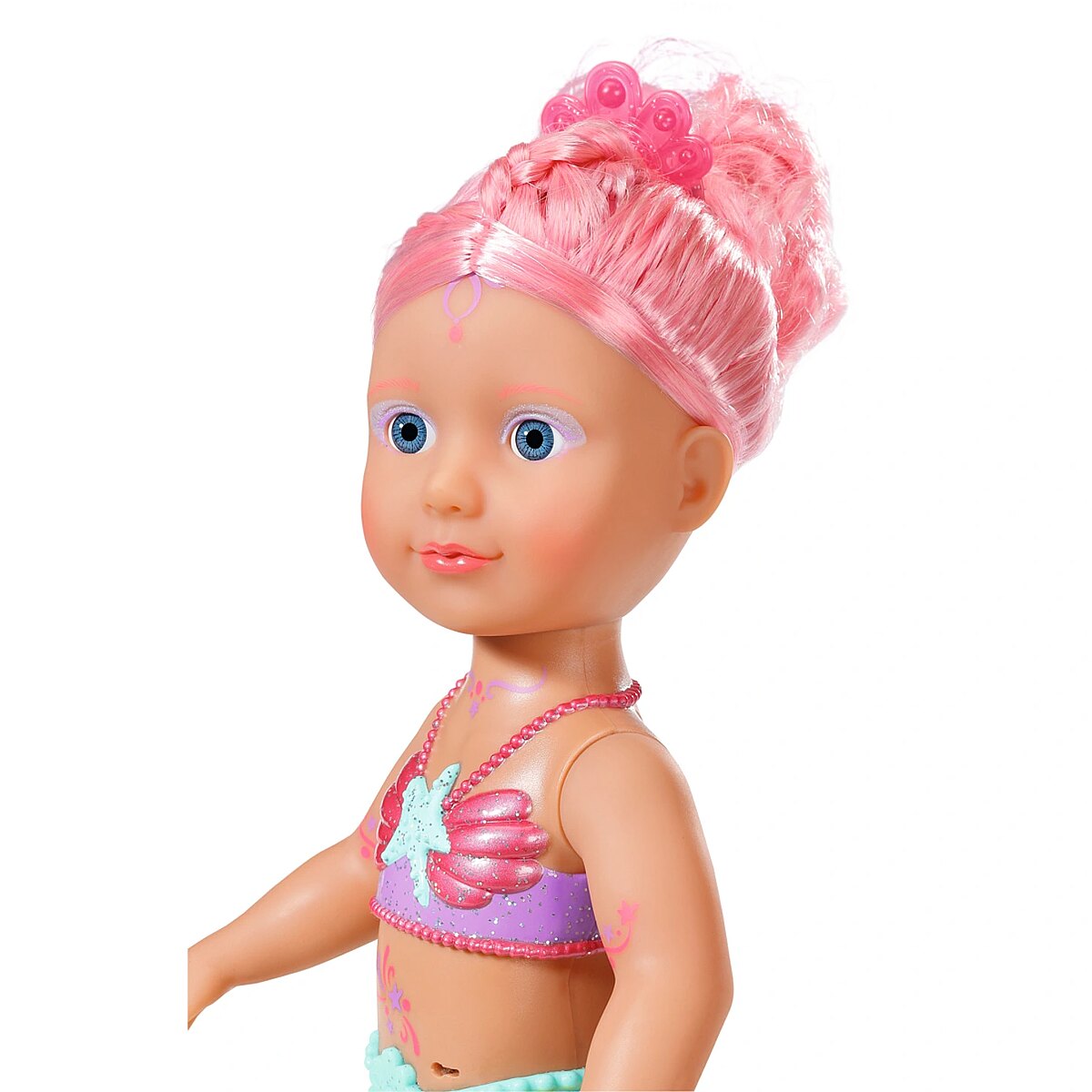 Technical_details - BABY born® Little Sister Mermaid 46cm, doll When you think of the sea, you immediately think of the color blue. That's right, the water is blue, but the waves are pretty colourful. The little BABY born mermaid is the best example of the colorful underwater creatures. Her fishtail is very colorful and decorated with glitter elements. It moves when it comes into contact with water. The top in shell design and the colorful body painting goes perfectly with the mermaid tail. The mermaid wears a purple tiara in her long pink hair. The hair can be styled with the comb again and again into new hairstyles. Type: doll EAN: 4001167833681 Manufacturer No.: 833681 Series: BABY born® Age recommendation: from 36 months Target group: kindergarten children Warnings: Caution: Not suitable for children under 36 months! Warnings: Attention: Danger of suffocation due to small parts! Accessories: required | batteries Dimension: Height: 460 mm