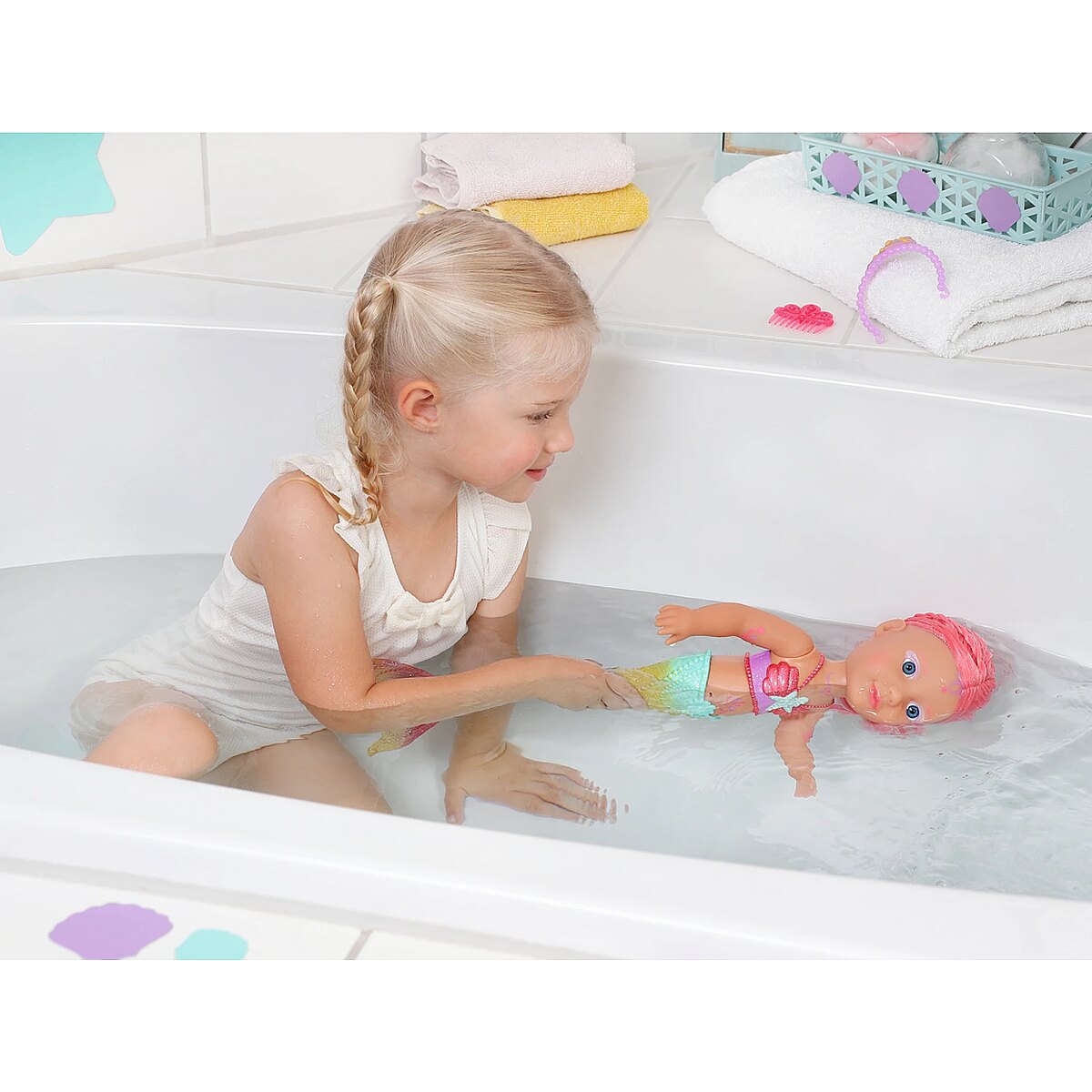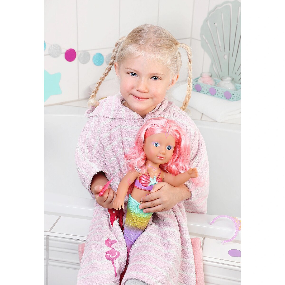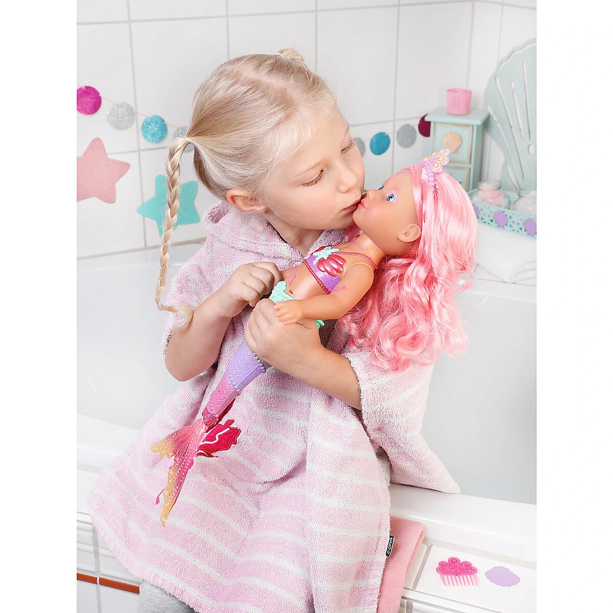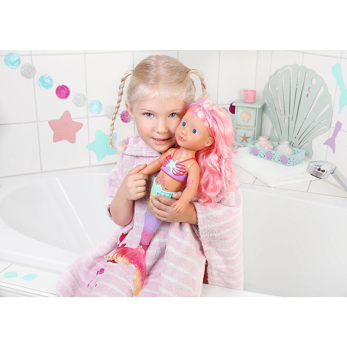 Technical_details - BABY born® Little Sister Mermaid 46cm, doll When you think of the sea, you immediately think of the color blue. That's right, the water is blue, but the waves are pretty colourful. The little BABY born mermaid is the best example of the colorful underwater creatures. Her fishtail is very colorful and decorated with glitter elements. It moves when it comes into contact with water. The top in shell design and the colorful body painting goes perfectly with the mermaid tail. The mermaid wears a purple tiara in her long pink hair. The hair can be styled with the comb again and again into new hairstyles. Type: doll EAN: 4001167833681 Manufacturer No.: 833681 Series: BABY born® Age recommendation: from 36 months Target group: kindergarten children Warnings: Caution: Not suitable for children under 36 months! Warnings: Attention: Danger of suffocation due to small parts! Accessories: required | batteries Dimension: Height: 460 mm