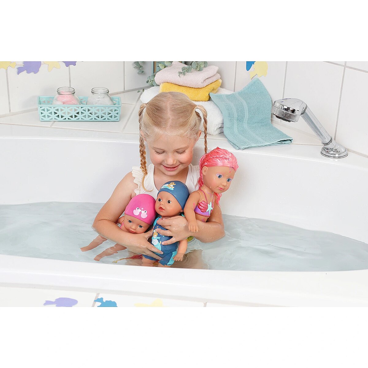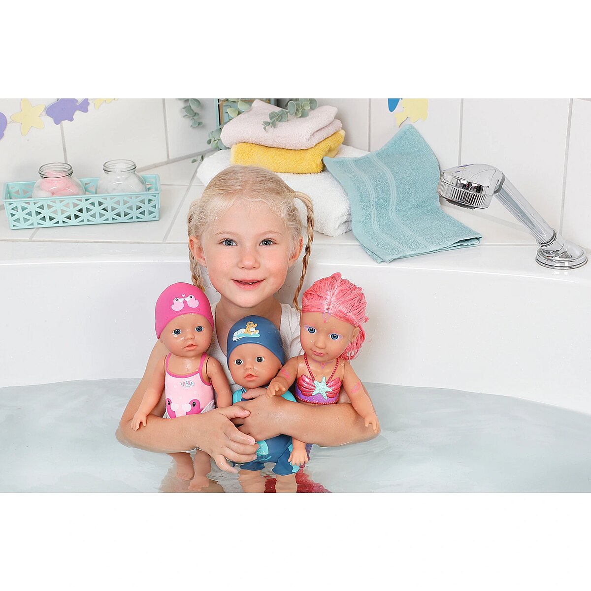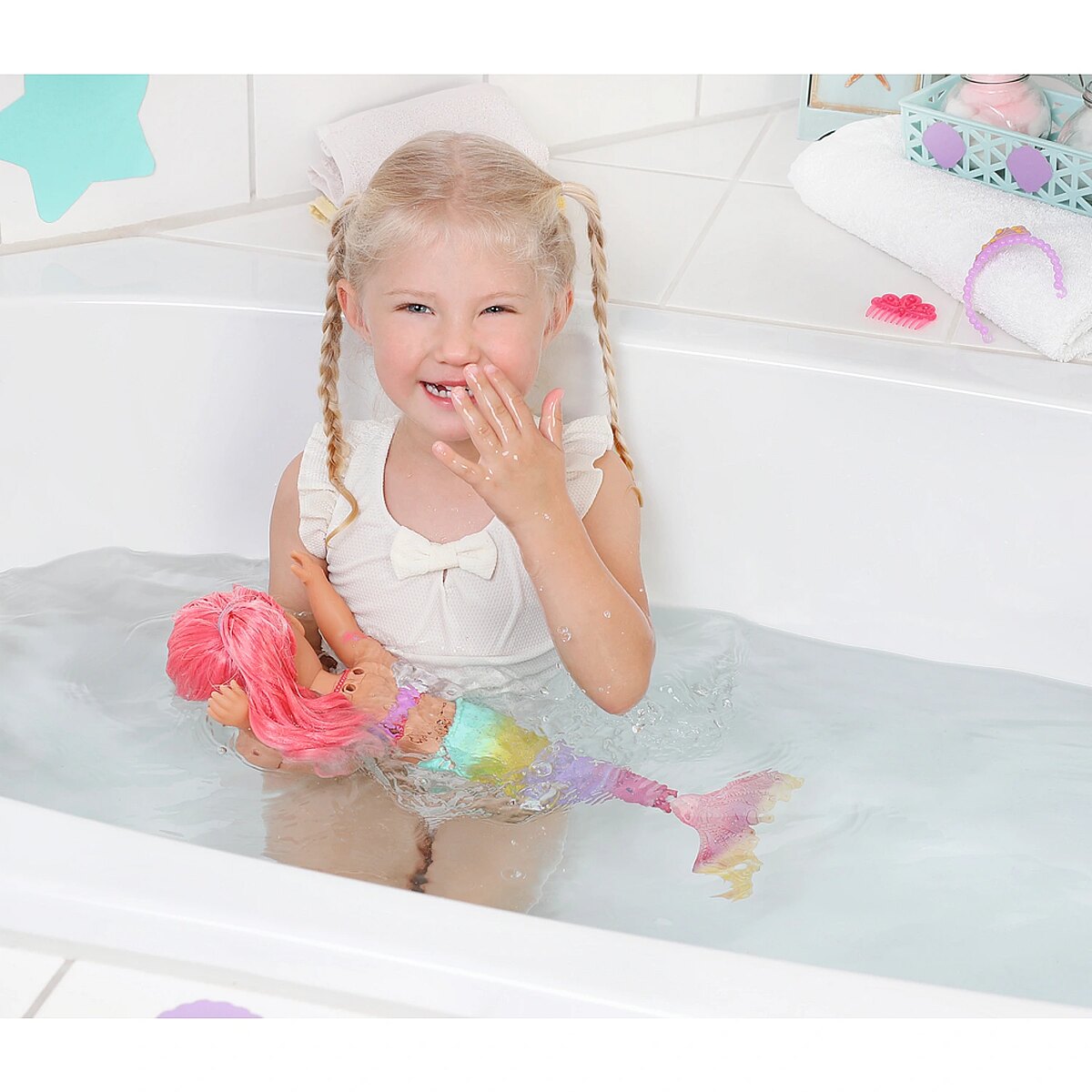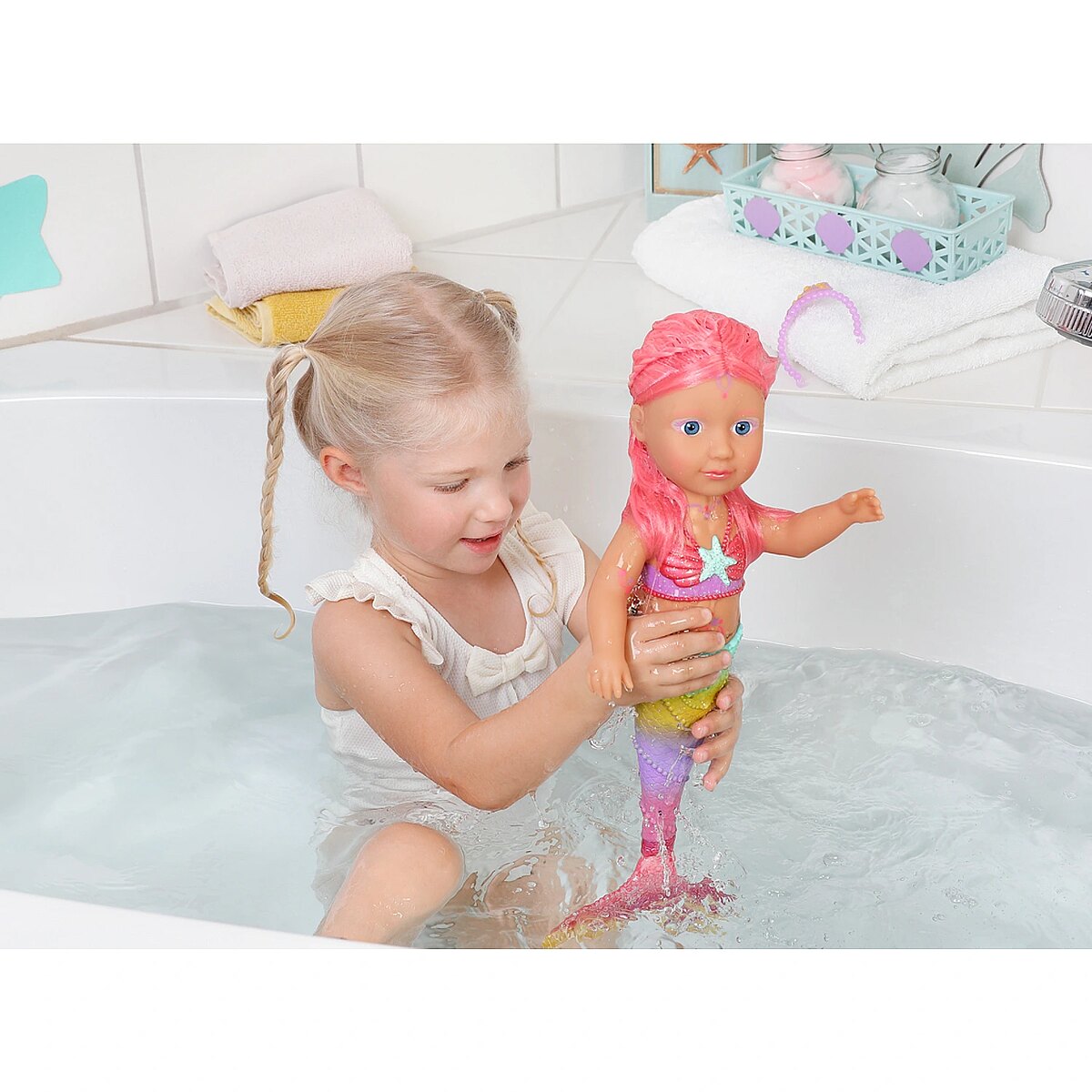 Technical_details - BABY born® Little Sister Mermaid 46cm, doll When you think of the sea, you immediately think of the color blue. That's right, the water is blue, but the waves are pretty colourful. The little BABY born mermaid is the best example of the colorful underwater creatures. Her fishtail is very colorful and decorated with glitter elements. It moves when it comes into contact with water. The top in shell design and the colorful body painting goes perfectly with the mermaid tail. The mermaid wears a purple tiara in her long pink hair. The hair can be styled with the comb again and again into new hairstyles. Type: doll EAN: 4001167833681 Manufacturer No.: 833681 Series: BABY born® Age recommendation: from 36 months Target group: kindergarten children Warnings: Caution: Not suitable for children under 36 months! Warnings: Attention: Danger of suffocation due to small parts! Accessories: required | batteries Dimension: Height: 460 mm