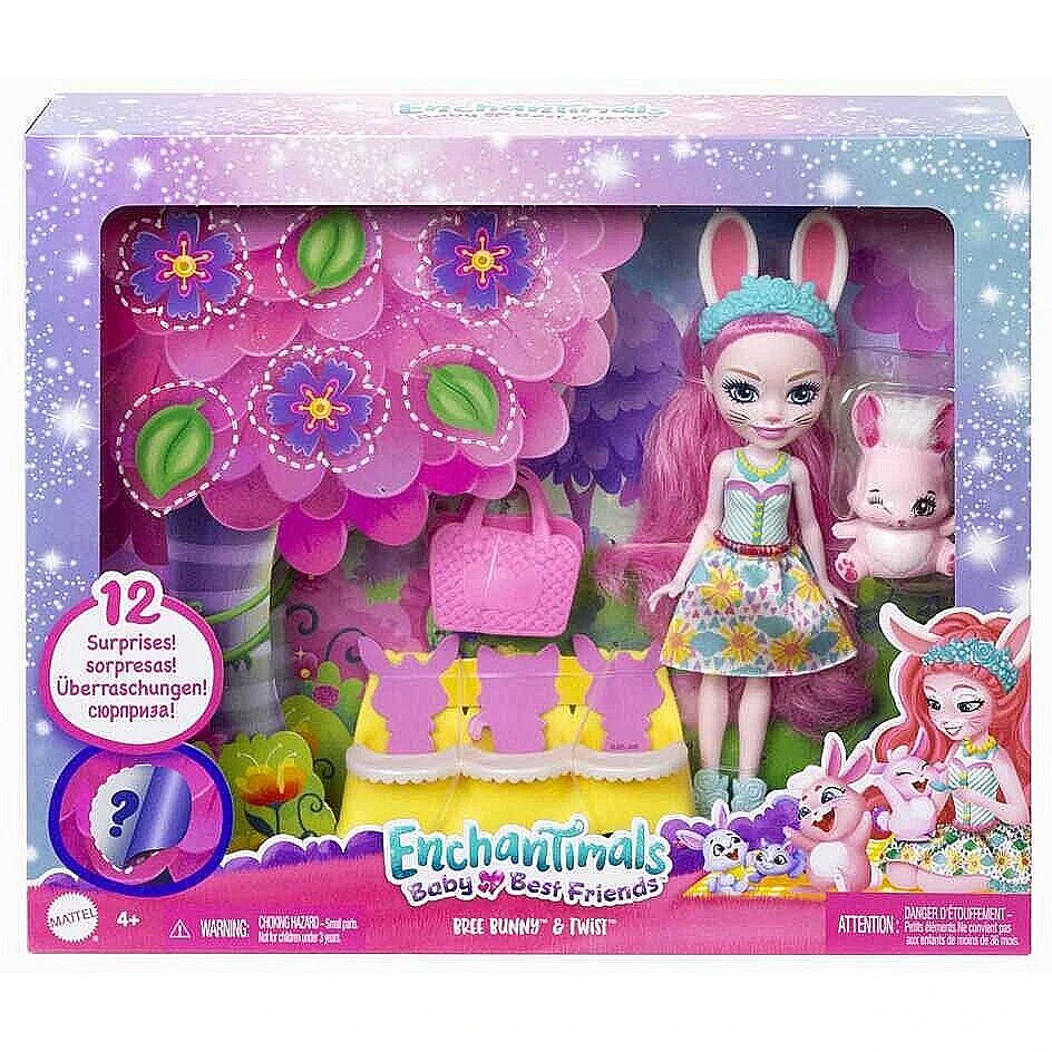 LongDesc - Surprise! It's the Enchantimals Baby Best Friends Collection -- each box is full of delightful discoveries. First, kids will see they've received a lovable 6-inch Enchantimals doll with fun hairstyle and fashions along with her big animal bestie friend posed beside a colourful leaf and flower-filled tree. Next, kids will squeal with joy as they open the leaves and flowers to discover three baby best friends and nine baby accessories. That's a total of 12 surprises inside every box! Accessories all work with each baby best friend and can be mixed and matched for even more play. Baby carrier and diaper bag included! Kids will want to collect them all! Each sold separately, subject to availability. Colours and decorations may vary.