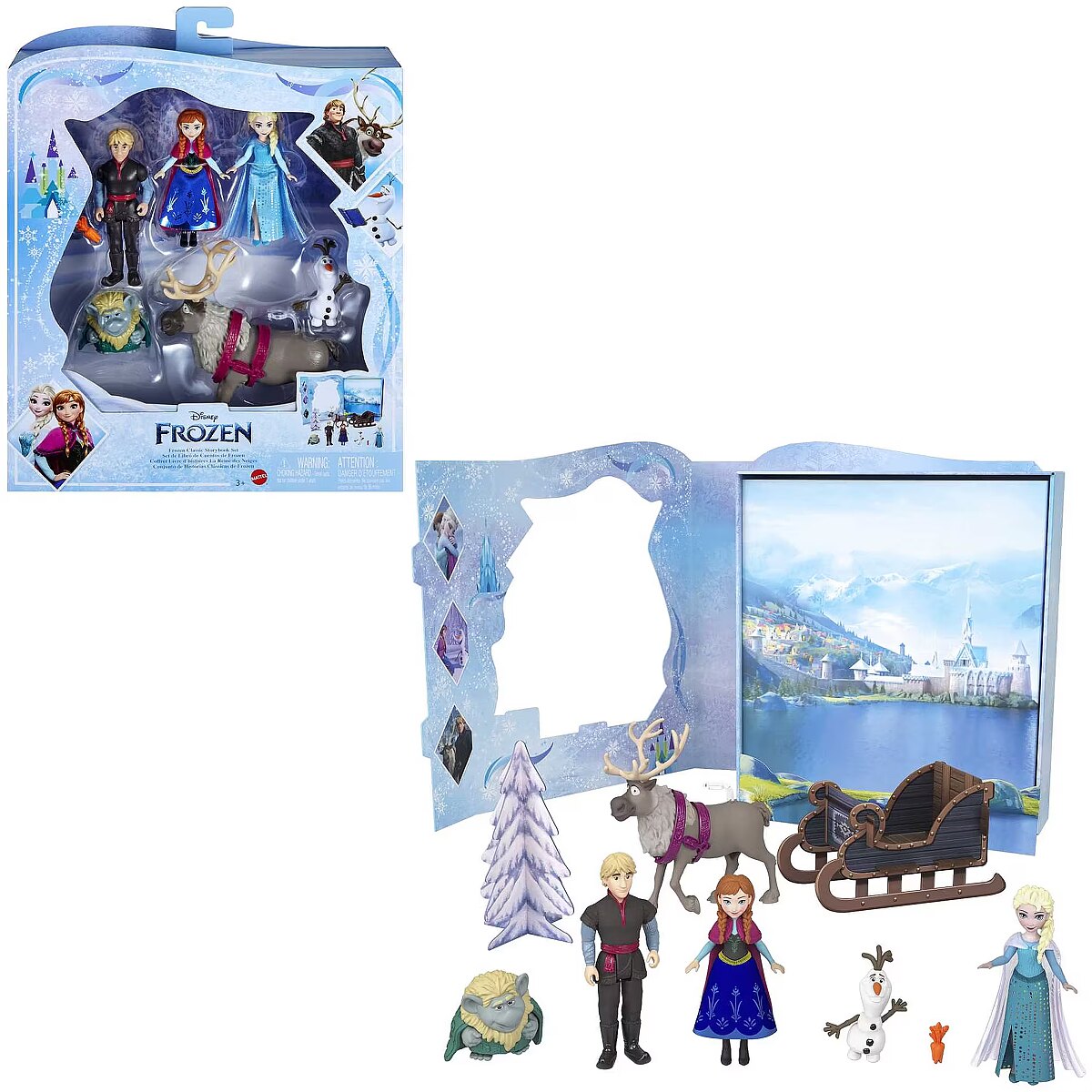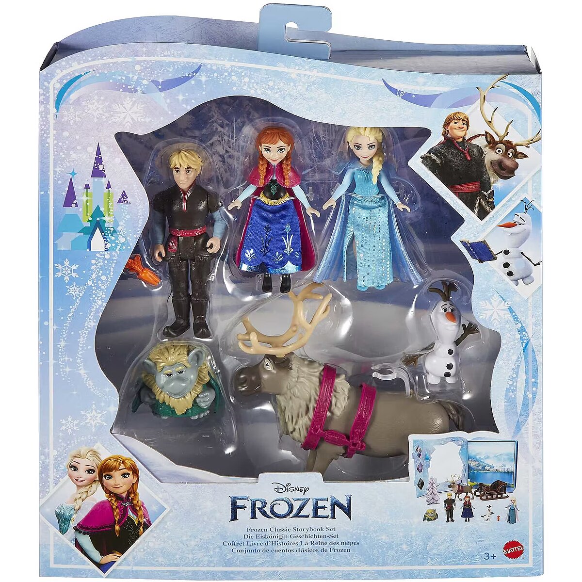 LongDesc - Fan-favourite movie Disney Frozen is shown with a story pack of 6 unforgettable characters, in a charming small scale! This Storybook Set includes Anna and Elsa dolls in their signature looks, Kristoff doll, Olaf figure, plus Grand Pabbie and Sven figures. The set comes in a storybook-style package with perforated play pieces that kids can pop out to expand the storytelling fun. Fans will love re-creating the story from beginning to end! Dolls cannot stand alone. Colours and decorations may vary.
