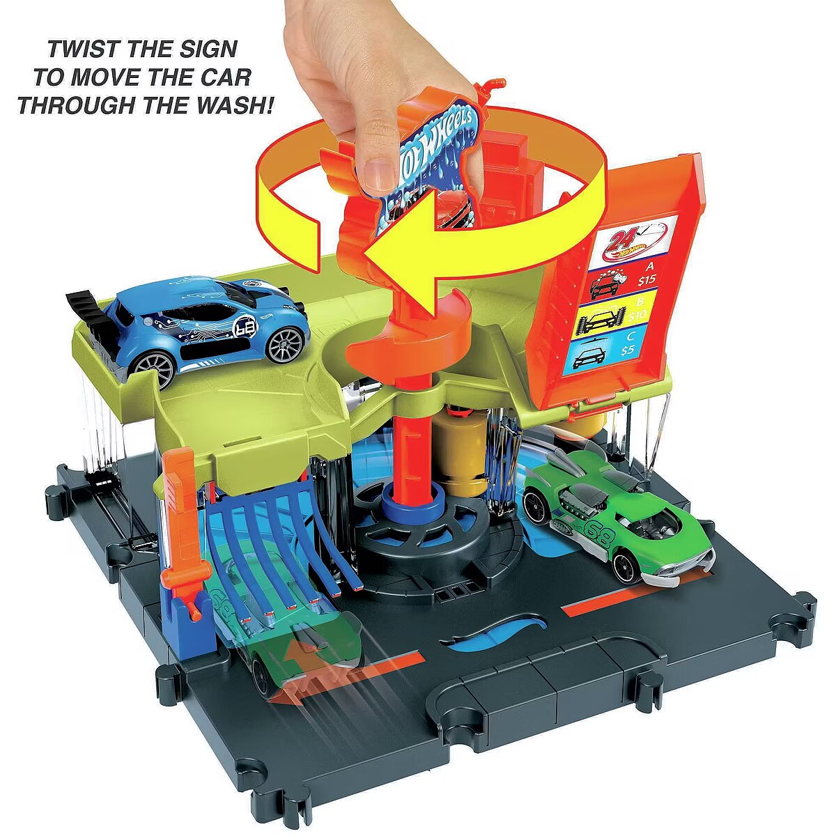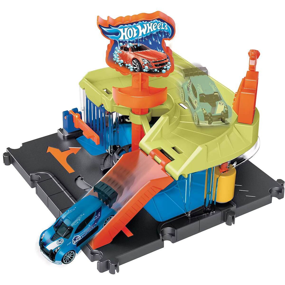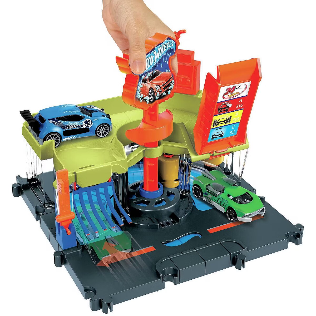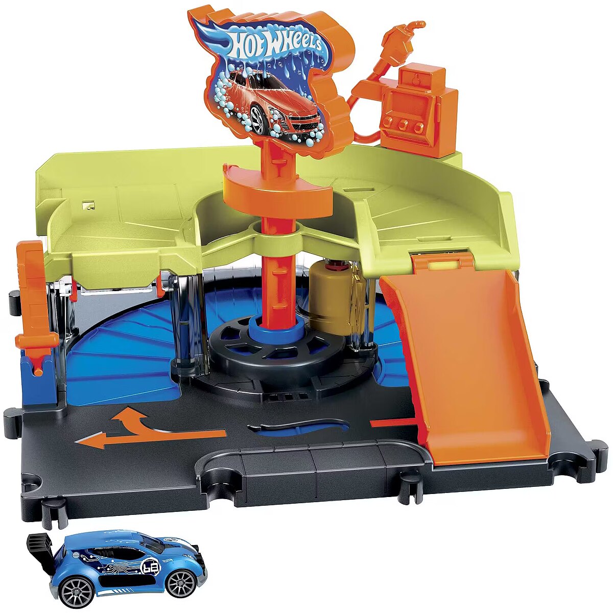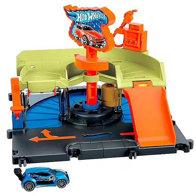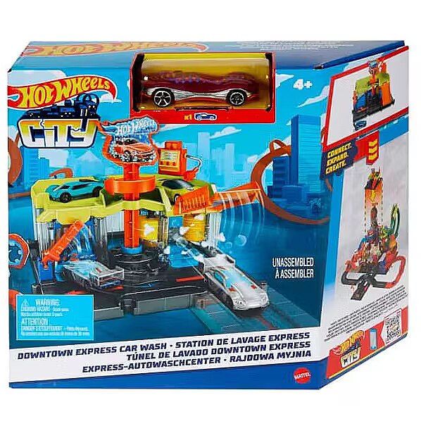 Description - After battling the vicious creatures of Hot Wheels City, head to the car wash to clean up the dirt and debris of city life. Rotate the logo sign and your car will automatically drive through the car wash, always visible through the clear windows. Drive up the ramp to refuel or park, then set off on other adventures. The set connects to other Hot Wheels sets via multiple connection points and comes with one Hot Wheels vehicle to play with straight out of the box. Each sold separately, subject to availability. Colours and decorations may vary. When you're battling toxic creatures, every car needs a good cleaning in the Hot Wheels City Downtown Express Car Wash set before heading off on more adventures. Cool, sliding game details add realism and fun! Kids rotate the logo sign and the cars automatically run through the wash, which includes a foam roller and drying tabs to ensure complete coverage. Set includes 1 Hot Wheels car for instant fun and play right out of the box. Combine the Hot Wheels City Downtown Express Car Wash set with other sets to build a unique world of fun and adventure with cool features that enhance play! Each set sold separately. This is a great gift for kids ages 4 to 8 and timeless collectors who love the detail and character of Hot Wheels sets.