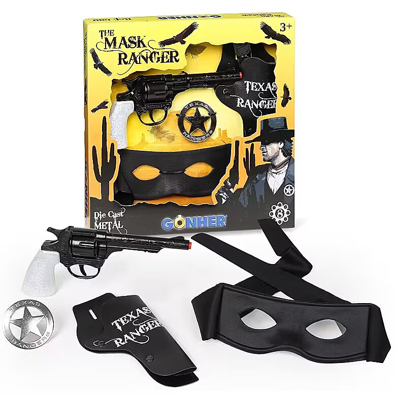 Description - Zestaw zawiera: metalowy rewolwer na 8 naboi z bębenkiem, kaburę, maskę kowboja, odznakę oraz pasek. Wiek: 3+.