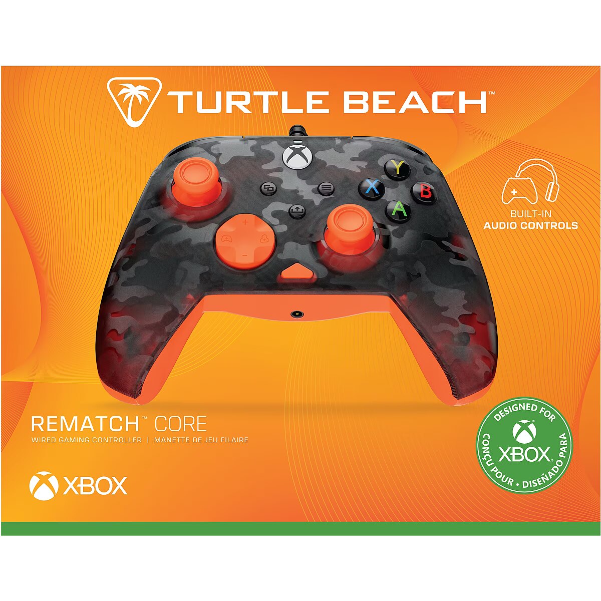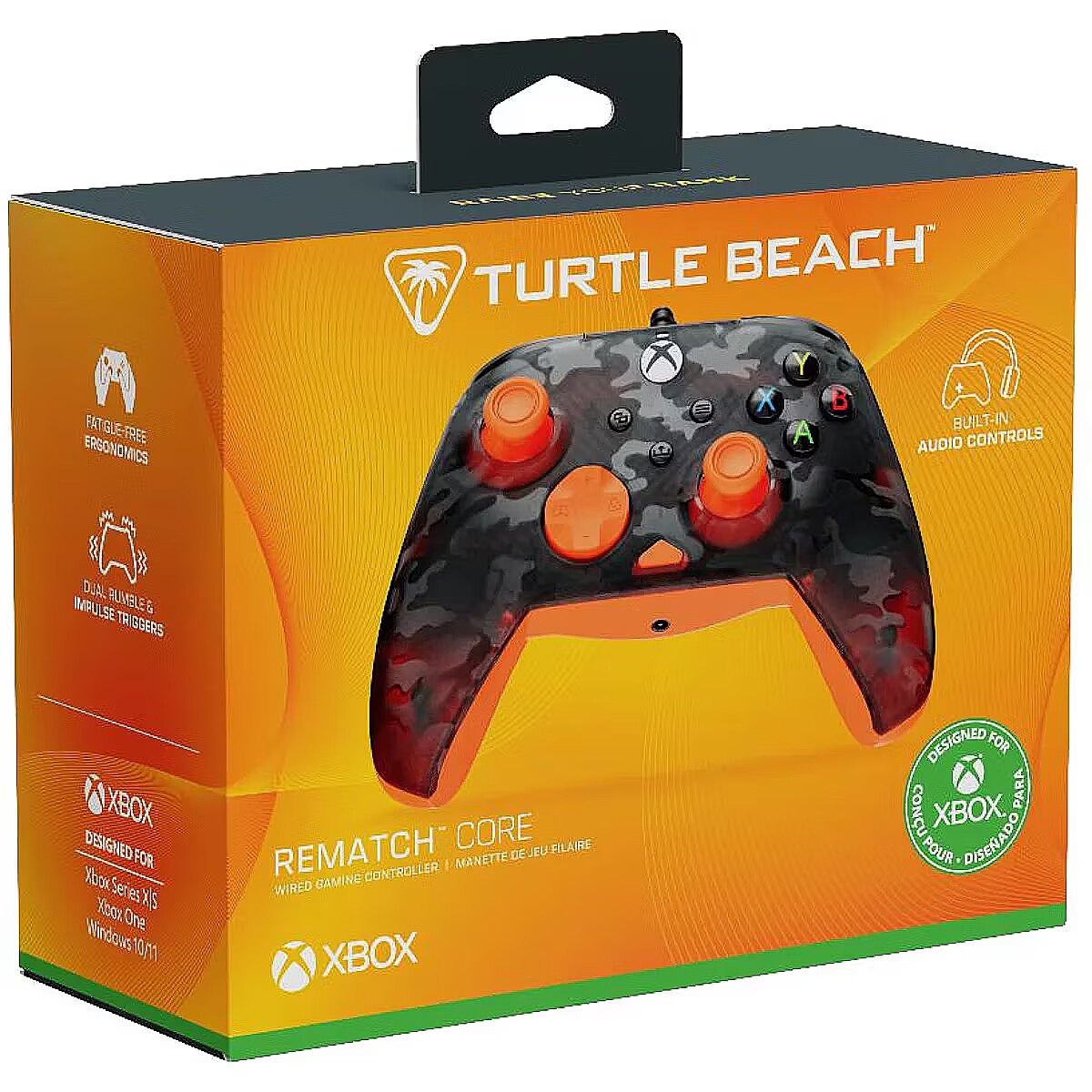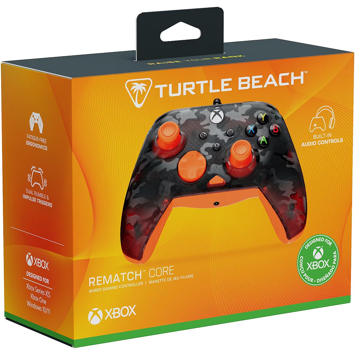 LongSummaryDescription - Turtle Beach Rematch Core Orange and Ghost Black Camo Wired Gaming Controller with Audio Controls, Rumble Motors and Impulse Triggers – Licensed for Xbox Series X or S, Xbox One and Windows PCs. Device type: Gamepad, Gaming platforms supported: PC, Xbox, Xbox One, Xbox Series S, Xbox Series X, Gaming control function buttons: D-pad, Options button. Connectivity technology: Wired, Device interface: USB, USB connector type: USB Type-C. Product colour: Black, Grey, Orange, Cable length: 2.5 m. Power source: Cable. Windows operating systems supported: Windows 10, Windows 11