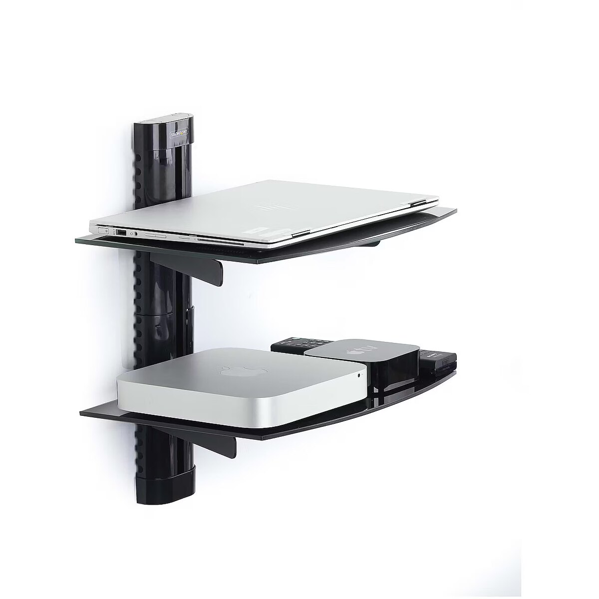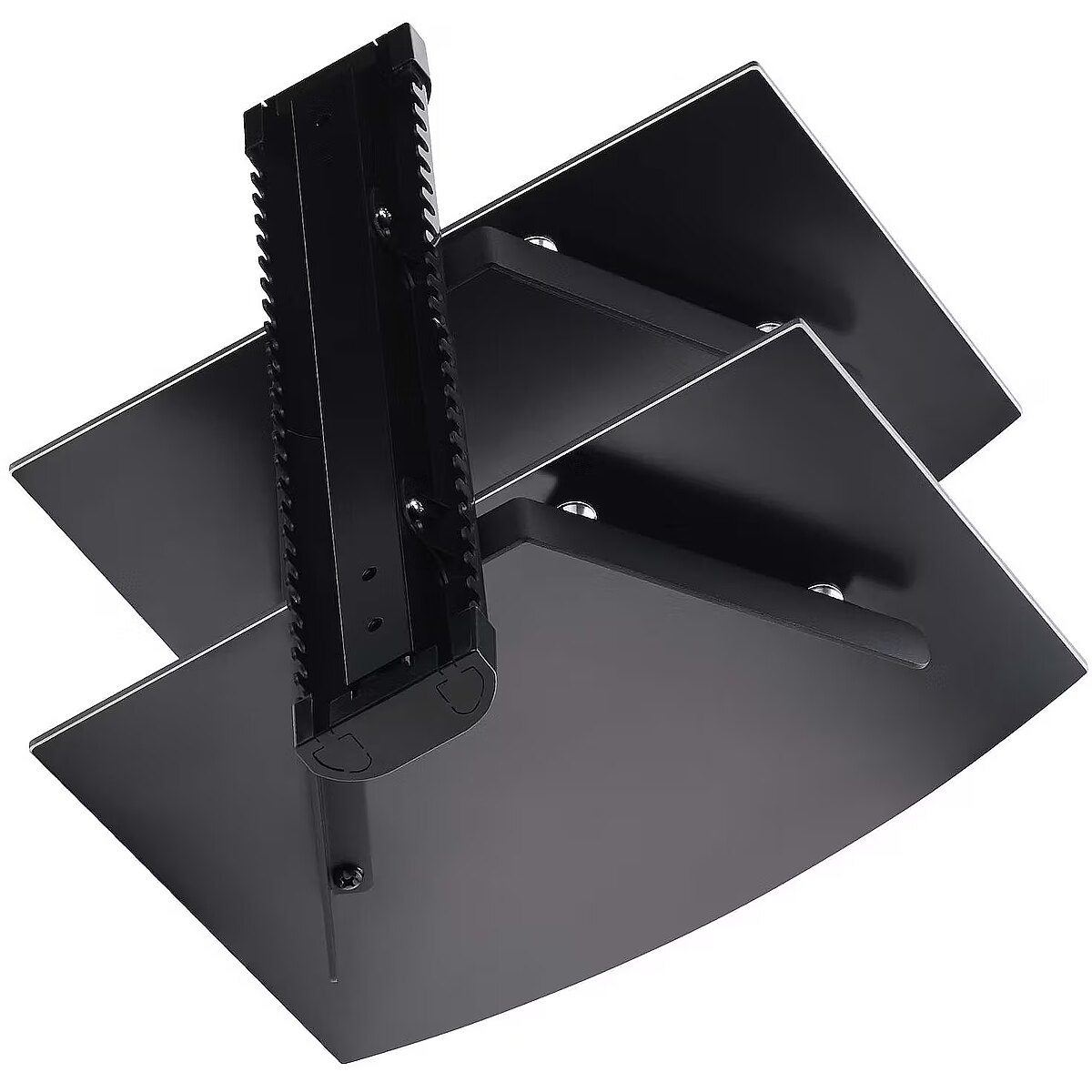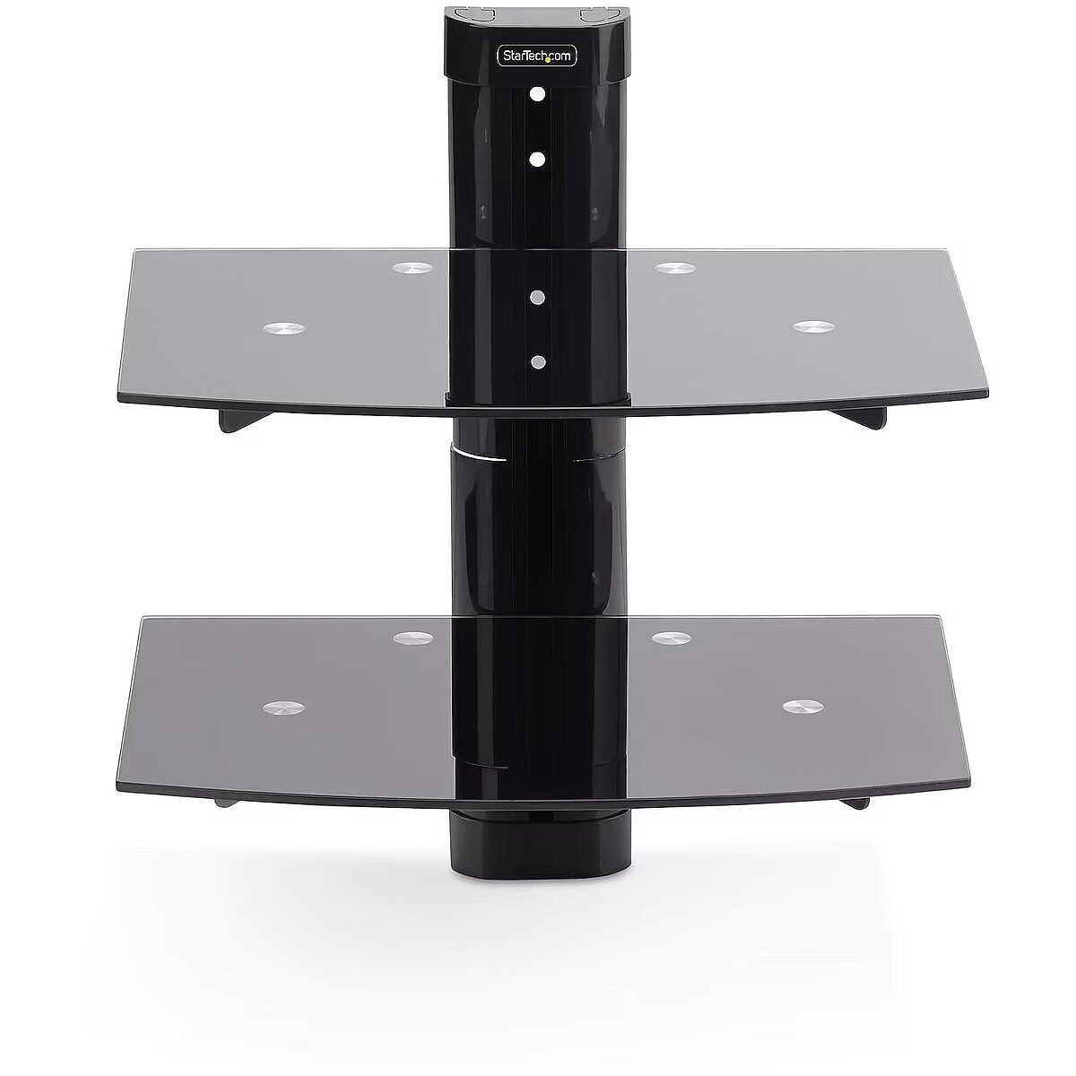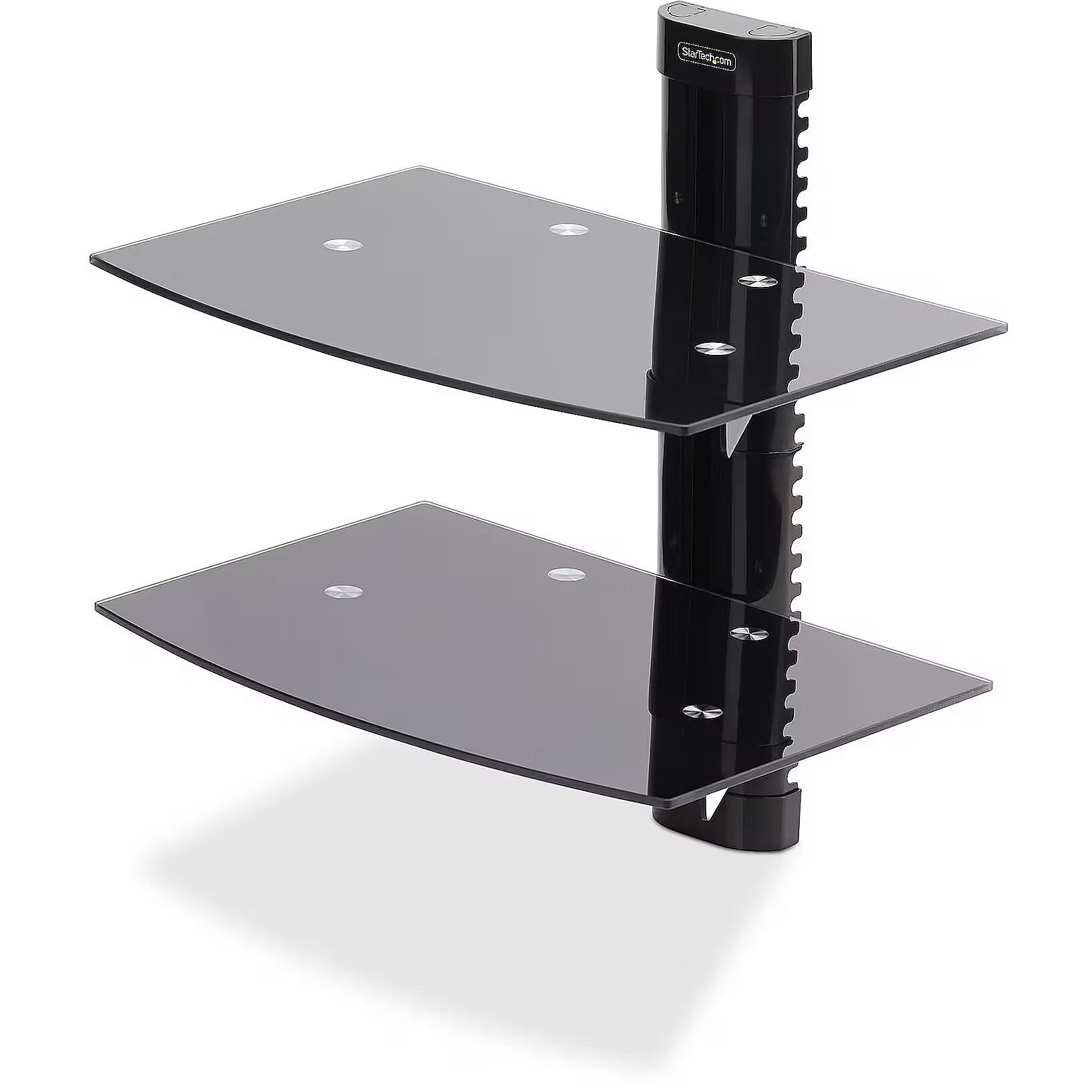 LongDesc - Organize TV accessories with this wall-mounted height-adjustable two-shelf systemThe floating wall mount AV shelf features two 5mm thick black tempered glass shelves, providing an unobstructed surface ideal for organizing AV components under or above a TV or display.Ease of Installation and AdjustmentThe shelf's bracket mounts to a single wall stud or a concrete wall, with all necessary hardware for installation on a wooden stud or concrete wall, as well as a quick-installation guide, included.The shelves are height adjustable along the 13.6-inch (346mm) wall mount bracket, allowing for customization to accommodate various AV equipment sizes and configurations, such as video conferencing equipment or an AV receiver.Durable DesignSupported by steel brackets, each shelf can support up to 15.4 lbs (7kg). The aluminum wall bracket is sturdy yet lightweight for easier installation, while the tempered glass shelves are more resistant to scratches and shattering than traditional glass.Cable ManagementCutouts along each side of the wall-mount bracket and pre-scored knockouts on the top and bottom caps provide additional options for cable positioning.The StarTech.com Advantage