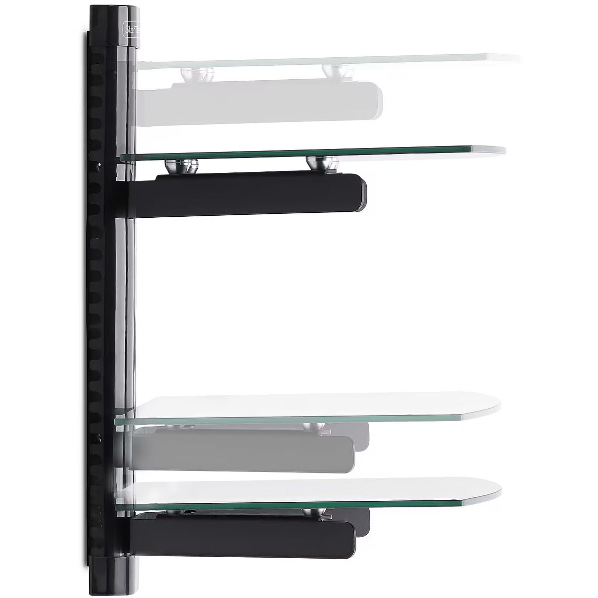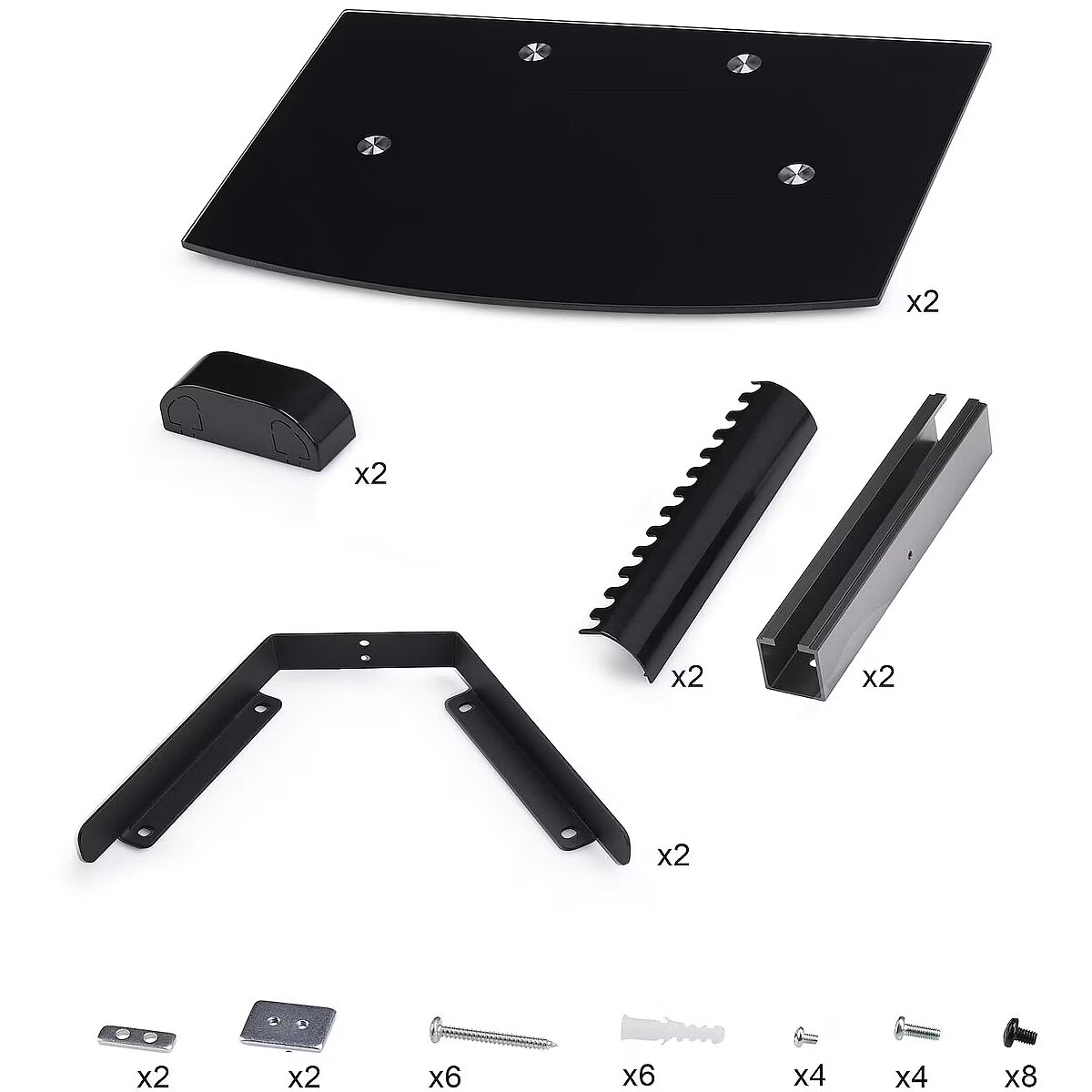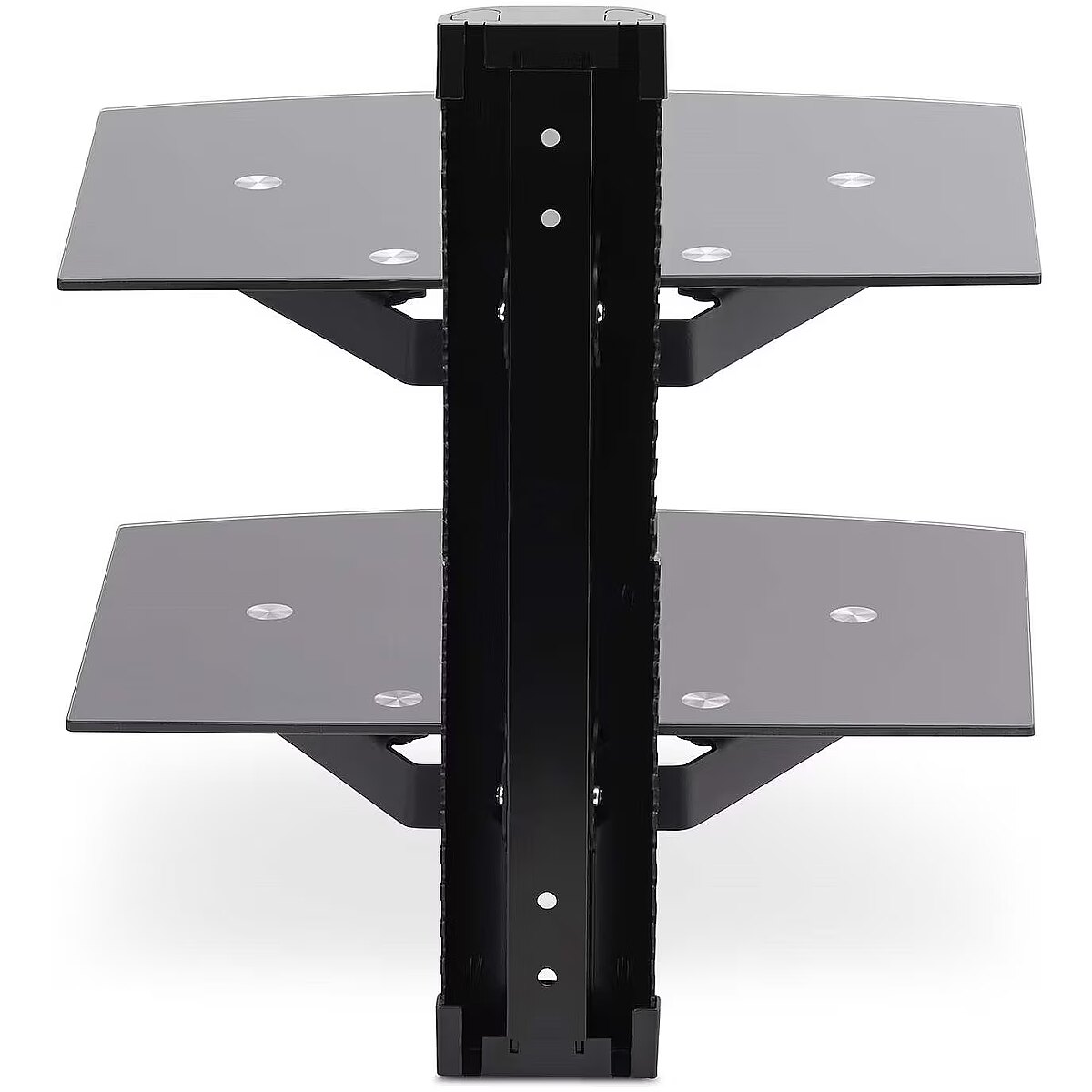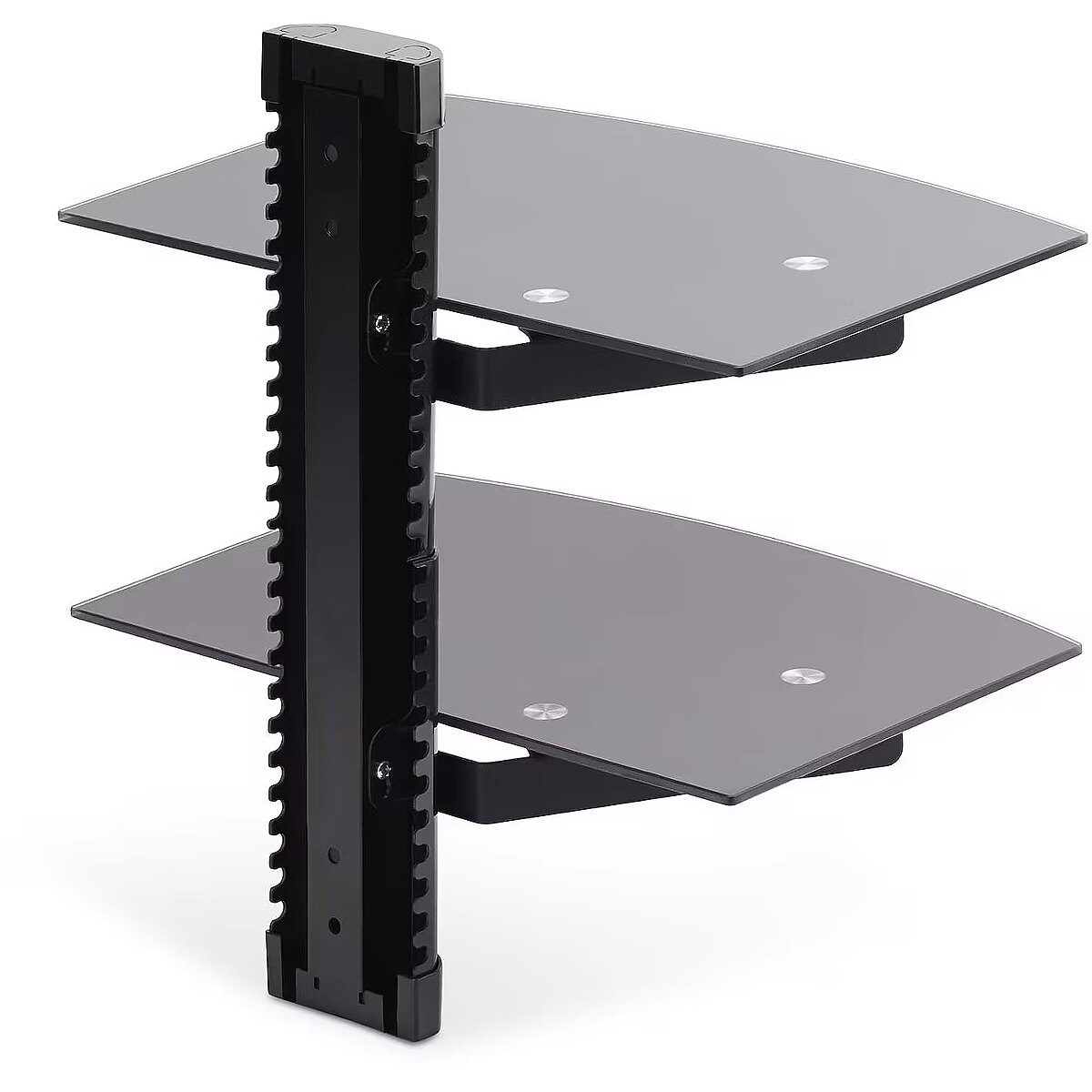 LongDesc - Organize TV accessories with this wall-mounted height-adjustable two-shelf systemThe floating wall mount AV shelf features two 5mm thick black tempered glass shelves, providing an unobstructed surface ideal for organizing AV components under or above a TV or display.Ease of Installation and AdjustmentThe shelf's bracket mounts to a single wall stud or a concrete wall, with all necessary hardware for installation on a wooden stud or concrete wall, as well as a quick-installation guide, included.The shelves are height adjustable along the 13.6-inch (346mm) wall mount bracket, allowing for customization to accommodate various AV equipment sizes and configurations, such as video conferencing equipment or an AV receiver.Durable DesignSupported by steel brackets, each shelf can support up to 15.4 lbs (7kg). The aluminum wall bracket is sturdy yet lightweight for easier installation, while the tempered glass shelves are more resistant to scratches and shattering than traditional glass.Cable ManagementCutouts along each side of the wall-mount bracket and pre-scored knockouts on the top and bottom caps provide additional options for cable positioning.The StarTech.com Advantage