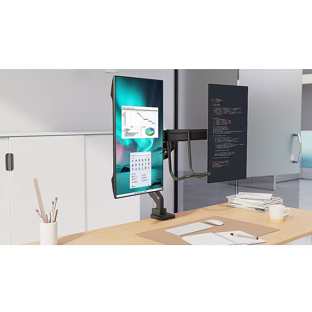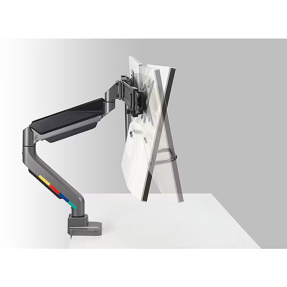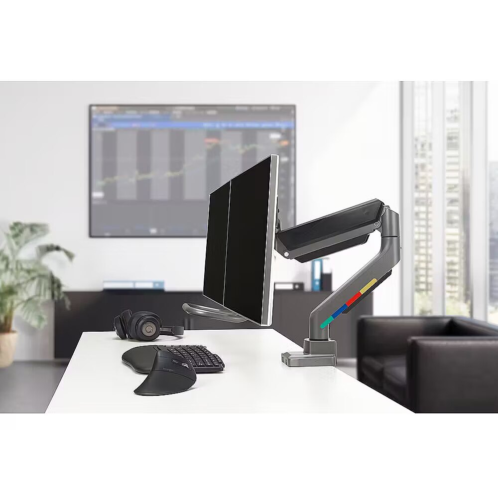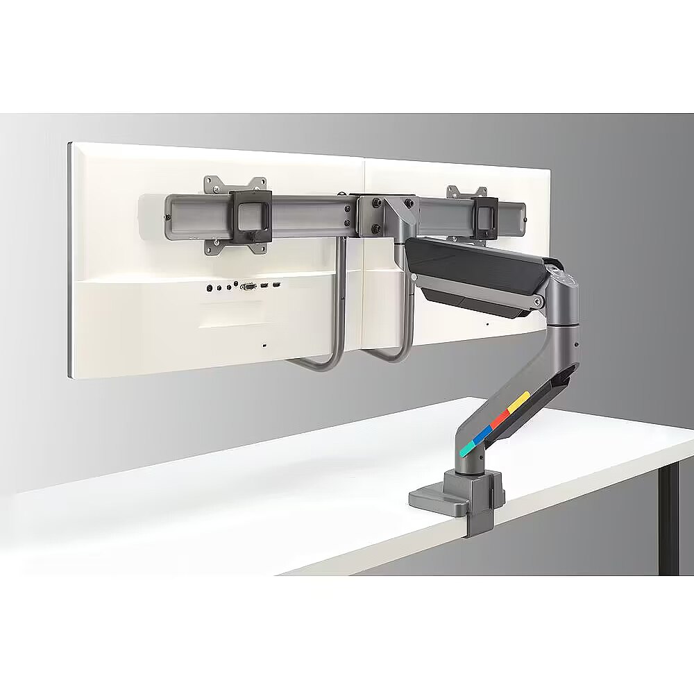 Pozwala na płynną i łatwą regulację wysokości bez używania siły fizycznej, zapewniając ergonomię i komfort przez cały dzień. Ramię do dwóch monitorów
