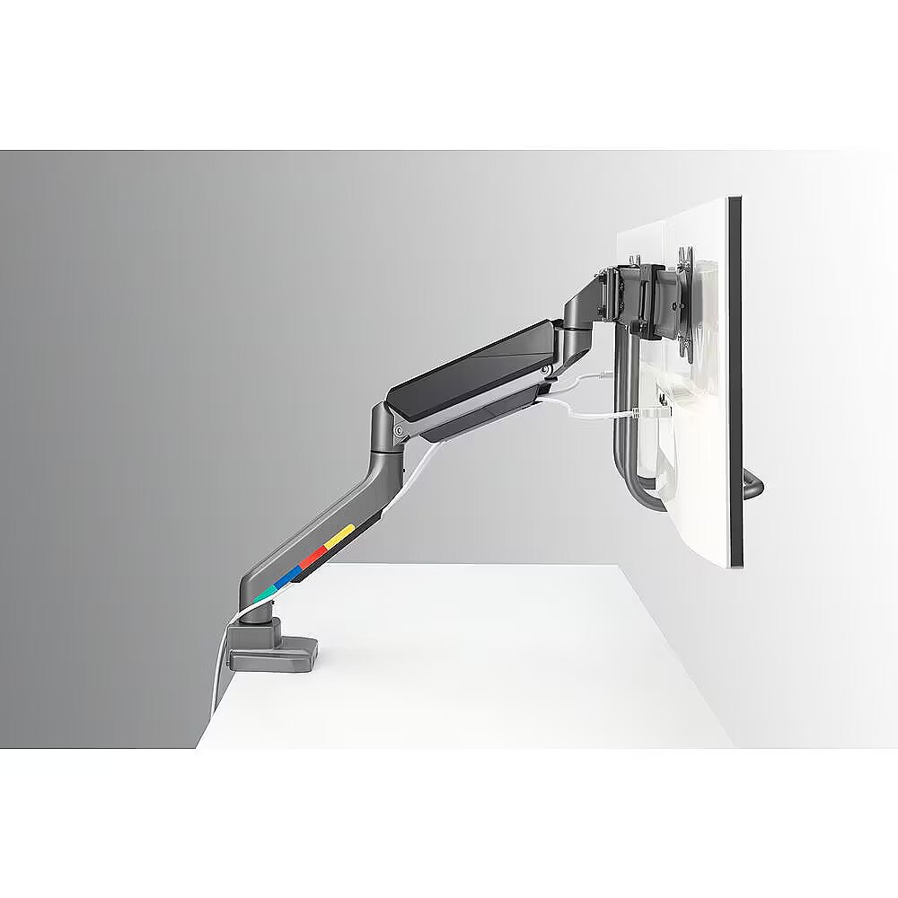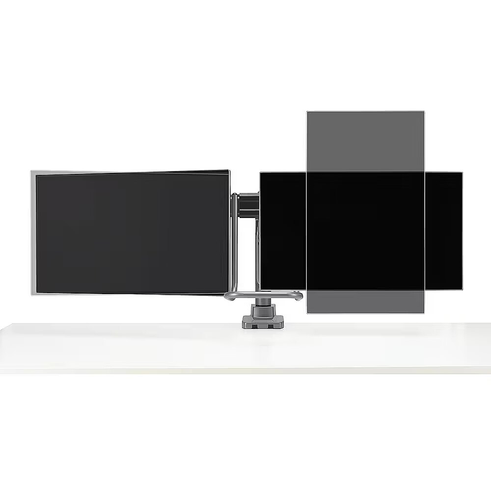 Osobna regulacja położenia każdego z monitorów w poziomie pozwala bez żadnych problemów uzyskać idealny kąt widzenia oraz wygodne i produktywne miejsce pracy. Możliwa jest też regulacja pochylenia w zakresie +/- 10°, obrotu na boki w zakresie +/- 10° oraz obrotu w górę/w dół w zakresie +/- 180°. Mechanizm z gazowym wysięgnikiem