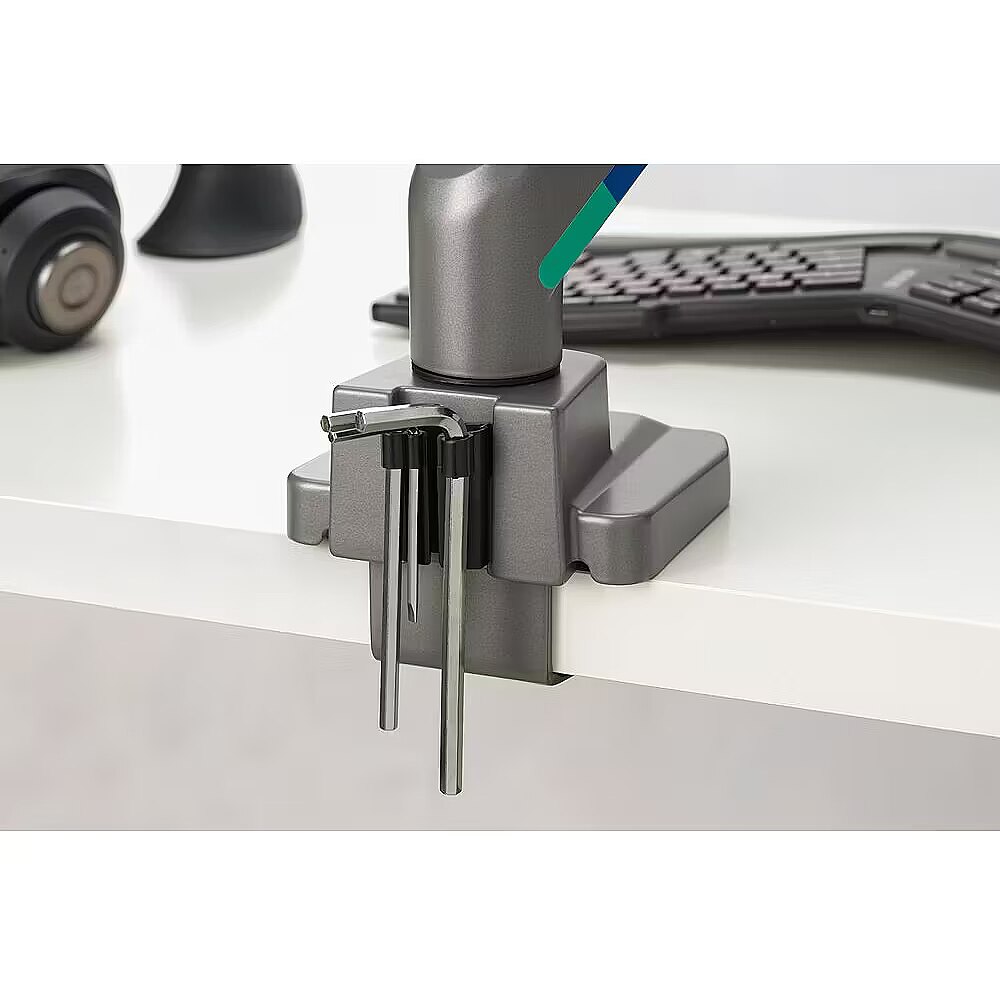 LongDesc - An ideal solution for shared workspaces, SmartFit™ Dual Monitor Arm with Crossbar and Handle harnesses the power of gas spring technology to unlock effortless ergonomic control for your dual-monitor setup. Simply grasp the easy-grip handle to smoothly raise or lower your monitors with the lightest of touches. The gas spring makes even the heaviest dual-monitor configurations feel weightless, enabling you to fine-tune ergonomic positioning throughout the day with less physical exertion. With a separate horizontal adjustment for each monitor, achieving the perfect viewing setup is easy. The innovative curved horizontal rail accommodates two side-by-side 32” monitors weighing up to 9kg (19.8lbs) each, together with the C-clamp providing hassle-free installation. Includes a 5-year limited warranty.