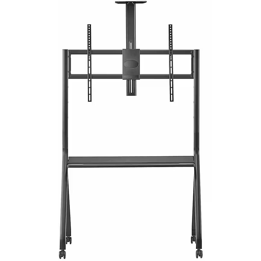 Description - The S-14ART Mobile TV Stand + Mount for 55-100" TVs (120kg) is a versatile solution, ideal for large office spaces such as conference rooms, trade shows, etc. The locking casters allow for quick and easy relocation or to another room. Other features include a cable management system, which helps maintain order and aesthetics. Additionally, the stand is equipped with a shelf, perfect for storing other small devices, such as remote controls, etc. The stand also has an adjustable shelf for a teleconferencing camera, which is located above the TV.