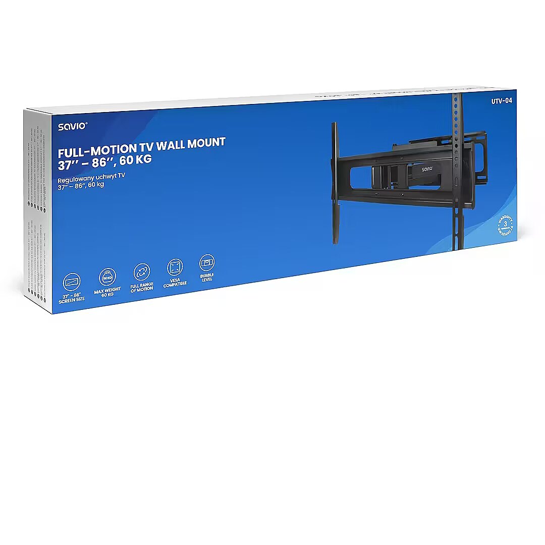 Description - Full-motion TV wall mount 37-86" 60 kg UTV-04 Create a true home cinema or a professional conference space with the UTV-04 TV wall mount. This model is built for special tasks designed specifically for the largest and heaviest TVs on the market. It combines uncompromising steel durability with exceptional adjustment flexibility. By choosing the UTV-04, you gain the confidence that your large screen hangs safely while you maintain full control over the viewing angle. Screen Size: 37-86" This mount is dedicated to large displays. It has been engineered to stably support a wide range of sizes from medium 37-inch screens up to massive 86-inch panels. Whether you have a large TV in your living room or a presentation monitor in your office, the UTV-04 provides a solid foundation. Its a long-term investment that will still perform reliably even after upgrading to a newer and larger model. VESA Compatibility The UTV-04 mount offers broad compatibility with the VESA (Video Electronics Standards Association) standard an international specification defining the mounting hole pattern on the back of your TV. Thanks to its well-designed mounting plate, the mount fits most large televisions, supporting hole patterns from 200 × 200 mm up to 600 × 400 mm (commonly used in very large screens). Maximum Load Capacity: 60 kg When it comes to large televisions, safety is absolutely essential. The UTV-04 is a heavy-duty construction with an impressive maximum load capacity of 60 kg. Its exceptional strength comes from reinforced, thickened steel: 2.5 mm for the wall base (ensuring secure anchoring into the wall), 1.8 mm for both the VESA plate and the mount arms (for comparison, standard mounts often use 1.2 mm arms). The entire structure is coated with durable powder paint, providing an elegant black finish and resistance to damage. Tilt Range: +5° ~ -15° Despite its size and lifting capacity, the UTV-04 offers an impressive range of adjustments, allowing you to position the screen with precision. Tilt: Adjustable from +5° to -15°, helping eliminate glare and achieve the perfect viewing angle especially useful when the TV is mounted high on the wall. Swivel: The sturdy, extendable arm allows you to adjust the distance from the wall between 100 mm and 500 mm and rotate the screen 60°. This is ideal for open spaces where you want to watch TV from different areas (e.g., the living room and kitchen). Level Adjustment: The mount includes a 2° screen leveling function. This extremely useful feature lets you perfectly straighten the TV after installation, correcting any minor drilling imperfections. Package Contents Inside the box, youll find a complete installation kit: Reinforced UTV-04 TV mount, A set of screws and wall plugs for various wall types and TV models, A level to help with precise installation, A user manual that guides you step by step through the mounting process.