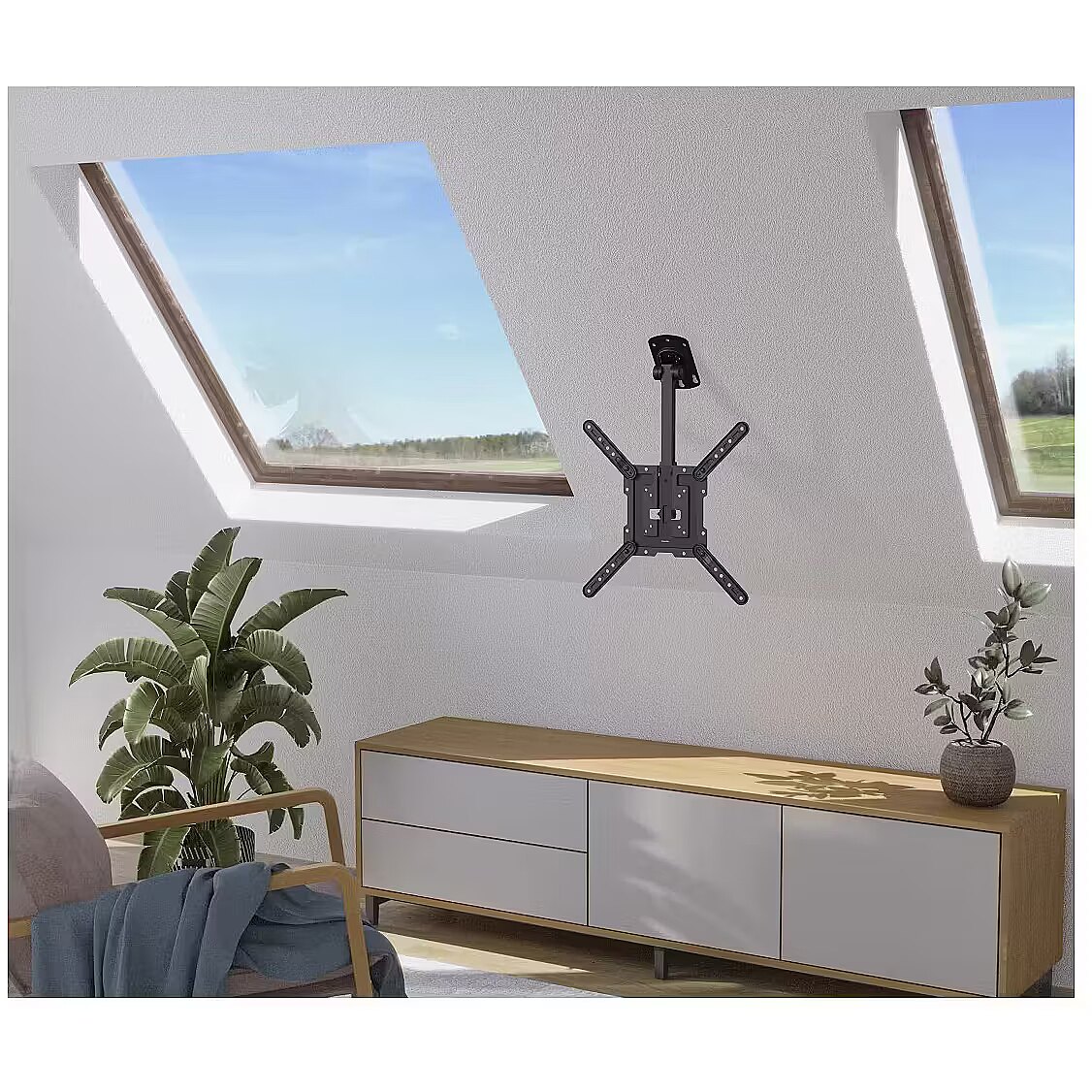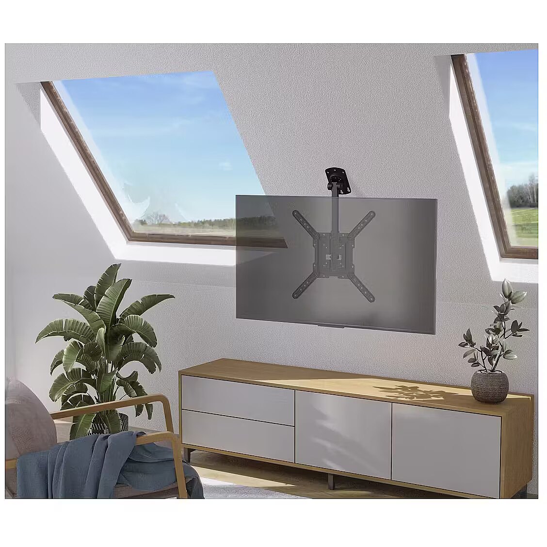 LongDesc - The best place for a television is in the middle of a room. For optical reasons, however, you cannot position a TV cupboard there. This problem can best be solved with Hama's ceiling mount that allows you to suspend your TV from the ceiling. TV viewing will never be the same without it!10-year warranty10-year warranty: a warranty promise on longevity that goes far beyond the statutory guaranteeTested qualityMake a safe choice with our tested safety: exacting stress, stability and functional tests guarantee high quality standardsSimple sloping roof and ceiling mountingNothing gets in the way: the TV bracket is suitable for installation on the ceiling as well as on sloping roofs, making TV stands and extra furniture superfluousSafely out of reachNo expensive accidents: with the TV bracket for the ceiling, the expensive flat screen is securely fastened out of the reach of children and pets and will not get accidentally damaged100°-swivel jointAlways the right viewing angle: the TV can be turned in the preferred direction thanks to the 100°-swivel jointStepless height adjustmentEnjoy the best views: the TV ceiling bracket is infinitely height-adjustable, so you can move your TV set to the perfect height for that real home cinema feelingSecured attachmentSecured attachment ensures a sturdy hold and prevents the TV from being unhinged or falling down inadvertentlyEasy-Fix systemEasy-Fix system for simple and fully adjustable orientation of your TVSpace-saving installationSpace-saving integration into your individual living environment: with the stable universal TV wall bracket for sloping roofs and ceiling mounting, the TV can be placed anywhere in the room in a free-floating and flexible mannerTV mounting with VESA standardReliable mounting of TV sets with VESA standard from 75x75 to 400x400Includes mounting materialEverything included: with the diverse mounting accessories, including high-quality Fischer plugs, you can get started straight awayFSCFSC-certified: the paper and cardboard used in our packaging comes from sustainable forest management - enabling us to take a resources-sparing approach to the raw material of woodPlastic-freePackaging with a clear conscience: our packaging is 100% plastic-free, enabling us to reduce plastic waste and increase its recyclability