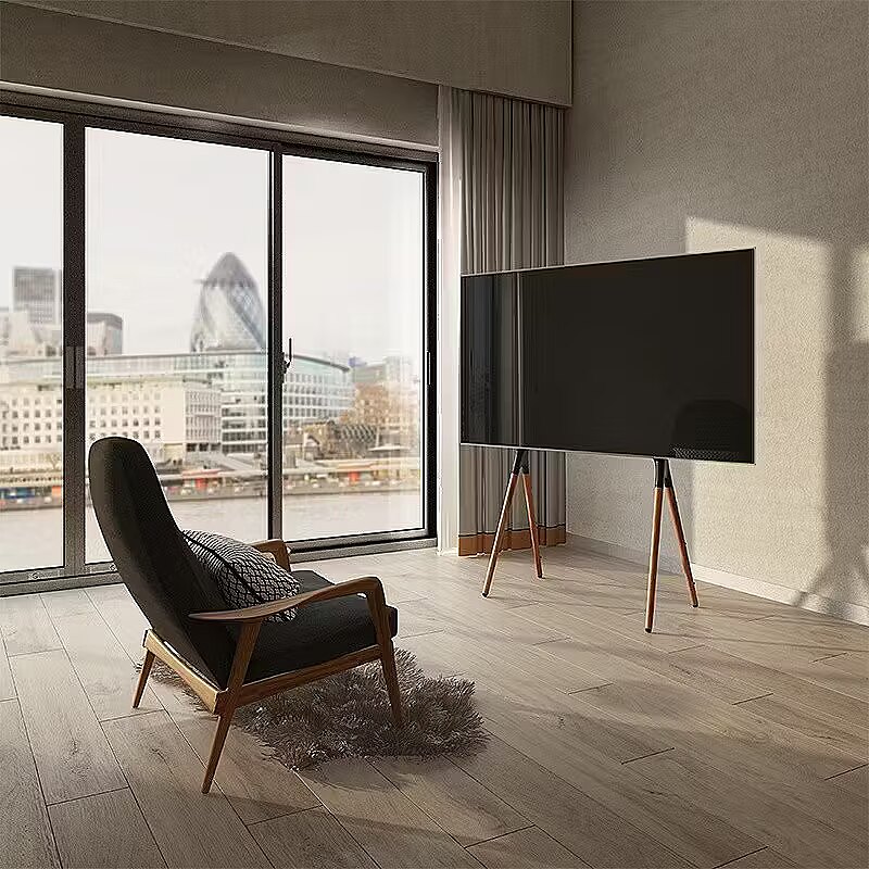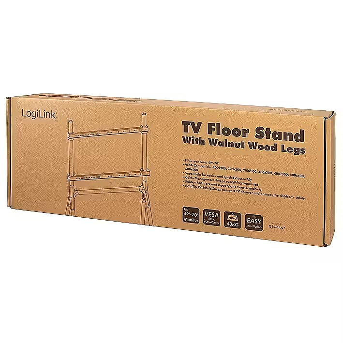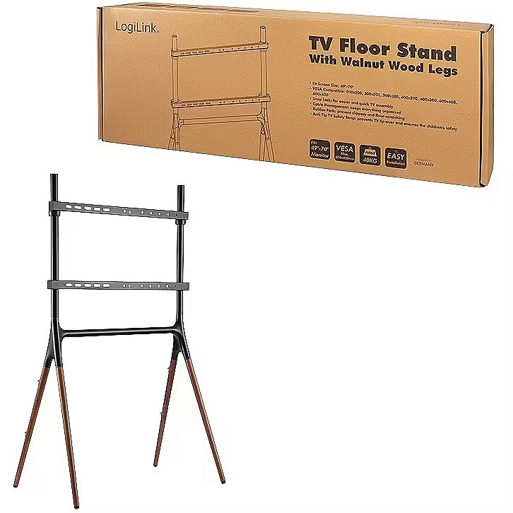 Description - The slim and modern TV stand from LogiLink makes your living room and office look much more attractive and upgrades every viewing experience. The steel bracket and Anti-Tip TV safety strap create a stable stand. This prevents the TV from tipping over and ensures safety from children. The simple cable management keeps everything organised and the walnut wooden legs adds warmth and coziness to the room.