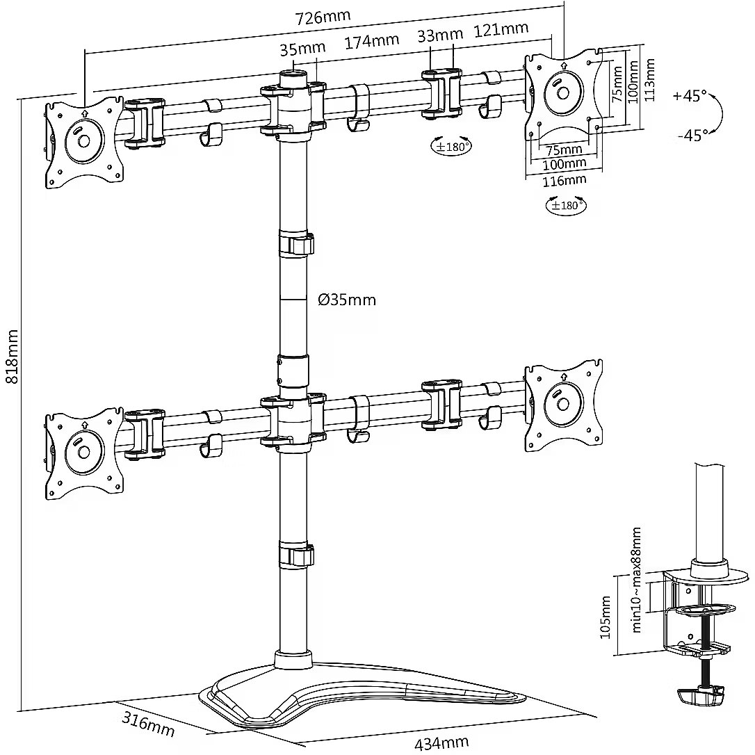 Description - A universal desktop stand for the installation of up to four monitors or televisions allowing for a significant expansion of the visual workspace.