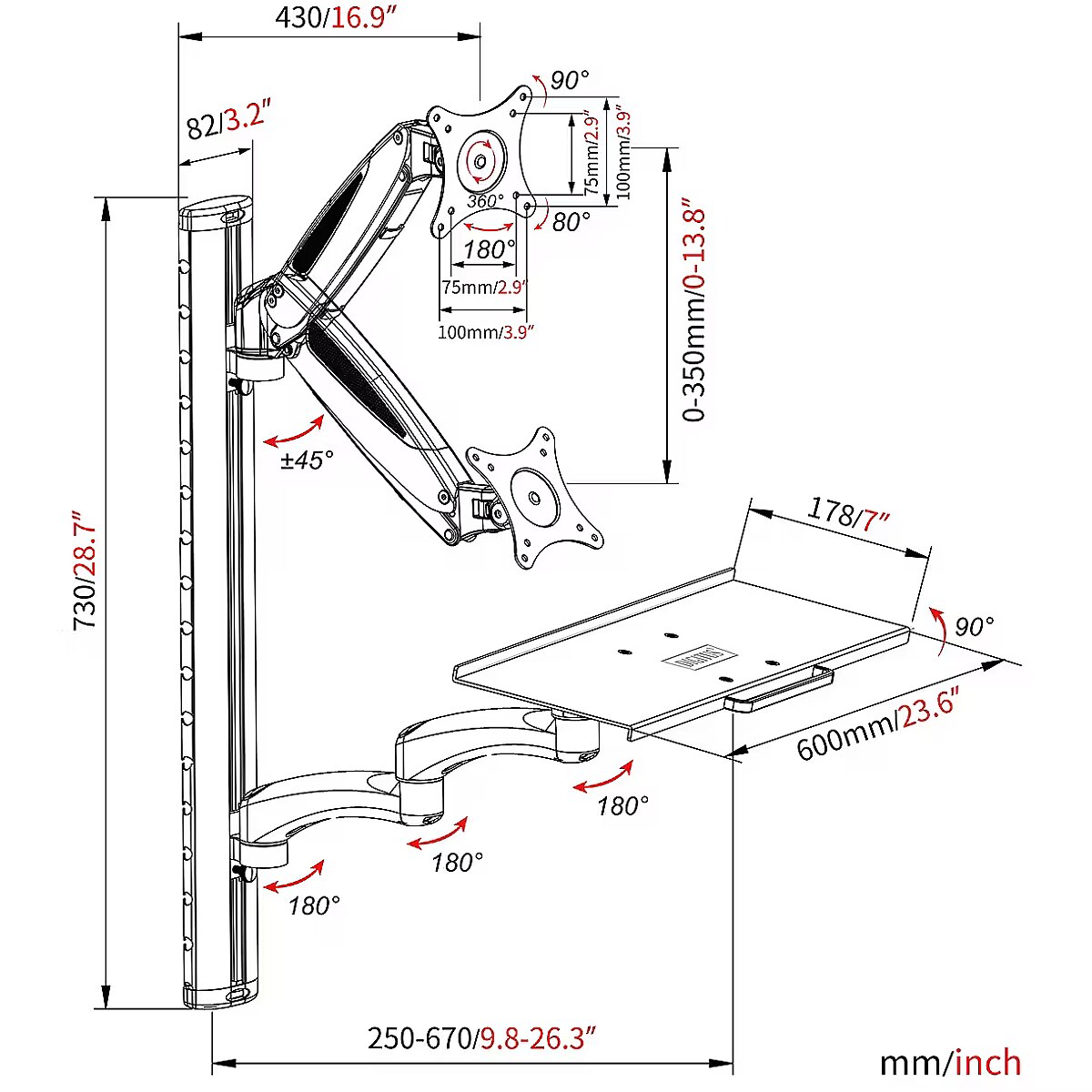 Description - Universal bracket for mounting a monitor and keyboard/mouse on the wall, with flexible height adjustment The DIGITUS handle allows flexible configuration of the workplace thanks to the possibility of wall mounting. The keyboard and mouse shelf has a maximum load of 8 kg. Both arms can be individually adjusted in height on the basis of the support bracket, which is mounted on the wall. Monitor arm (gas spring) 45° tilt adjustment, 180° rotation, 360° VESA mount Monitor arm suitable for monitors with a diagonal of up to 32 and a maximum weight of 8 kg (VESA 75x75, 100x100) Keyboard and mouse holder (double articulated arm) dimensions: W 60 cm x D 17.8 cm and handle on the front Double articulated arm with a maximum load capacity of 8 kg, rotatable up to 180° Both arms can be individually adjusted in height on the carrying handle (height 73 cm) Integrated cable management system Simple wall mounting with three screw connections High-quality aluminum/steel construction