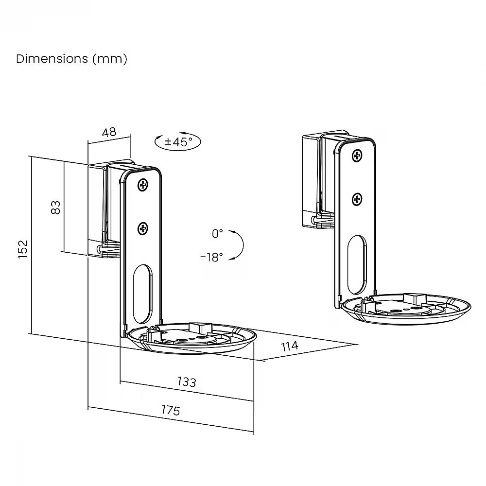 Mõõtmed - Tootja: Maclean - Mudel: MC-997 - Materjalid: metall, ABS - Mõõtmed: 175 x 152 x 114 mm - Sobib järgmiste kõlaritega: Sonos ERA 100 - Maksimaalne koormus: 3 kg - Kaldenurga reguleerimine: 0° kuni -18° - Pöördenurga reguleerimine: +45° kuni -45° - Komplektis olevate osade arv: 2 - Värv: must