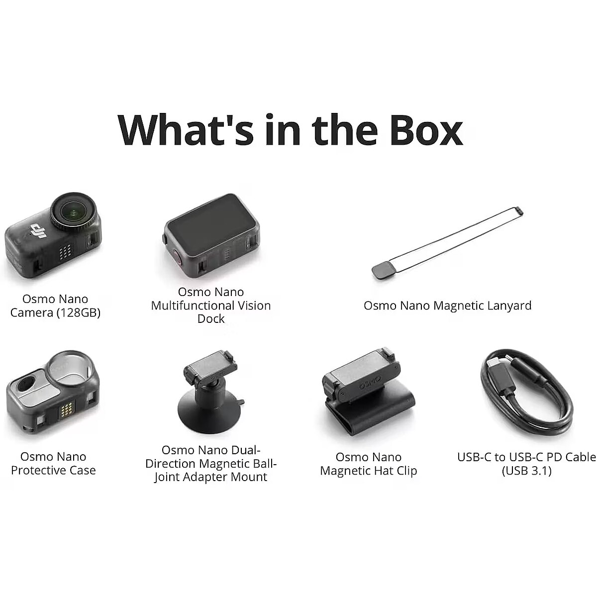 LongDescription EN - Lightweight and wearableOsmo Nano is designed for freedom — its dual-sided magnetic mount allows flexible positioning and creative angles. Compact and portable, it’s perfect for everything from everyday snapshots to extreme adventures. Outstanding image qualityEquipped with a 1/1.3" sensor and powerful image processor, Osmo Nano achieves up to 13.5 stops of dynamic range. It records up to 4K/60fps and captures expansive scenes with a 143° wide field of view, ensuring every detail is included. Advanced shooting featuresWith RockSteady 3.0 and HorizonBalancing stabilization, your footage looks cinematic and smooth. SuperNight mode enhances clarity in low light, letting you shoot vivid night scenes with confidence. Long battery life and fast chargingThe Multifunctional Vision Dock supports rapid charging and up to 200 minutes of runtime. In just 20 minutes, the camera reaches 80% charge, so you’re always ready to record. Waterproof and ready for actionThe camera is waterproof up to 10 m, while the Vision Dock offers IPX4 splash resistance. Whether at the beach, in the rain, or underwater, Osmo Nano keeps performing. Premium audio recordingOsmoAudio™ enables direct microphone connection for professional results, while dual built-in microphones capture immersive stereo sound. Wherever you shoot, your audio will match the visuals. Fast transfer and seamless editingWith USB 3.1 transfer speeds and a microSD slot, sharing footage is quick and simple. The DJI Mimo app provides real-time previews, editing templates, and smart tools to help you create polished videos in no time.