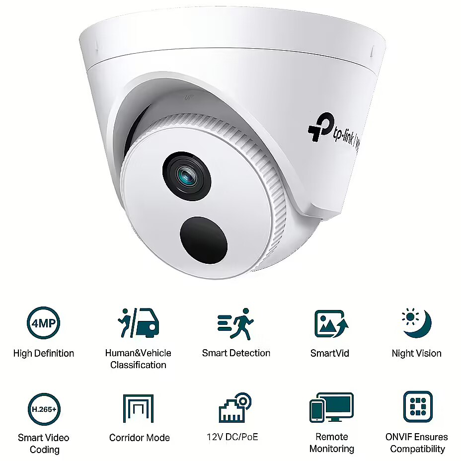 LongDesc - Security NeverShuts Down4MP IR Turret Network CameraLooking for a higher resolution? It's right here.4MP Super-High DefinitionThe VIGI C440I camera comes with 4MP—more than enough pixels to pick up some of the more discrete details.Human & Vehicle ClassificationIntegrated AI chips support advanced algorithms to distinguish humans and vehicles from other objects. You can flexibly customize alarm rules to match your monitoring needs and receive more accurate event notifications.We keep an eye on your business.Smart DetectionBacked by AI algorithms, the VIGI camera offers more smart detection. You will receive notifications when someone crosses a boundary, enters an area you've set, obstructs the camera, or removes/abandons objects.Never miss a detail.SmartVid-Smart Video EnhancementVIGI’s professional technologies process videos to greatly improve their quality that is vital to your monitoring, including Smart IR, WDR, 3D DNR, and Night Vision.More compression. More savings. Same quality.Without using any extra bandwidth, your cameras transmit compressed crystal-clear video to save disk space, ease network loads, and reduce monitoring costs without sacrificing image quality.Corridor ModeRotate the live image and lens 90° clockwise simultaneously. This way, your image aspect ratio changes from 16:9 to 9:16, helping you monitor long and narrow areas and providing a more natural viewing experience.Discover the best way to power your camera.PoE/12V DCTwo power supply ways not only give you more convenience but also make your wiring remarkably easy.Choose the right lens for your security.2.8/4 mm LensWhether you need a wide angle lens to cover enclosed spaces like elevators or a higher millimeter lens for longer distances in open spaces like parking lots, C440I comes with two different lens versions to better suit your security needs.Flexible InstallationEasily route your camera’s cable into a dropped ceiling or avoid drilling by slotting it through the camera’s side outletFlexible ManagementTake full control over your security via four management methods: the web UI, NVR UI, VIGI app, and VIGI Security Manager.One system. Full security.Run your business with peace of mind.The VIGI professional surveillance system by TP-Link is dedicated to protecting the business you’ve worked hard to build — whenever, wherever. Our outstanding functions, reliable quality guarantees, and simplified installation work together to ensure your business stays safe and sound.