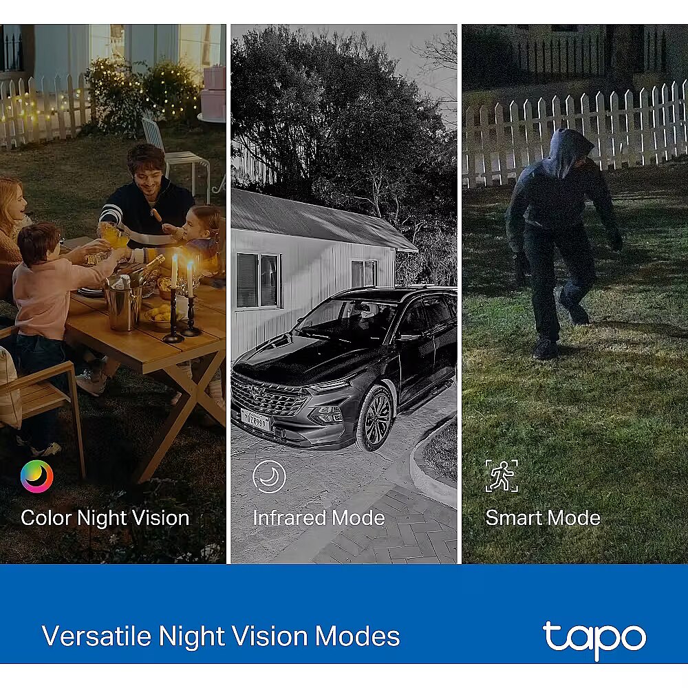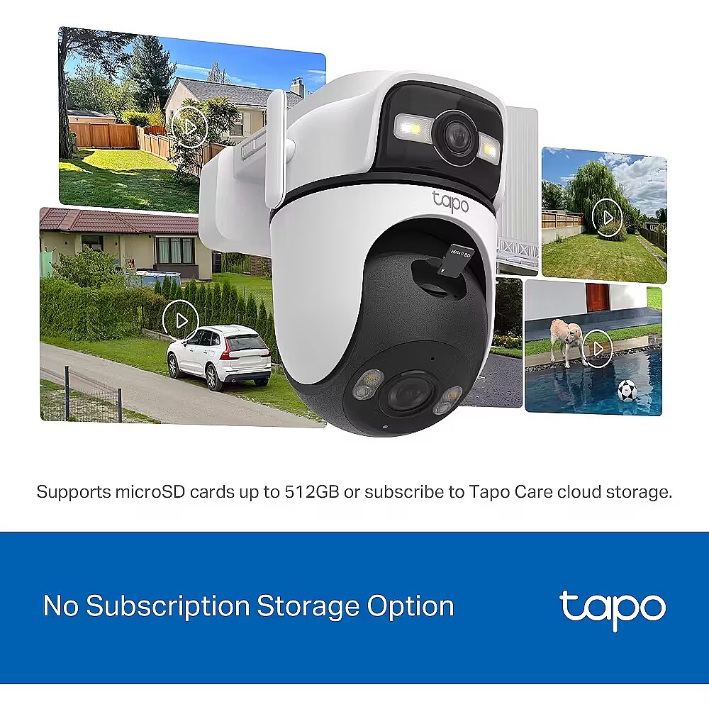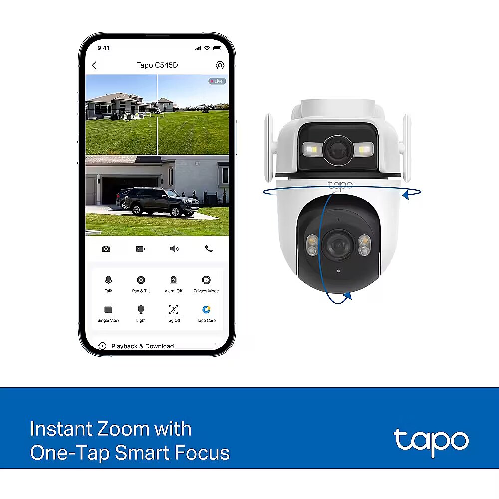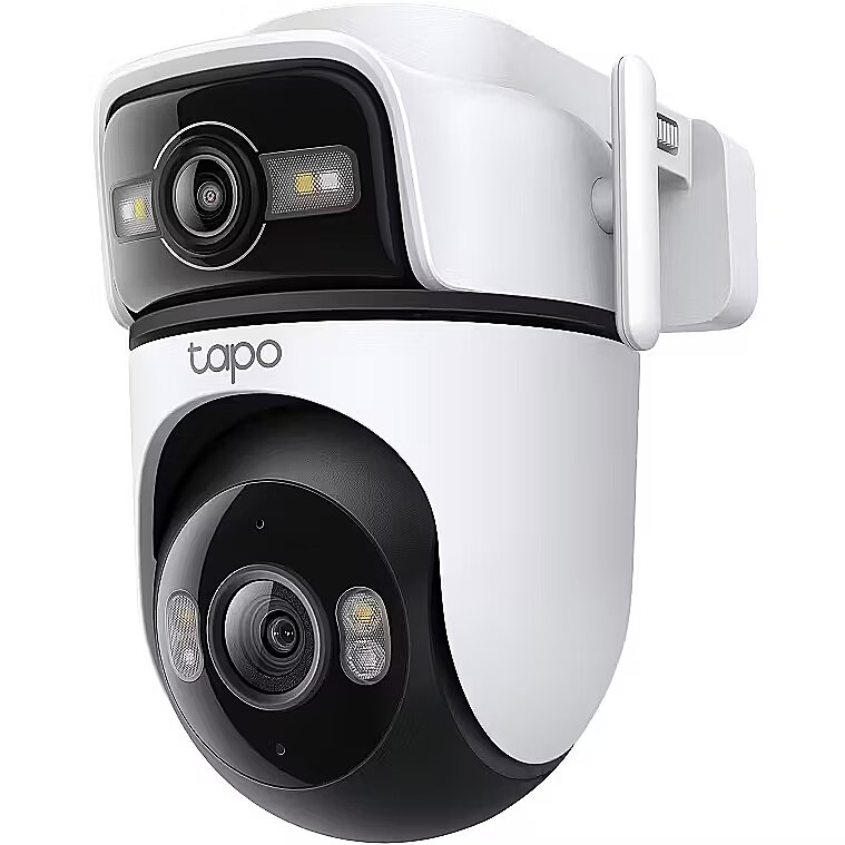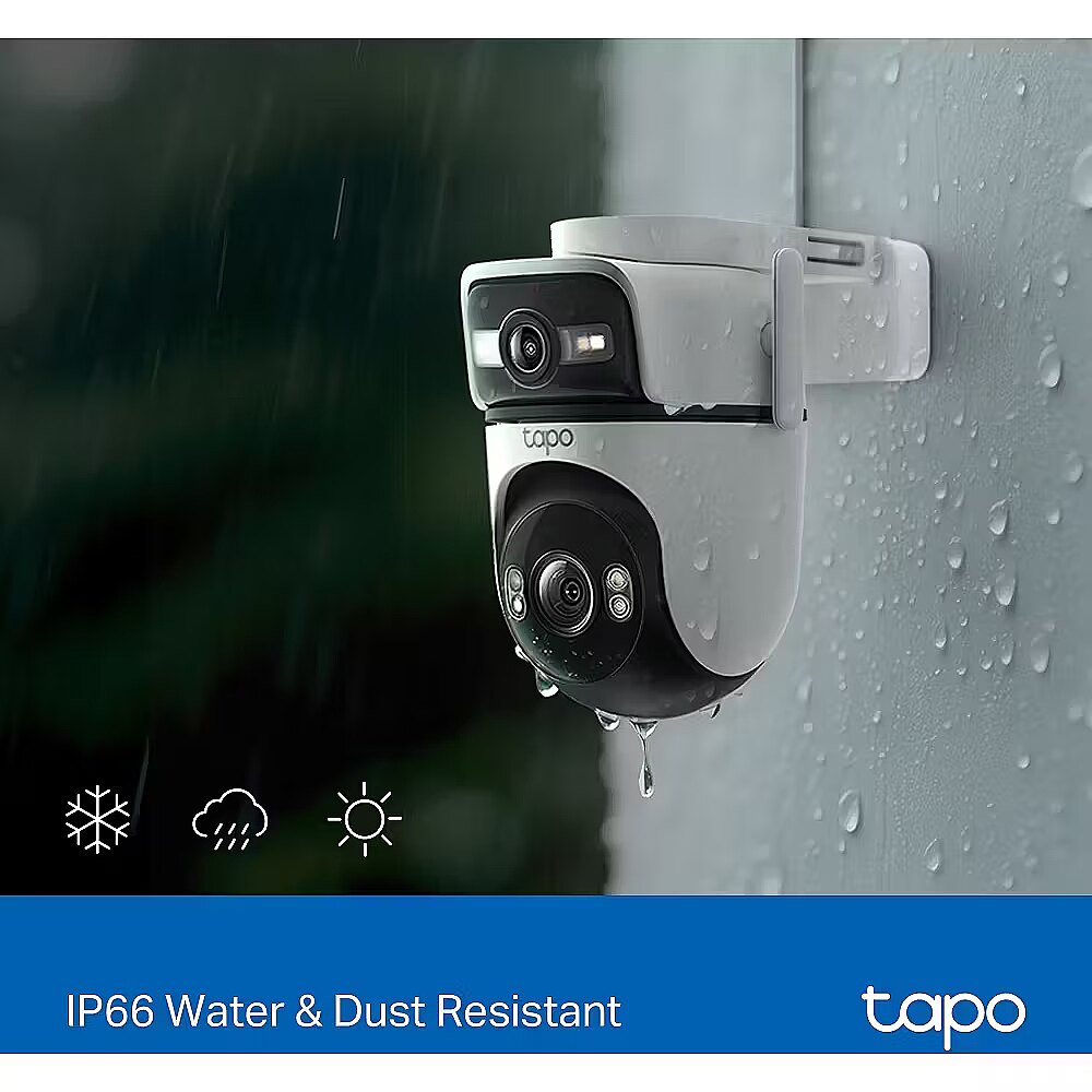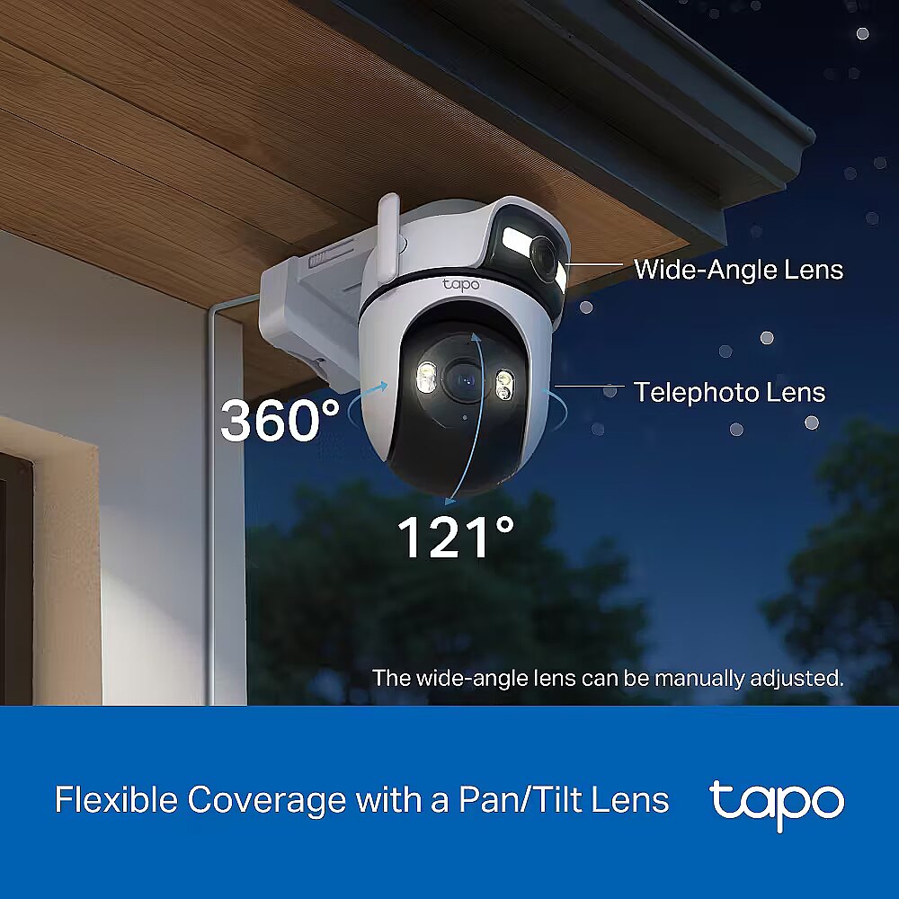 LongDesc - Wide View, Sharp Zoom, Full ProtectionOutdoor Dual Lens Pan/Tilt Security CameraPan, Tilt, and Capture It AllThe top wide-angle lens is fixed in place but supports manual Pan (270°) and Tilt (-30° to -10°) adjustment for the best viewing angle. The bottom telephoto lens features automatic pan and tilt to follow motion or shift focus between different areas as needed.Synchronised Smart TrackingThe two cameras dynamically work together to seamlessly follow movement–when the fixed lens detects events like motion, people, and pets, the pan/tilt lens will automatically pivot to focus on and track the moving object.Magnify Details with Telephoto LensThe 6mm telephoto lens delivers 3× clarity compared to standard lens and supports up to 10.8× digital zoom, ensuring every detail is clearly visible when you zoom in.Panoramic Coverage of Two Areas, SimultaneouslyMonitor two separate areas at the same time with just one powerful camera. Reduce blind spots and get a more thorough, comprehensive overview of your home.Instant Detail with One-Tap Smart FocusOne tap for instant clarity: select an area in the wide-angle view, and the pan/tilt camera will focus on it instantly.Smarter, More Accurate Notifications Powered by AIStay informed with smart AI detection that recognises and notifies you of people, pets, and vehicles – all without any subscription fees. Tailor your alerts by selecting which types of detection will trigger notifications.Smart & Versatile Night Vision ModesChoose from vibrant full-colour with spotlights, discreet black-and-white infrared, or an automatic Smart Mode based on AI light detection for optimal clarity in any nighttime scenario.Reliable Connectivity with Ethernet SupportEnsure a more stable and consistent connection for your camera with Ethernet support. Ideal for areas with weak Wi-Fi, an Ethernet connection guarantees smooth live streaming and faster data transmission.Patrol ModeSet the camera to automatically move between up to 8 preset viewing points at set times.Engineered for Weather ResilienceDelivers reliable surveillance through rain, snow, dust, and scorching heat. Monitor your property with confidence, no matter the weather.Pair with Smart AssistantsIncludes seamless integration with Amazon Alexa, Google Assistant, and Samsung SmartThings. View live streams on your Echo Show or Chromecast.Two-Way AudioBuilt-in premium microphone and speakers ensure you can hear and be heard with exceptional clarity.Adaptable Installation OptionsTapo C545D can be securely mounted on a wall, affixed to the celling, or even held by a rod - designed to withstand the elements and deliver dependable monitoring across diverse outdoor settings.