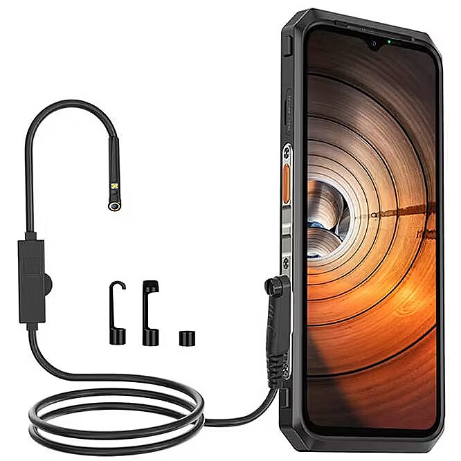 Description - Endoscopic camera for Ulefone EC02 Waterproof to IP67 Dual camera 7 LEDs with adjustable illumination HD 720P recording resolution 2M rigid cable Three functional attachments - hook, magnet and protective case Compatible with uSmart connector Compatible with uSmart connector The endoscope is compatible with devices with uSmart connector, such as the Power Armor 19 series, Power Armor 18 series, Power Armor 16 Pro series, Power Armor 13 series and Armor 9/9E series. The device is easy to install and works seamlessly with the smartphone. Two built-in camera lenses The endoscope has two lenses, one centrally on the front and the other on the side, to help view things from different directions or angles. Compared to the previous endoscope with a single camera, the images are now clearer without additional tools. To switch between lenses, press the function button. Stiffened 2M cable The semi-rigid 2 metre cable allows you to reach deep into pipes, sewers and more. It can be bent to accommodate inspection of kitchen plumbing, pipework, air conditioner, car engine or other hard-to-reach areas. 7 illuminating LEDs Inside the front and side camera of the endoscope, there are LEDs whose brightness can be adjusted via a rotating wheel on the cable. The high brightness of the 7 LEDs enables clear photography in the dark. Waterproof to IP67 The cable and camera are waterproof according to the IP67 standard. So you can easily place the endoscope under water, in places such as a drain pipe, sewer, toilet etc. Useful in many situations The endoscope is a practical inspection tool essential for inspection or maintenance work, widely used for checking the patency of pipes, air-conditioning, viewing small openings, checking household appliances and other jobs. Multifunctional tips The endoscope is equipped with accessories* that increase its functionality: hook (allows you to catch objects such as keys, rings or jewellery), magnet (attracts small metal objects), protective case (protects the endoscope's camera lens). *The kit includes small accessories that should only be used by children under parental supervision, as there is a risk of swallowing.
