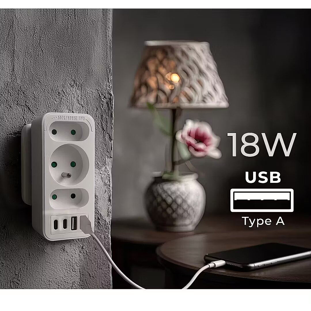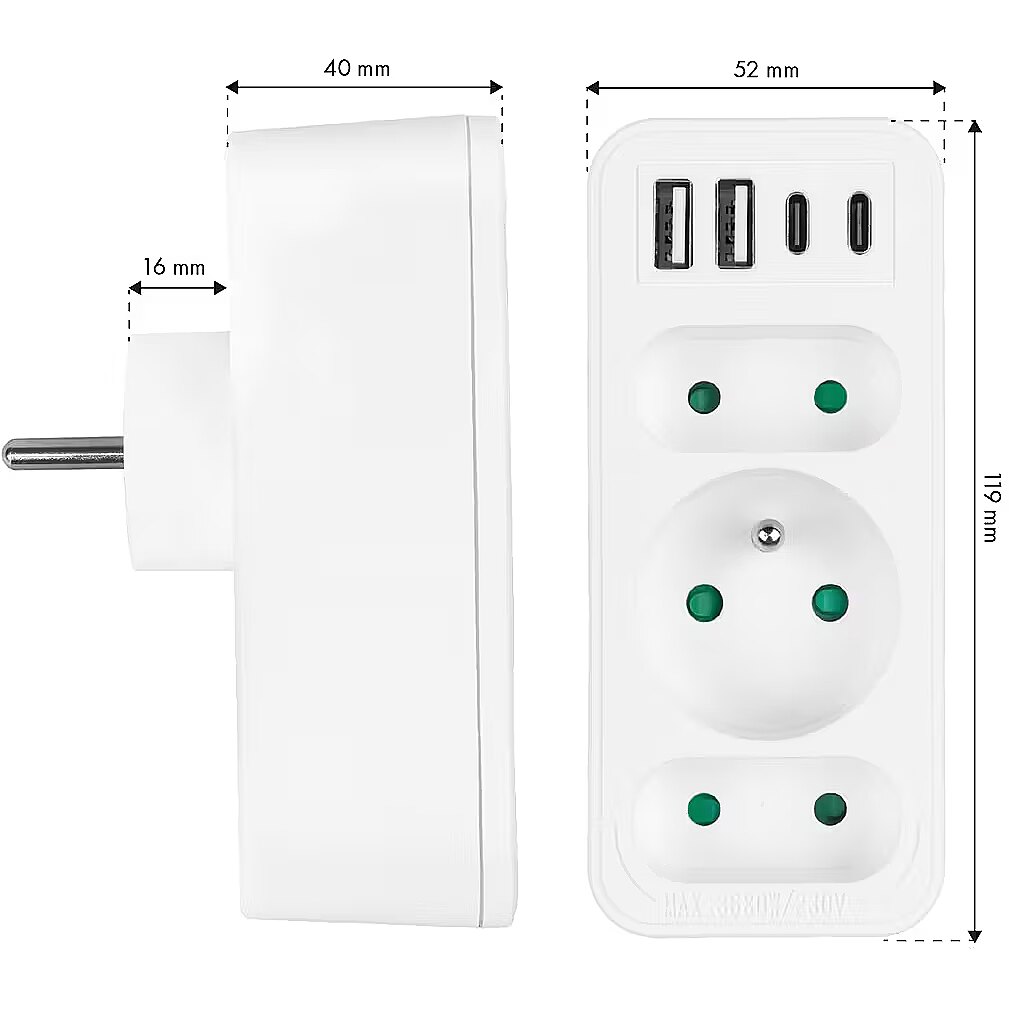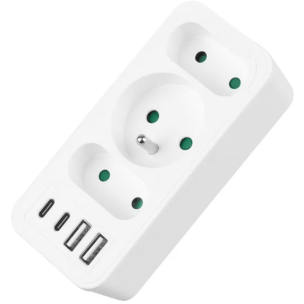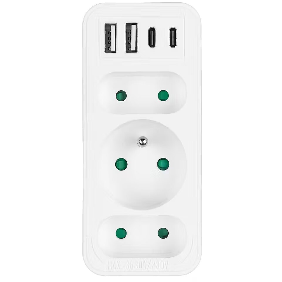 Other features - Color: white Housing material: plastic Power source (voltage): 110-240 V AC / 50/60 Hz Type of sockets: 2x flat socket (type C), 1x round socket with grounding pin (type E) Maximum load: C sockets - max. current 6A 1380 W; E socket - max. current 16A 3680W USB port type: 2x USB-A, 2x USB-C USB-A output power: 5V/3A, 9V/2A, 12V/1.5A, max. 18 W (using one output) USB-C output power: 5V/3A, 9V/2.22A, 12V/1.67A, max. 20 W (using one output) Child safety: yes - Protection rating: IP20