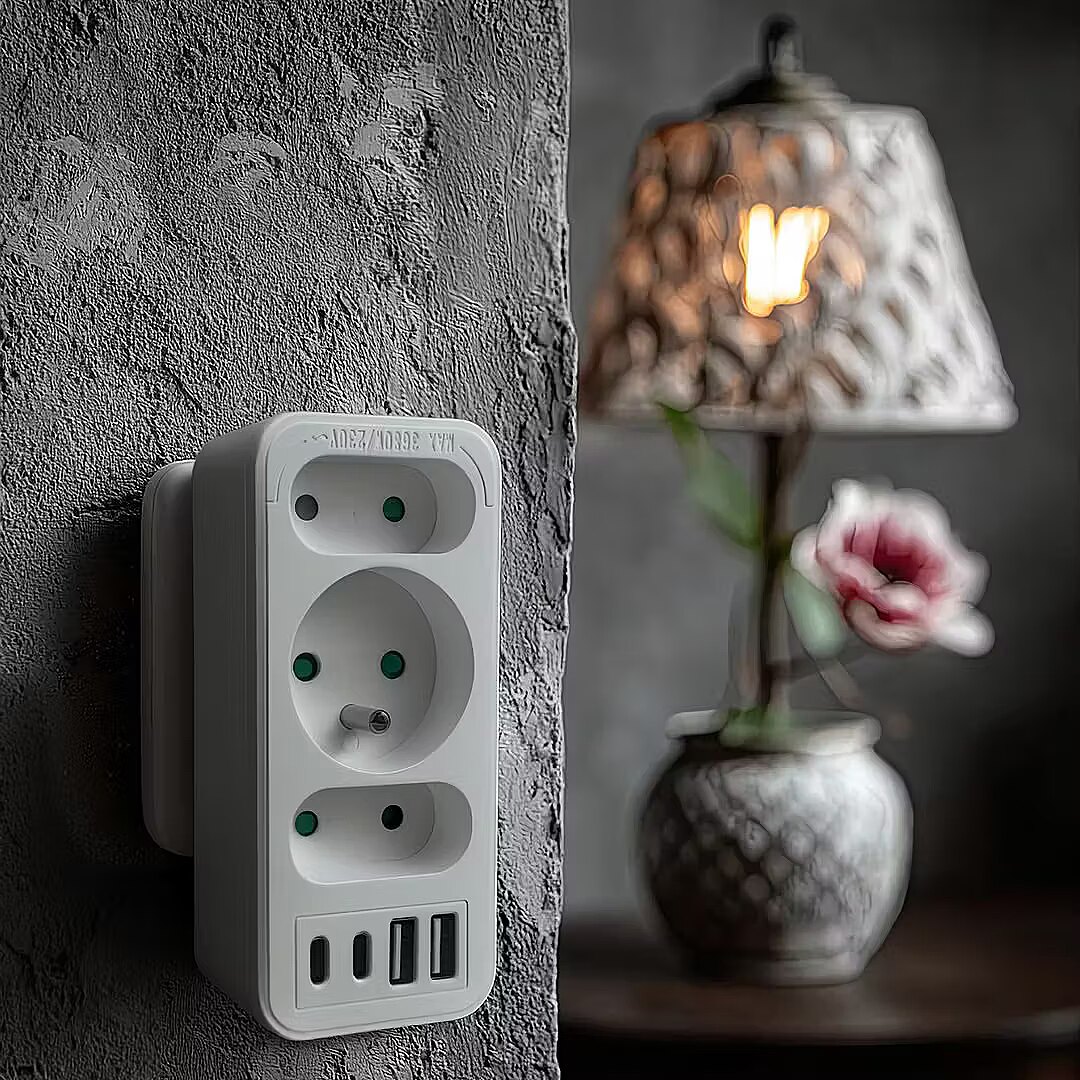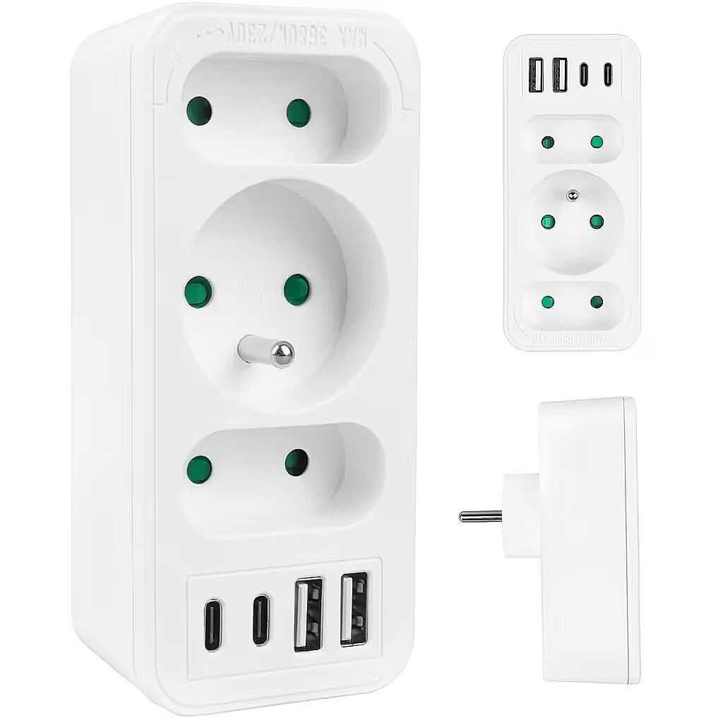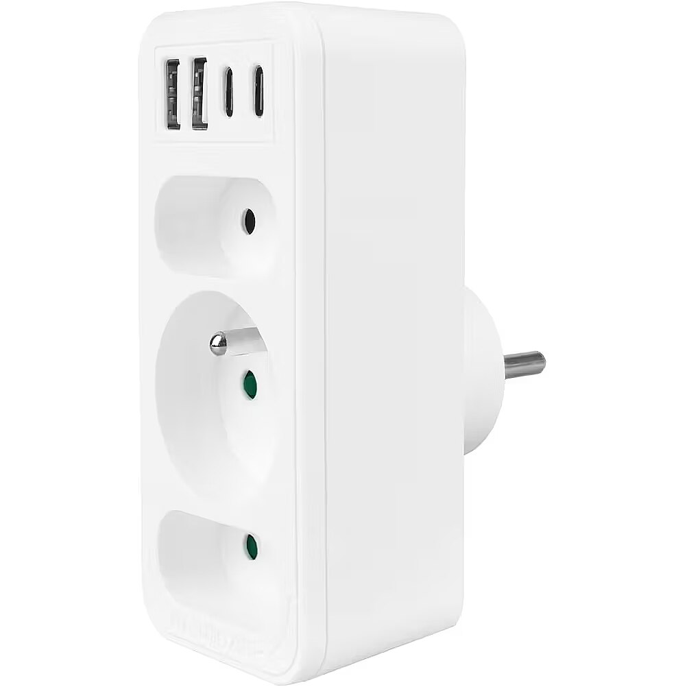 Other features - Color: white Housing material: plastic Power source (voltage): 110-240 V AC / 50/60 Hz Type of sockets: 2x flat socket (type C), 1x round socket with grounding pin (type E) Maximum load: C sockets - max. current 6A 1380 W; E socket - max. current 16A 3680W USB port type: 2x USB-A, 2x USB-C USB-A output power: 5V/3A, 9V/2A, 12V/1.5A, max. 18 W (using one output) USB-C output power: 5V/3A, 9V/2.22A, 12V/1.67A, max. 20 W (using one output) Child safety: yes - Protection rating: IP20