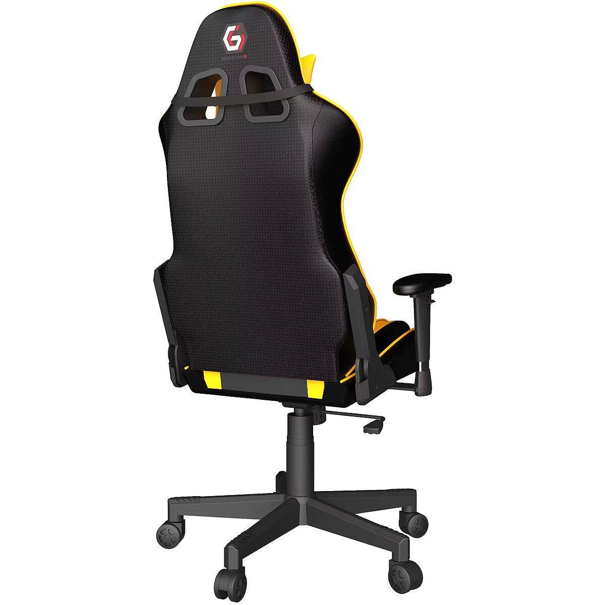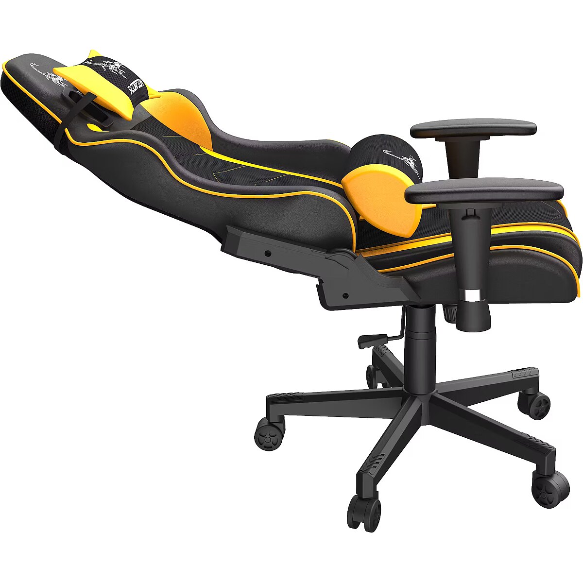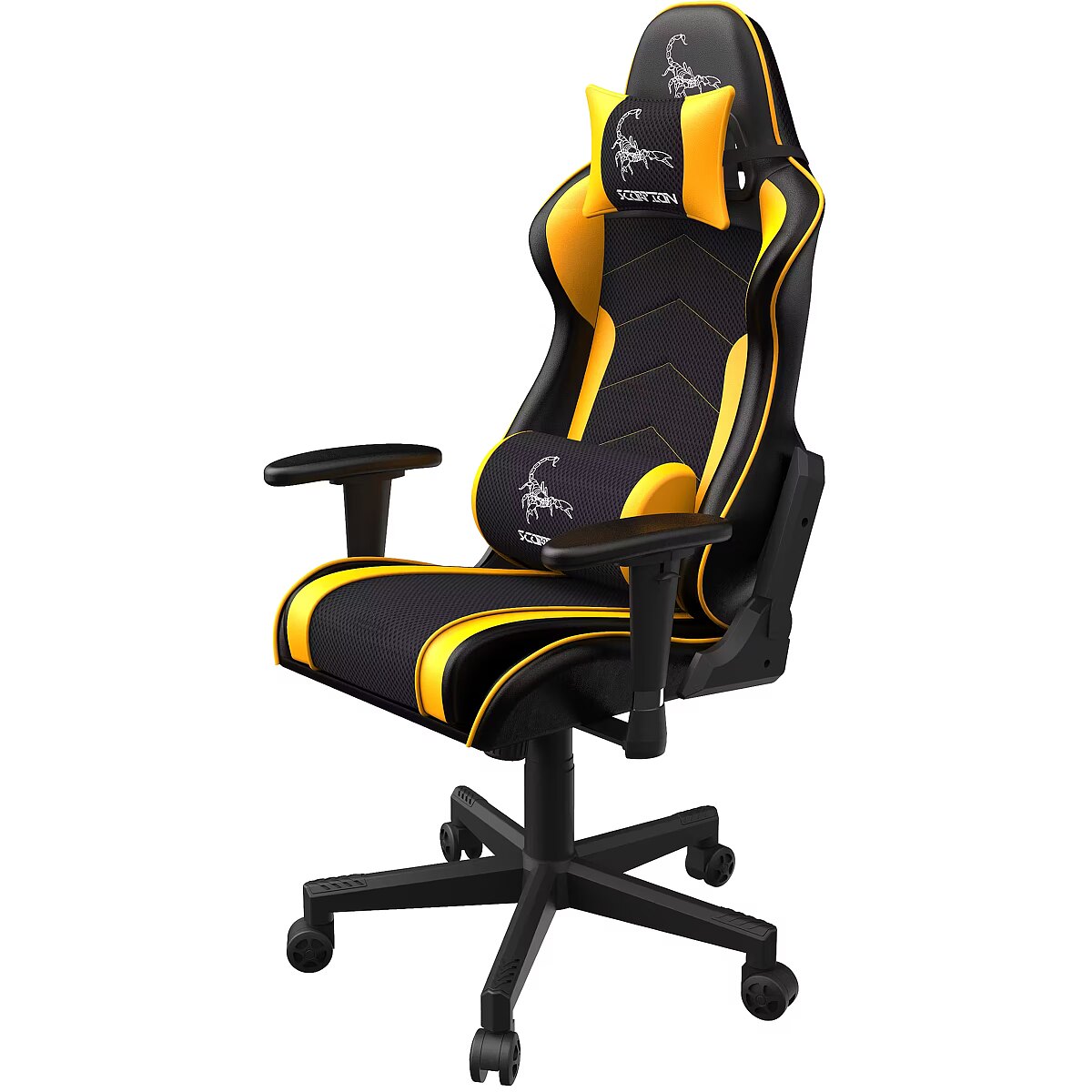 Description - Krzesło gamingowe Scorpion czarno-żółte Krzesło komputerowe z PVC Mocna nylonowa podstawa, gąbka w oparciu i zagłówku oraz formowana pianka wewnątrz siedziska Wentylowane siateczkowe siedzisko i przód Regulowany podłokietnik 2D Mechanizm uchylny, podnośnik gazowy i koła PU