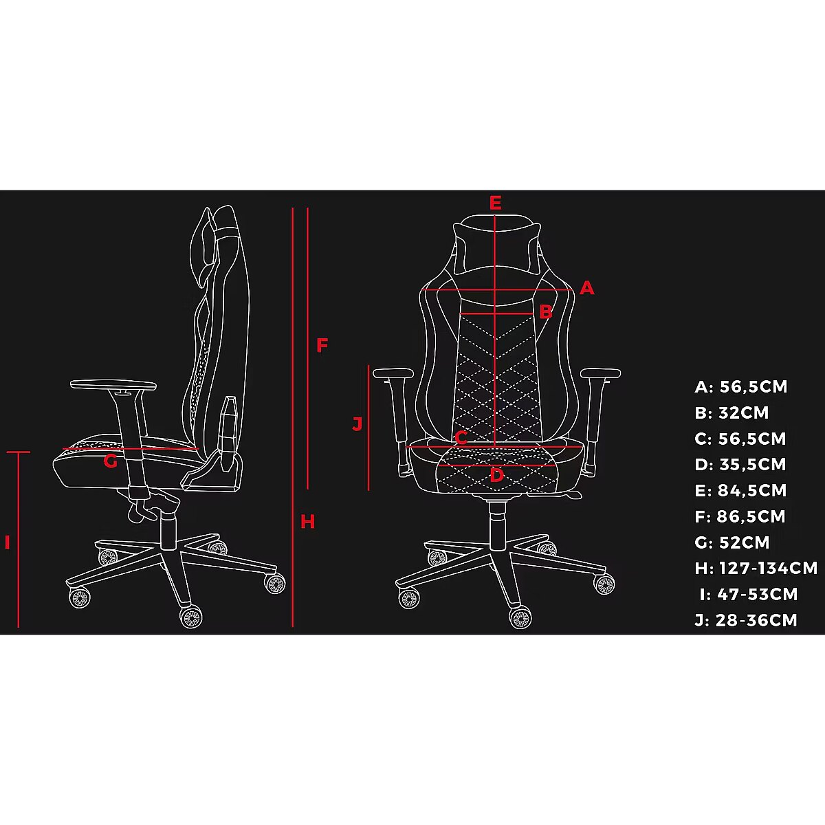 Desc - Krāsa: Melna, Materiāls: Mākslīgā āda / audums, Konstrukcijas materiāls: Nav zināms, Regulējami roku balsti: Ir, Regulējama atzveltne: Ir, Regulējams augstums: Ir, Regulējams slīpums: Ir, Plecu platums (mm): Nav zināms, Vidukļa platums (mm): Nav zināms, Sēdekļa platums (mm): 560, Atzveltnes augstums (mm): 845, Sēdekļa augstums (mm): 470 - 530, Kopējais augstums (ieskaitot riteņus) (mm): Nav zināms, Maksimālais lietotāja svars (kg): 150, Garantija: 2 gadi