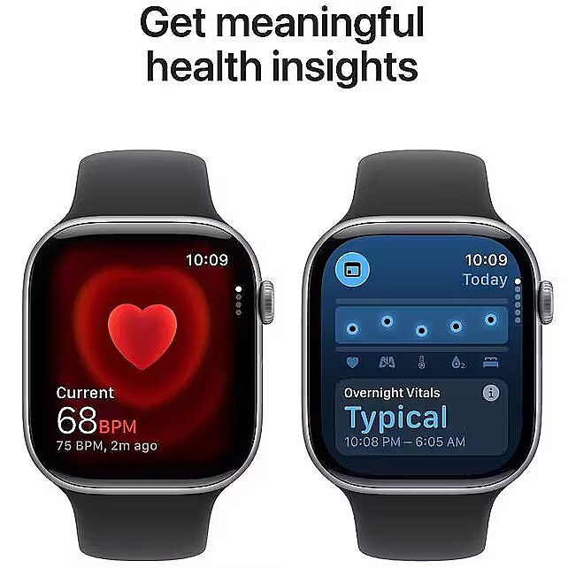 Hypertension, or high blood pressure, impacts over 1.3 billion adults worldwide and is a leading cause of a heart attack, stroke, and kidney disease. The condition frequently goes undiagnosed because it often has no symptoms — and even during a doctor’s visit, with a single measurement it can be easily missed. Receive hypertension notifications just by wearing your watch. Series 11 can notify you if it identifies patterns of hypertension. How? The optical sensor provides data to an algorithm that can detect potential hypertension by analyzing how your blood vessels respond to beats of the heart over 30-day periods. Groundbreaking insights. Grounded in science. We developed hypertension notifications using advanced machine learning methods and a series of studies totaling over 100,000 participants. The feature was then validated in a clinical study. Set up a blood pressure log. If you receive a hypertension notification and have access to a blood pressure cuff, you can track your blood pressure in the Health app on iPhone to create a report that will lead to more meaningful conversations with your healthcare provider. More features to empower your health. Wake up to your sleep score. Sleep quality is influenced by factors such as sleep duration, bedtime consistency, how often you wake up, and time spent in each sleep stage. Sleep score analyzes these factors every night and provides a classification and a score. You’ll see how the score is calculated, so you can understand the quality of your sleep and learn how to make it more restorative. Wake up to your sleep score. Sleep quality is influenced by factors such as sleep duration, bedtime consistency, how often you wake up, and time spent in each sleep stage. Sleep score analyzes these factors every night and provides a classification and a score. You’ll see how the score is calculated, so you can understand the quality of your sleep and learn how to make it more restorative. The Vitals app. Your daily health status, stat. Quickly see your overnight health data — including heart rate, respiratory rate, wrist temperature, and sleep duration — and get notified if multiple metrics are ever outside your typical range. Follow your heart on the ECG app. With Series 11 you can check for signs of atrial fibrillation, or AFib, right from your wrist by using the ECG app to generate a single-lead electrocardiogram. Stay on the pulse with the Heart Rate app. You can check your heart rate at any time — and get automatic notifications for a high or low heart rate or an irregular rhythm. Cycle Tracking keeps you in the loop. Since cycles vary, the best way to understand what’s normal for you is by tracking your menstrual cycle. You can use Cycle Tracking to log your period, record symptoms, and get predictions about your next period or fertile window. It can also notify you if a cycle deviation is detected. Get retrospective ovulation estimates. Series 11 has advanced sensors that track your wrist temperature while you sleep. The Cycle Tracking app uses this data to provide a retrospective estimate of when you likely ovulated, which can be helpful for family planning. Measure your blood oxygen. It’s a breathtaking innovation. The Health app on iPhone uses data from the sensor in Apple Watch to enable you to take on-demand readings of your blood oxygen as well as background readings, day and night. Fitness Better by every measure.