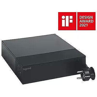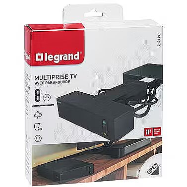 Description - Protective TV extension cable 4x2P+Z + 4x2P 2m black Multi-outlet extension cable with 4 2P+E 16A sockets, including 1 French-Belgian standard flush-mounted socket and 4 2P 6A sockets - Total power 3680W, 16A/ 230V, circuit breaker, surge protection. Designed for perfect integration with RTV equipment. Signalling: green light, multi-socket site is protected, light off, surge protection not working. One active emergency socket (computer charging, portable video games, etc.) Cable bundling option; 7 sockets hidden under aluminium cover for cable storage in TV corner. One flush-mounted socket available