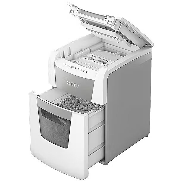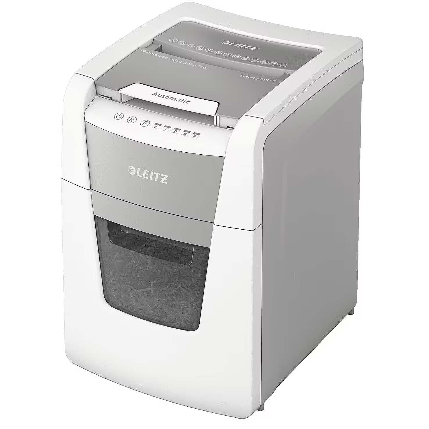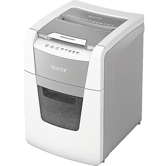 LongDesc - Fully automatic paper shredder from Leitz with unique clean emptying feature. So intelligent it quietly works on its own, just insert your stack of papers (incl. staples & paper clips), close the lid and get on with your day. Ideal for small office use. Higher security and excellent performance with this anti jam, quiet and long running (20 min) autofeed shredder. Automatically shred 100 sheets of A4 into security P5 (2x15mm) micro cut pieces in one go into the generous 34L bin. Simple operation using touch controls.