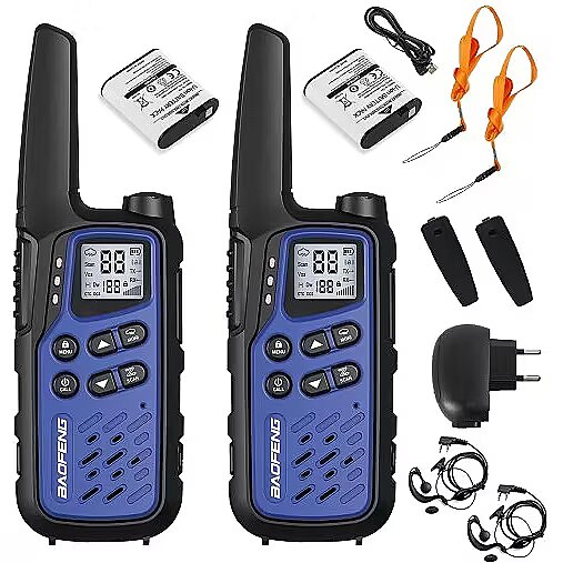 Pakendi sisu - Komplekti sisu - 2x Baofeng BF-T25 PMR raadiosaatjad, 2x 3,7 V 1400 mAh akud, 2x PTT-nupp, 1x vahelduvvooluadapter (EL) 230 V/USB, 1x USB-laadimiskaabel, 2x kaelarihmad