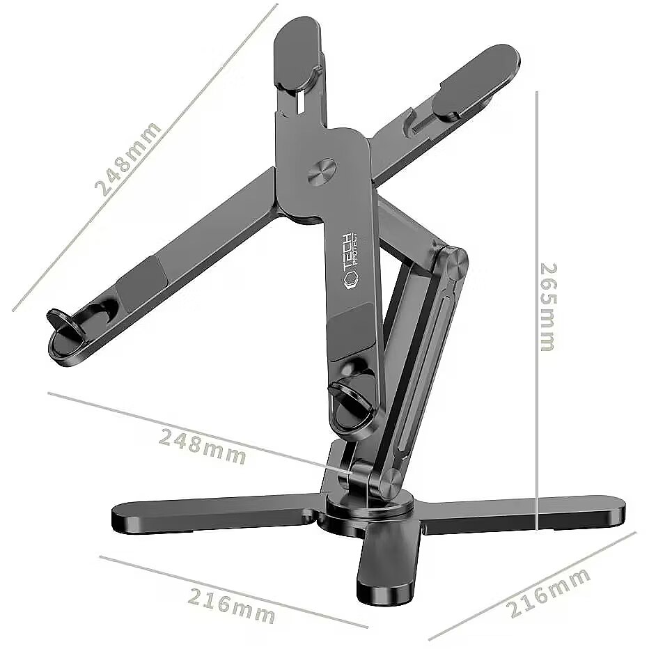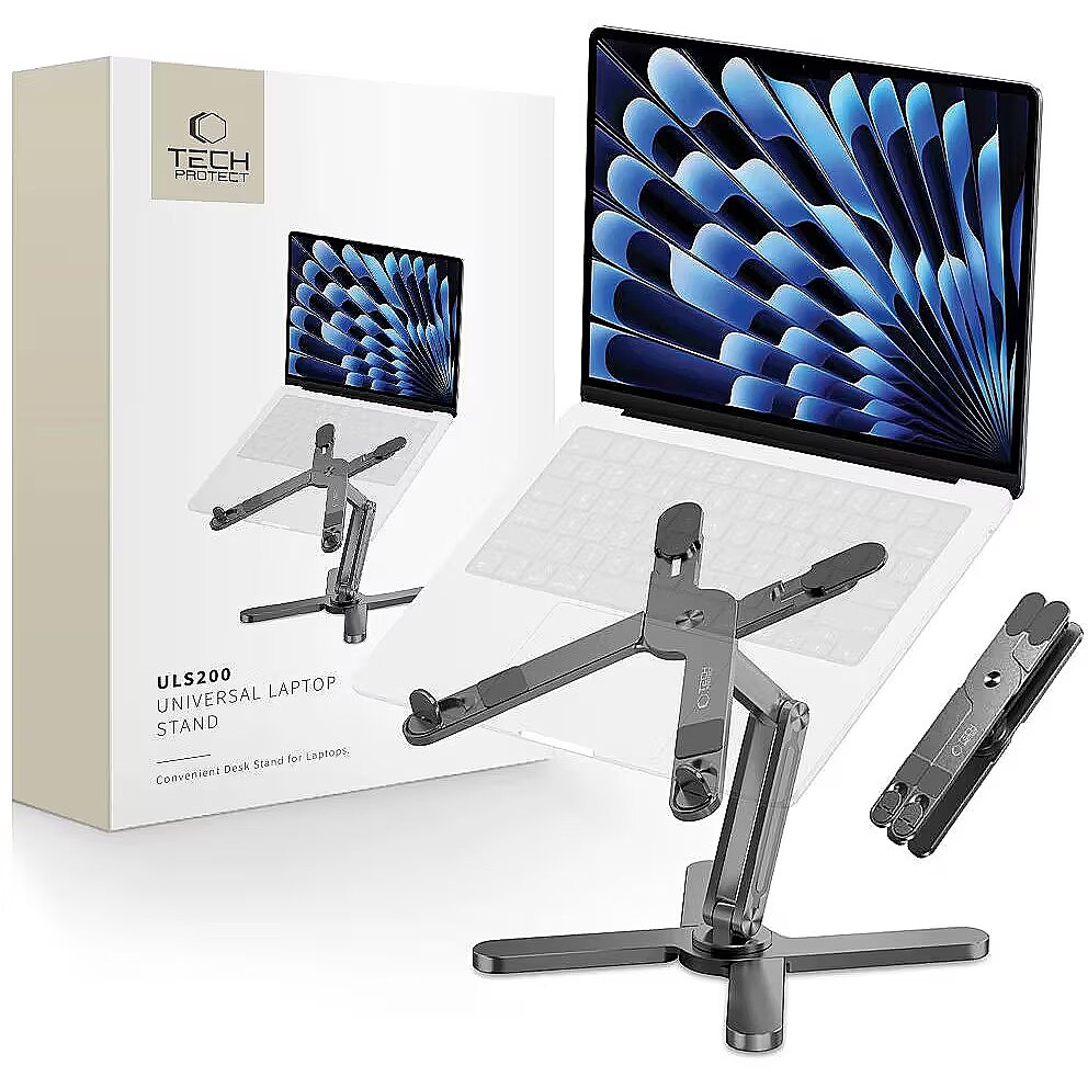 description_en - The Tech-Protect ULS200 stand is a modern, multifunctional desktop accessory designed to support up to 16" laptops. It is made from high quality aluminium for durability and stability. It has adjustable arms that can be adjusted to accommodate different device sizes and positions. Rubber pads on the ends of the arms protect the laptop from scratches and provide extra grip. The stand has a sturdy, stable base with three legs, ensuring it stays securely on any surface. It is sleek and minimalist, making it a perfect match for modern interior design. Foldable laptop stand Fully adjustable Elegant minimalist design Stable aluminium construction Compatible with devices up to 16 inches