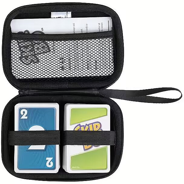 Description - Etui do kart Skip-Bo Jeśli lubisz Skip.Bo, pokochasz również tę torbę. W końcu jest w niej wystarczająco dużo miejsca na Twoje ukochane karty, a także instrukcje gry. Po prostu umieść wszystkie karty do gry w dwóch stosach, wsuń je pod gumki, wsuń instrukcję gry do siateczkowej kieszeni i gotowe. I możesz je zabrać wszędzie: do najbliższego pokoju dziecięcego, na kemping, na wakacje - wszędzie tam, gdzie dzieci lubią grać, dobrze się bawić i szukać emocji. Torba bezpiecznie przechowuje popularne karty i chroni je przed wodą, piaskiem i kurzem. Dzięki temu małe pociechy nie tylko będą się świetnie bawić, ale także nauczą się dbać o karty i schludnie je porządkować, dzięki czemu będą gotowe na kolejną zabawę w Skip.Bo. Poręczne etui na karty do gry Skip.Bo ma wewnętrzną siateczkową kieszeń na instrukcje gry i dwie kieszenie z gumkami do mocowania kart Skip.Bo. Torba jest wodoodporna i lekka, dzięki czemu karty do gry (brak w zestawie) można zabrać wszędzie i bezpiecznie przechowywać.